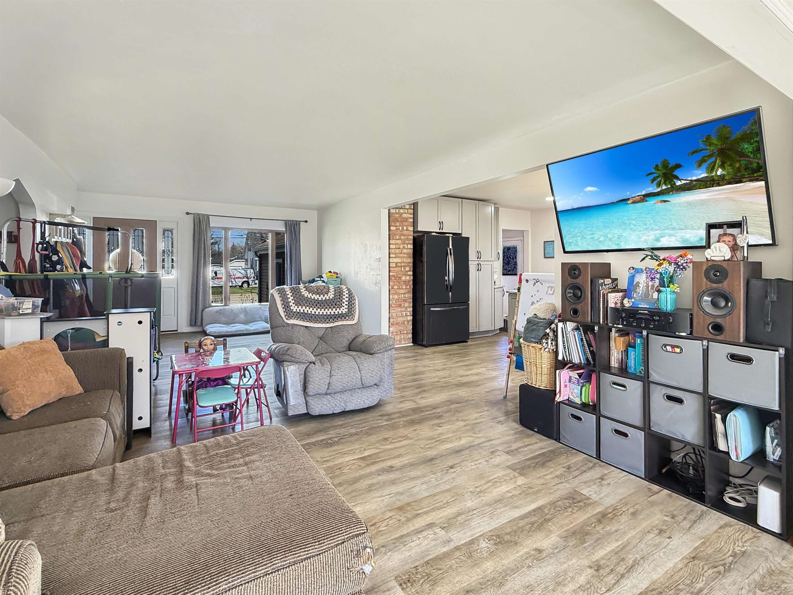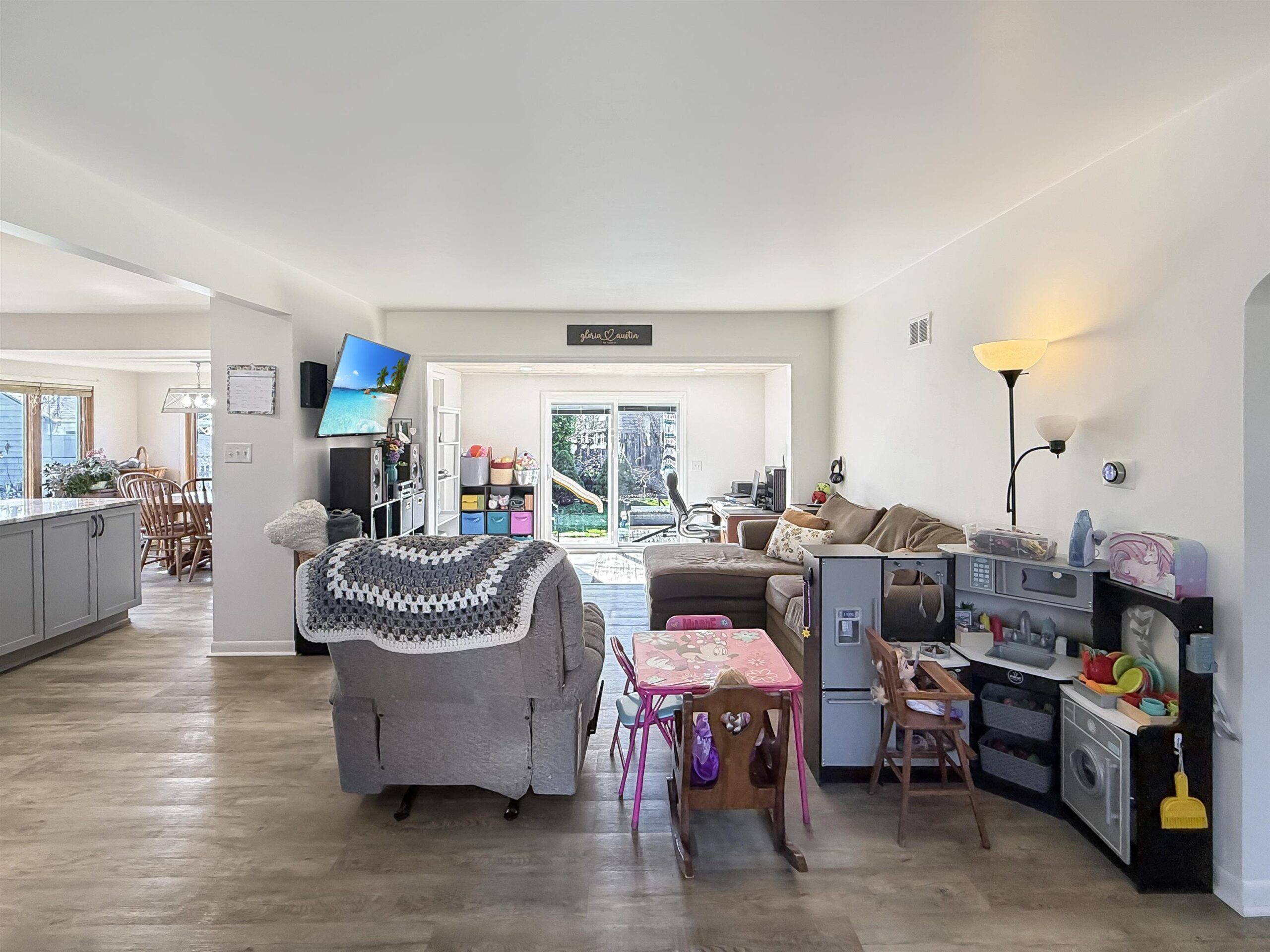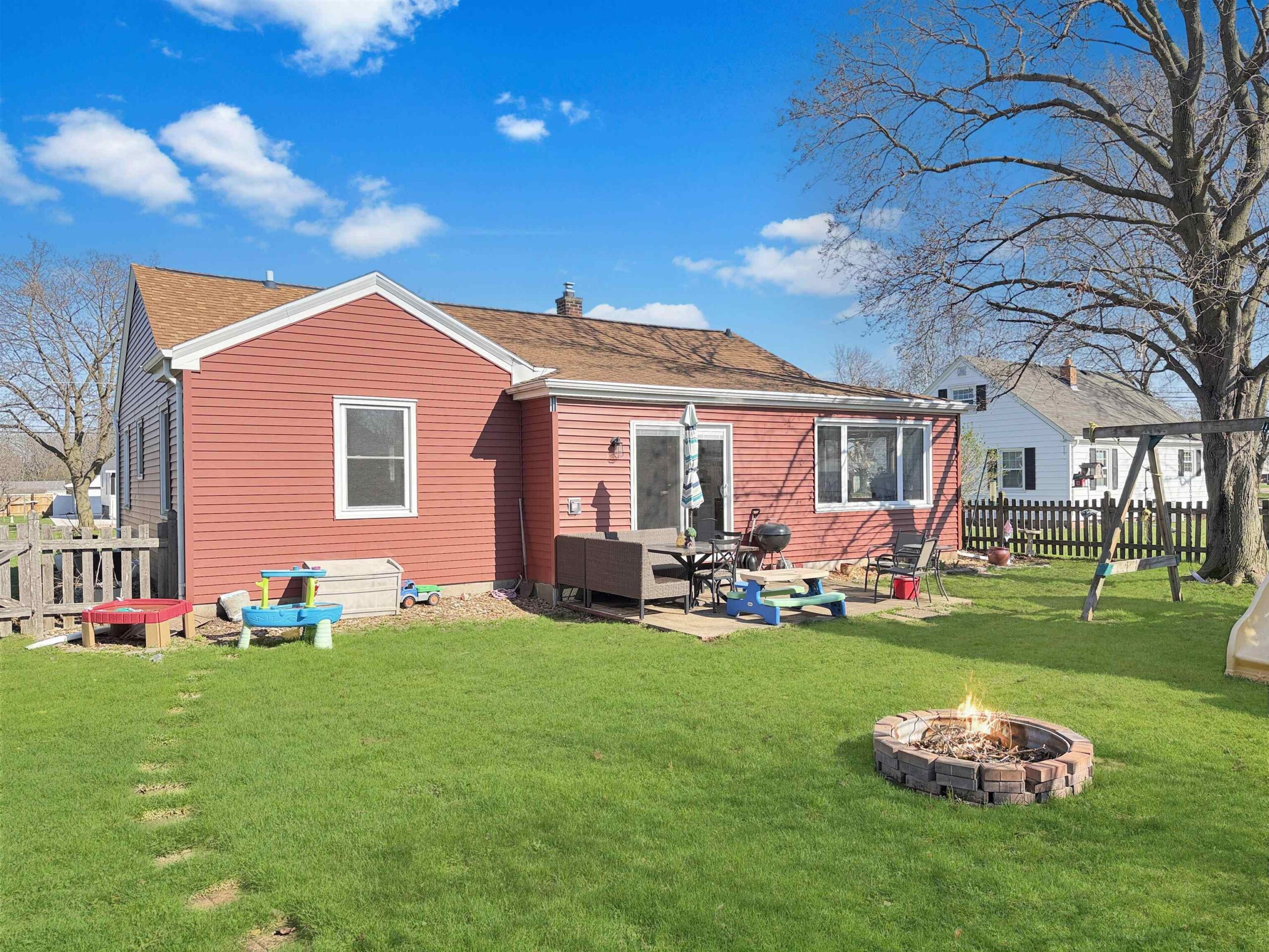 stovetop, oven, refrigerator, dishwasher, microwave, washer/dryer, outdoor playset, municipal garbage and recycle containers, window treatments