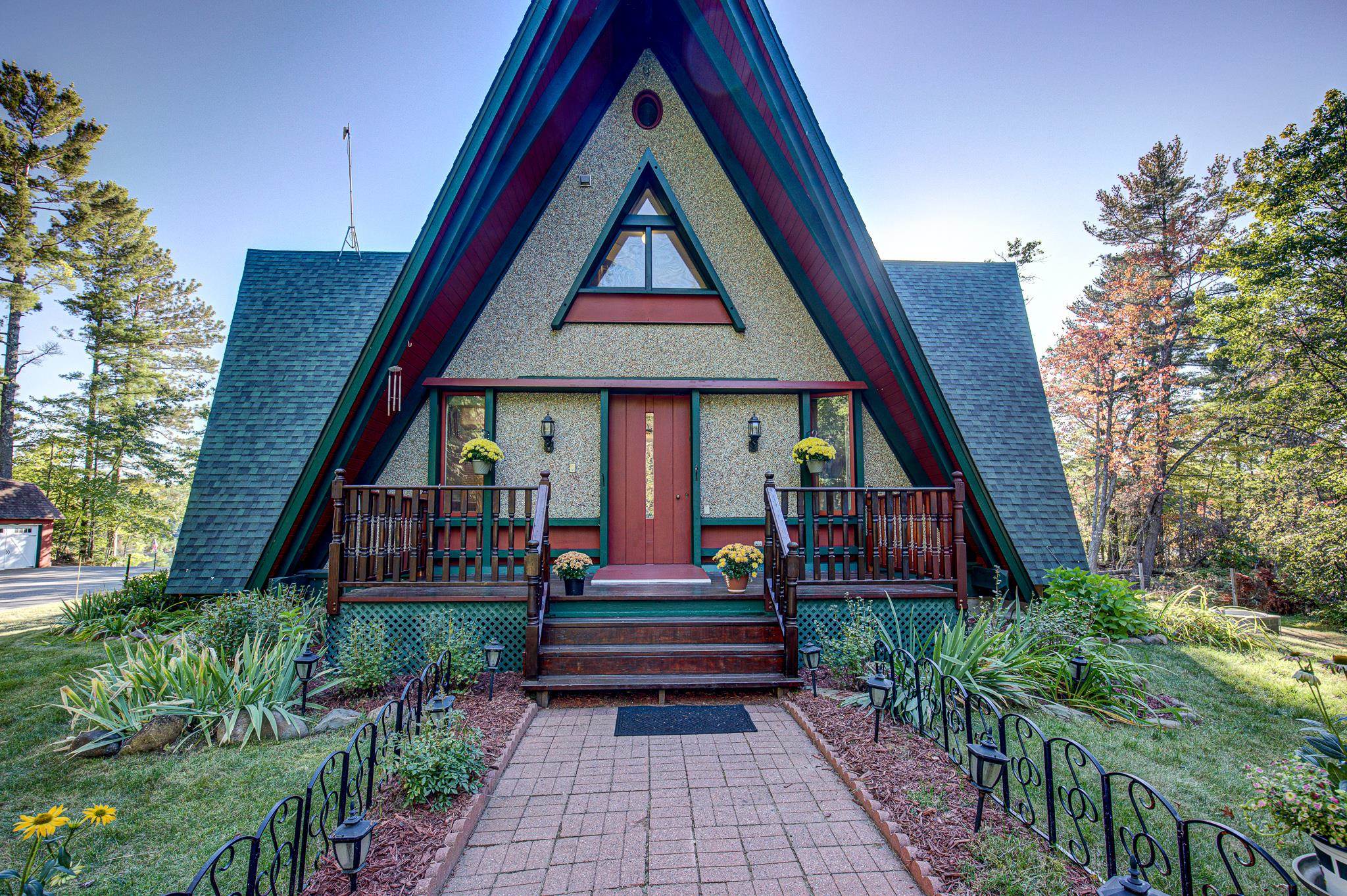 Discover your lakeside paradise with this breathtaking custom-built, double A-frame home on stunning Kildare Lake. This 1-of-a-kind retreat is the perfect blend of luxury and nature. From the eye-catching curved staircases to 2 cozy wood-burning fireplaces, every detail impresses. Relax on the expansive deck with jaw-dropping views or unwind in the private sauna. The main level offers a serene primary suite, a gourmet kitchen, and a half bath. Upstairs, two charming bedrooms and a full bath await. The walkout basement features 2 bedrooms, a hot tub, sauna, and a unique round fireplace, bringing lakeside living to new heights. Just steps from the water, this oasis includes an 8-car garage, private boat landing, and another 5-acre lake lot. Buyer to confirm measurements.