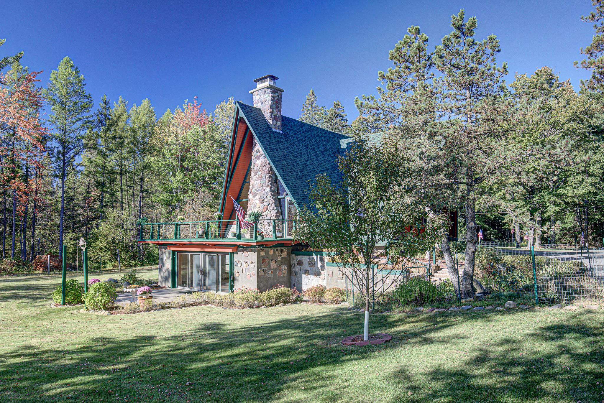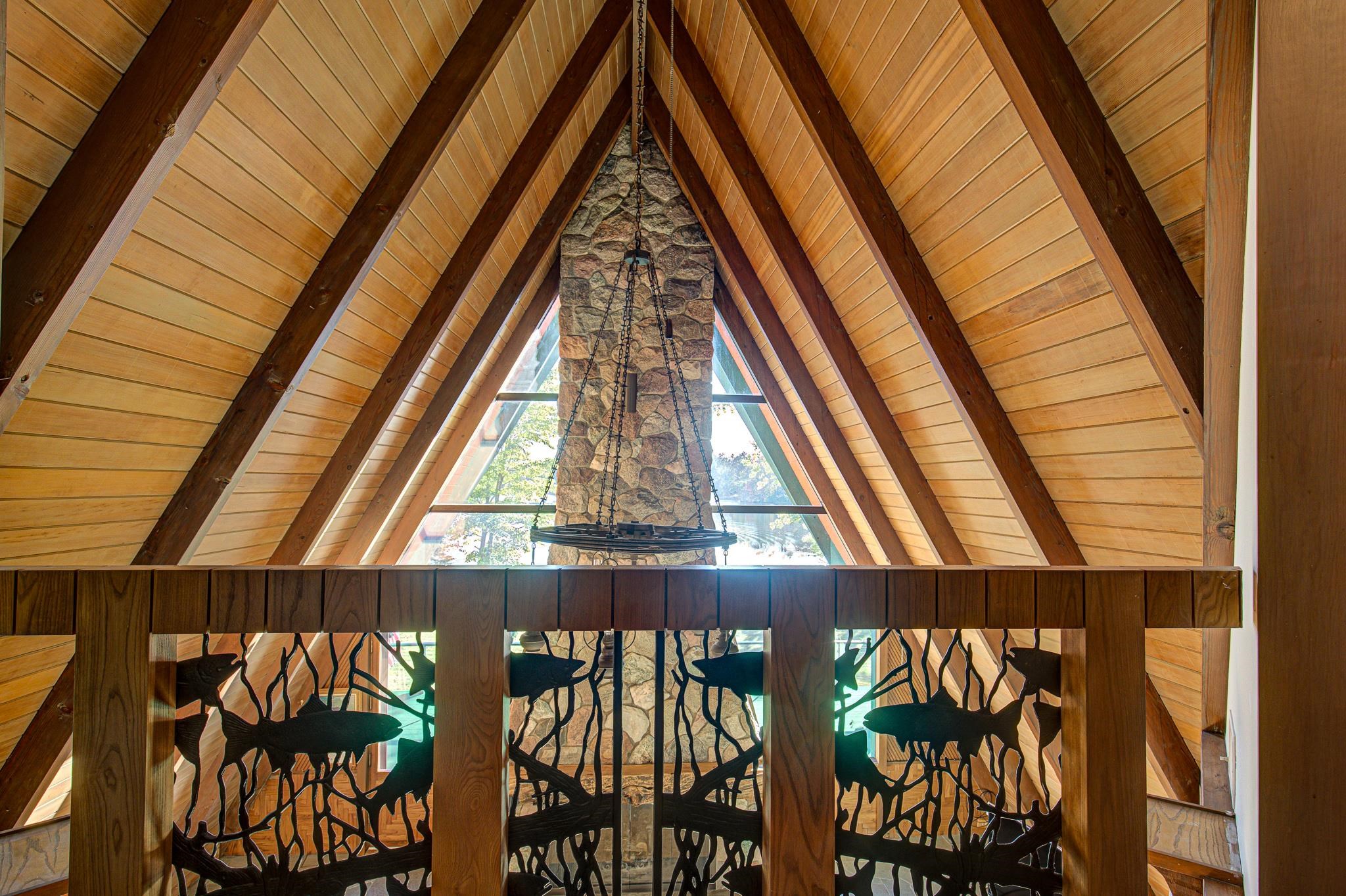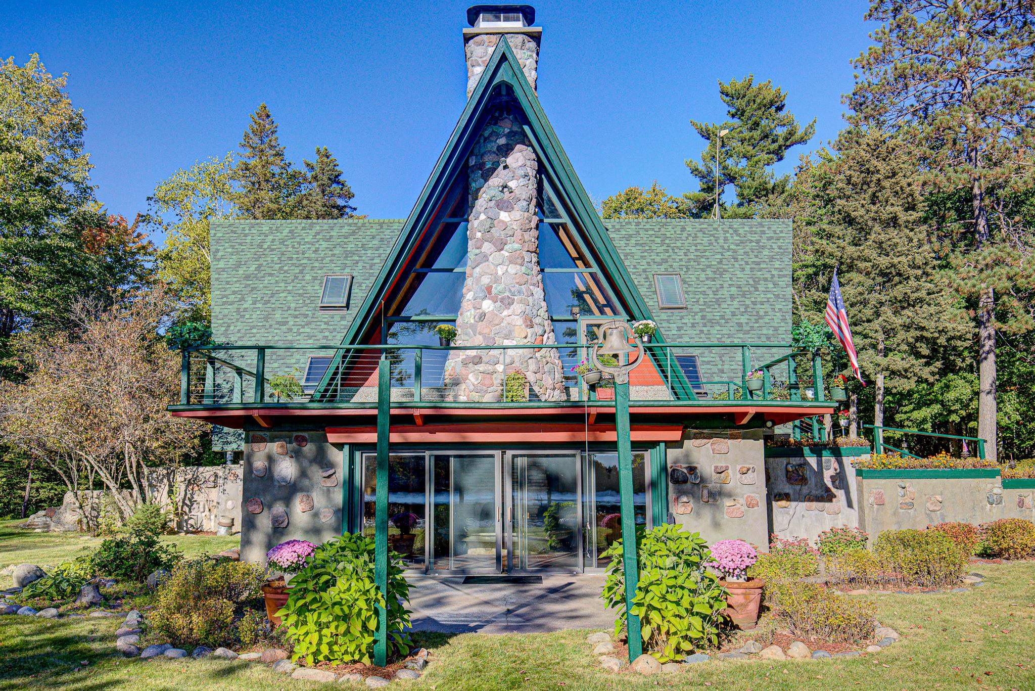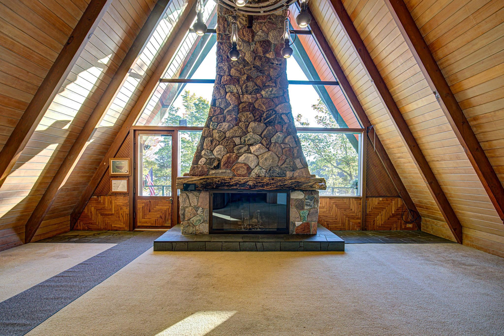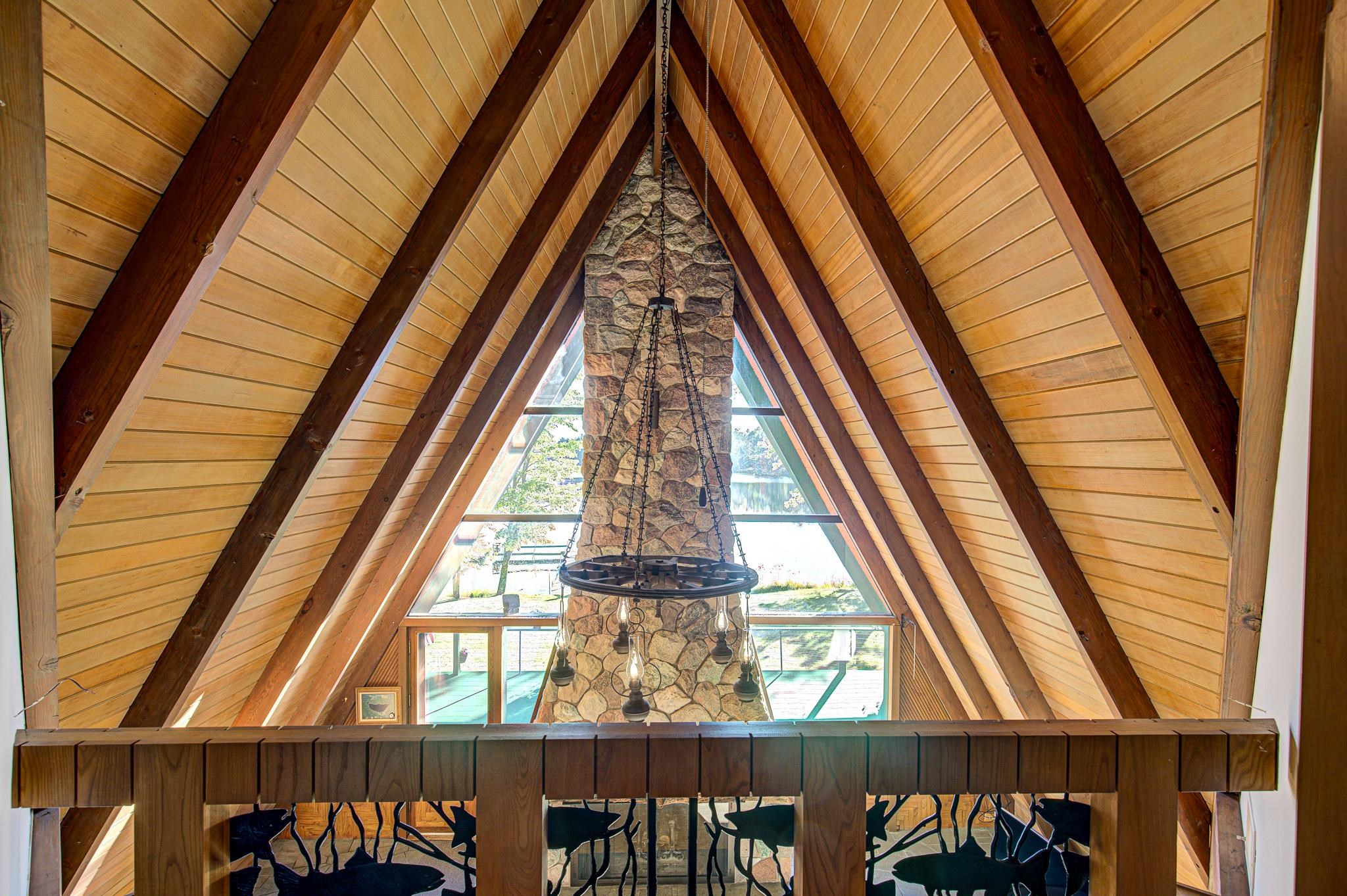 Discover your lakeside paradise with this breathtaking custom-built, double A-frame home on stunning Kildare Lake. This 1-of-a-kind retreat is the perfect blend of luxury and nature. From the eye-catching curved staircases to 2 cozy wood-burning fireplaces, every detail impresses. Relax on the expansive deck with jaw-dropping views or unwind in the private sauna. The main level offers a serene primary suite, a gourmet kitchen, and a half bath. Upstairs, two charming bedrooms and a full bath await. The walkout basement features 2 bedrooms, a hot tub, sauna, and a unique round fireplace, bringing lakeside living to new heights. Just steps from the water, this oasis includes an 8-car garage, private boat landing, and another 5-acre lake lot. Buyer to confirm measurements.