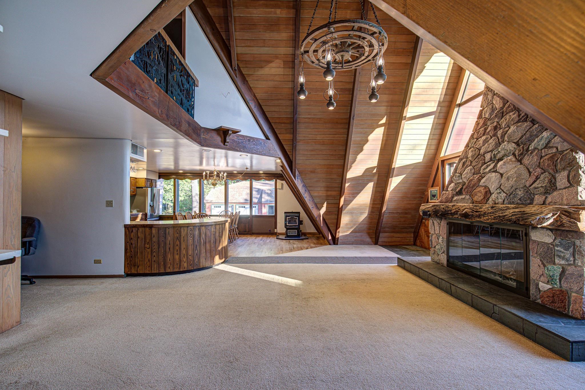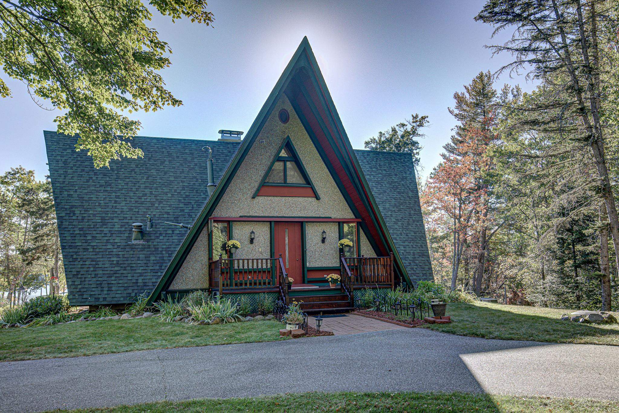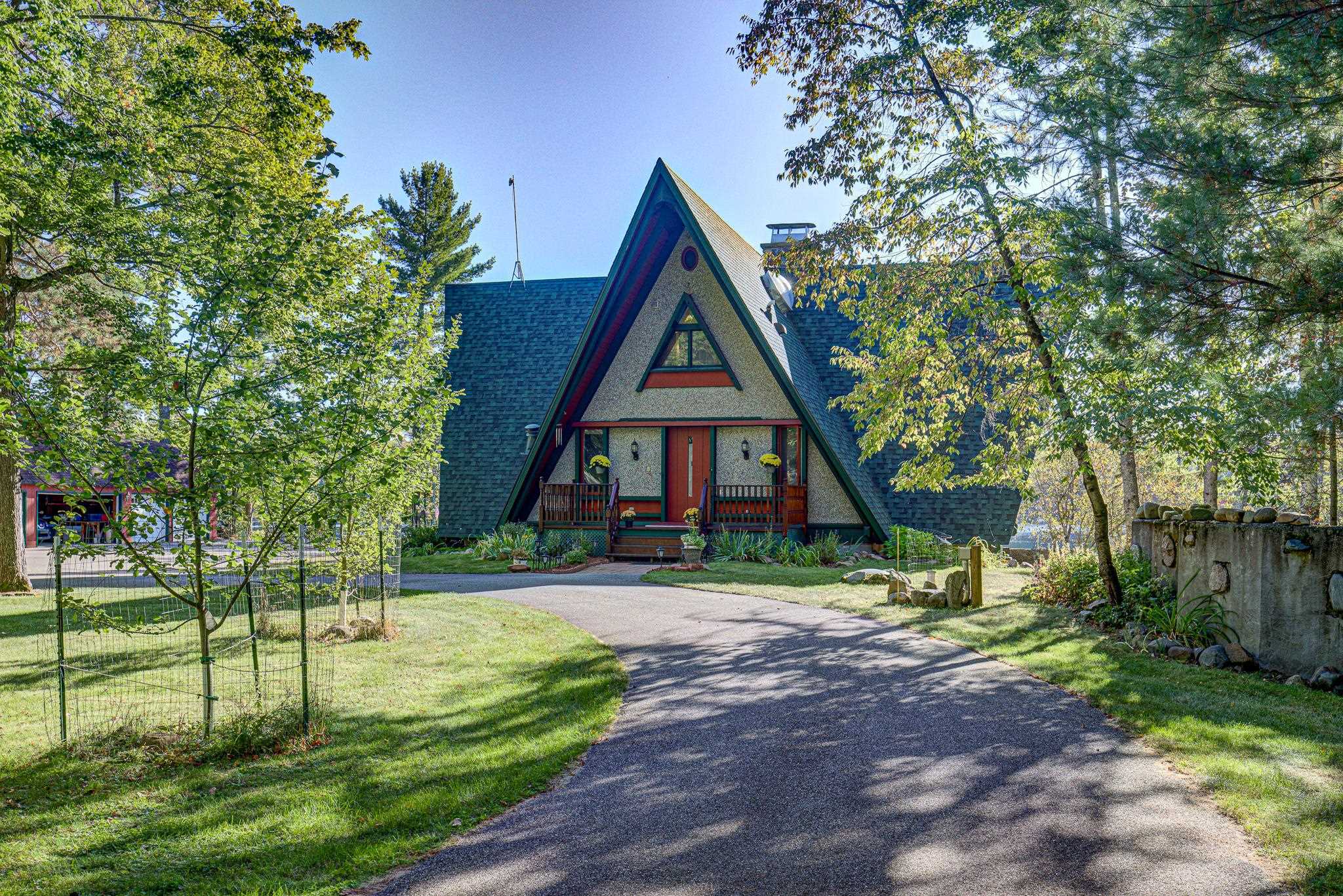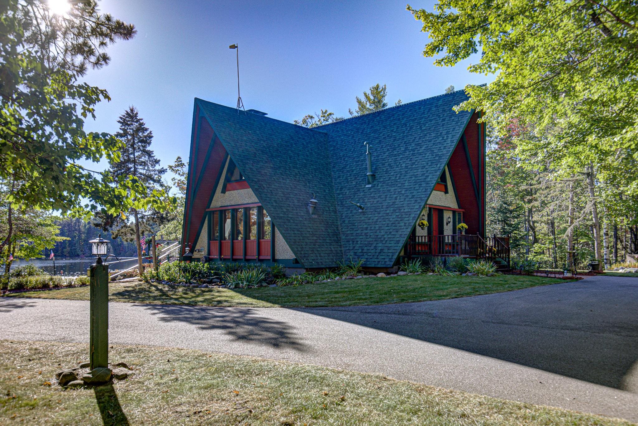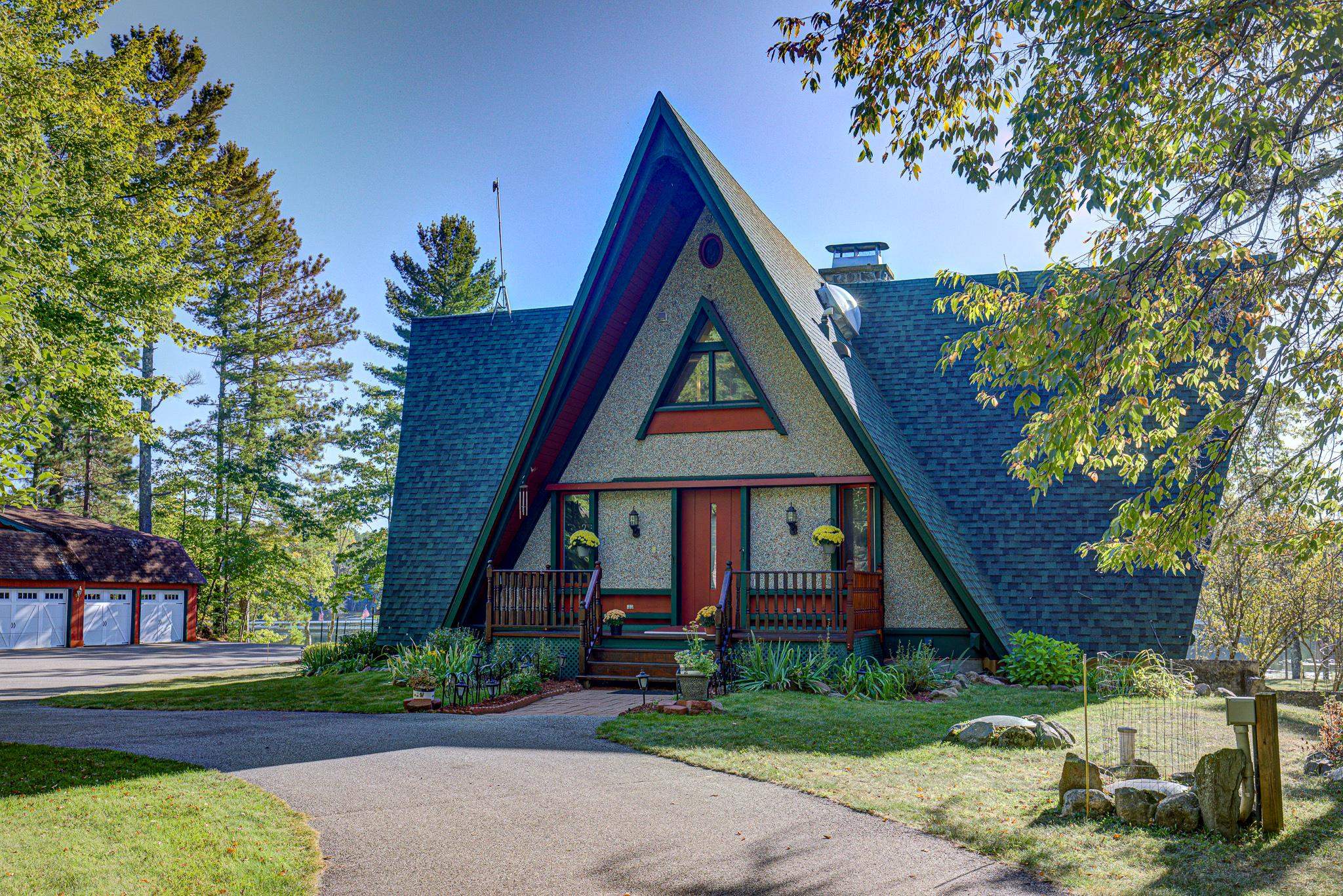 Discover your lakeside paradise with this breathtaking custom-built, double A-frame home on stunning Kildare Lake. This 1-of-a-kind retreat is the perfect blend of luxury and nature. From the eye-catching curved staircases to 2 cozy wood-burning fireplaces, every detail impresses. Relax on the expansive deck with jaw-dropping views or unwind in the private sauna. The main level offers a serene primary suite, a gourmet kitchen, and a half bath. Upstairs, two charming bedrooms and a full bath await. The walkout basement features 2 bedrooms, a hot tub, sauna, and a unique round fireplace, bringing lakeside living to new heights. Just steps from the water, this oasis includes an 8-car garage, private boat landing, and another 5-acre lake lot. Buyer to confirm measurements.