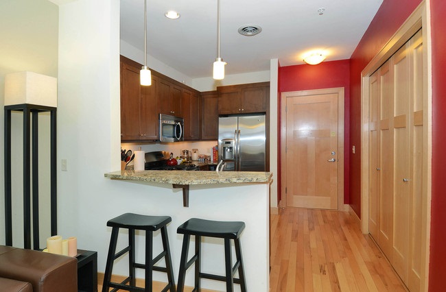 The Colony Condominiums. Enjoy the convenience of downtown living in this bright and sunny 2 bedroom condo. Upgraded kitchen with granite countertops, stainless steel appliances and amble cabinet space. The unit has it's own spacious and private balcony, in-unit laundry, comes with a deeded parking space in the heated garage and has 2 deeded storage units. Located just blocks from the lakes, bike paths, restaurants and the new grocery store coming this Summer!