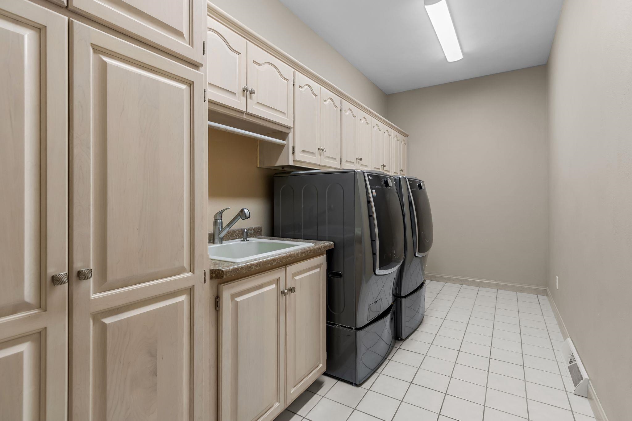 Refrigerator, cooktop, wall oven, microwave, dishwasher, refrigerator and freezer in garage, washer, dryer