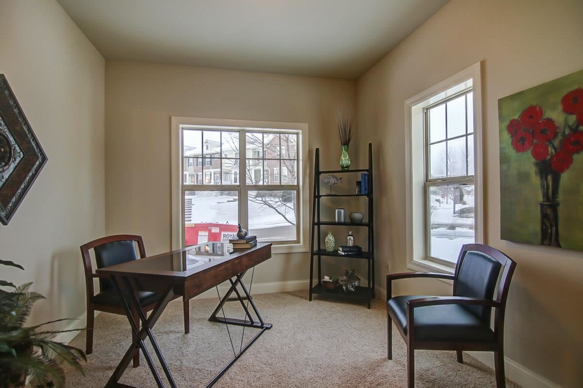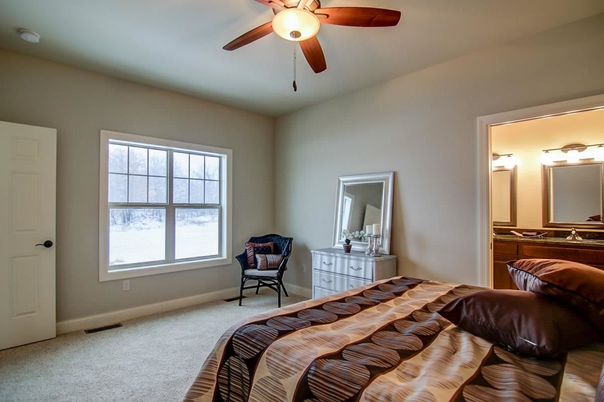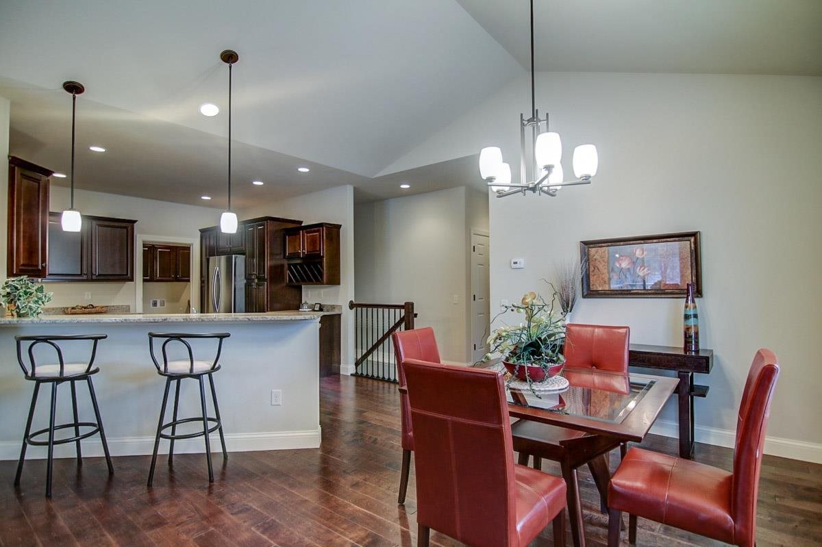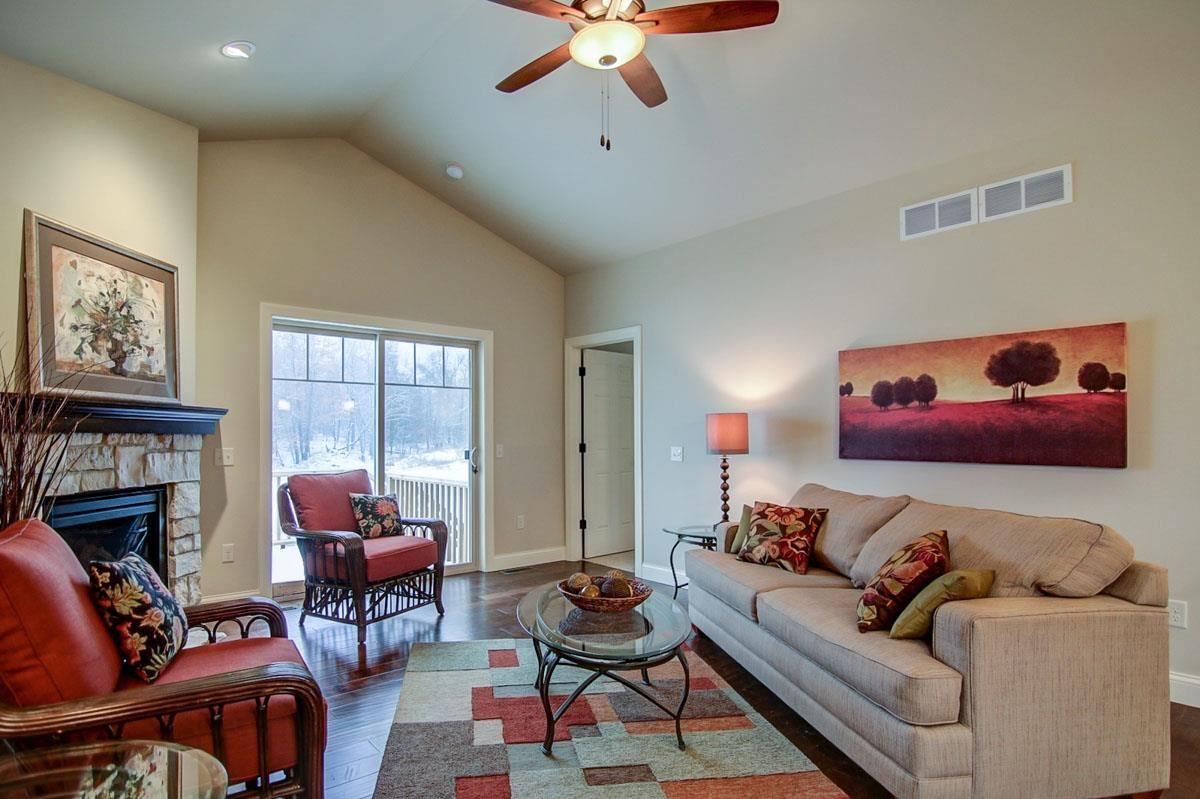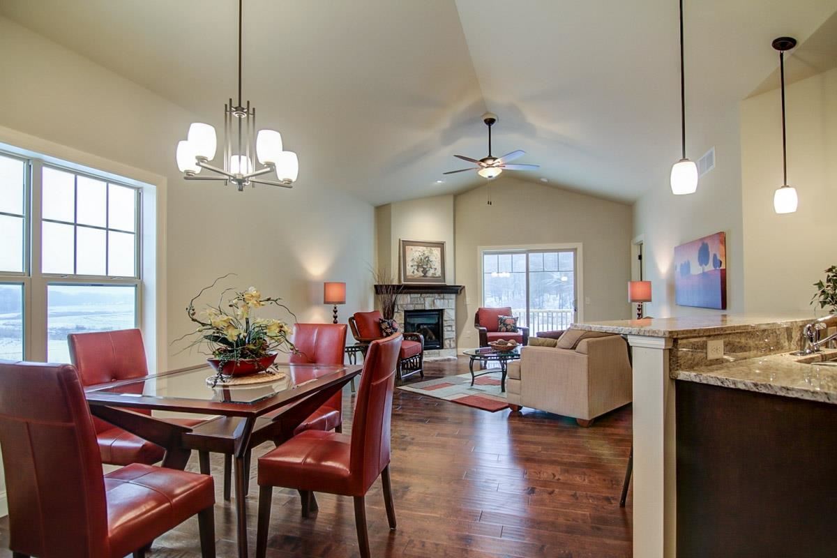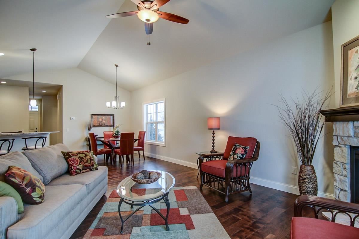 Just completed ranch twin home with new floor plan! Wood floors most of main level, vaulted ceiling in greatrm w/stone gas fp, all open to kitchen w/pantries, breakfast bar, granite tops and stainless appl. Wonderful laundry off garage with storage. Owner’s suite features double vanity in private bath and nice size walk in closet. Den or 2nd bedrm on main level. Walk out lower level for future expansion includes bath rough in. Watch wildlife off your deck overlooking green space.