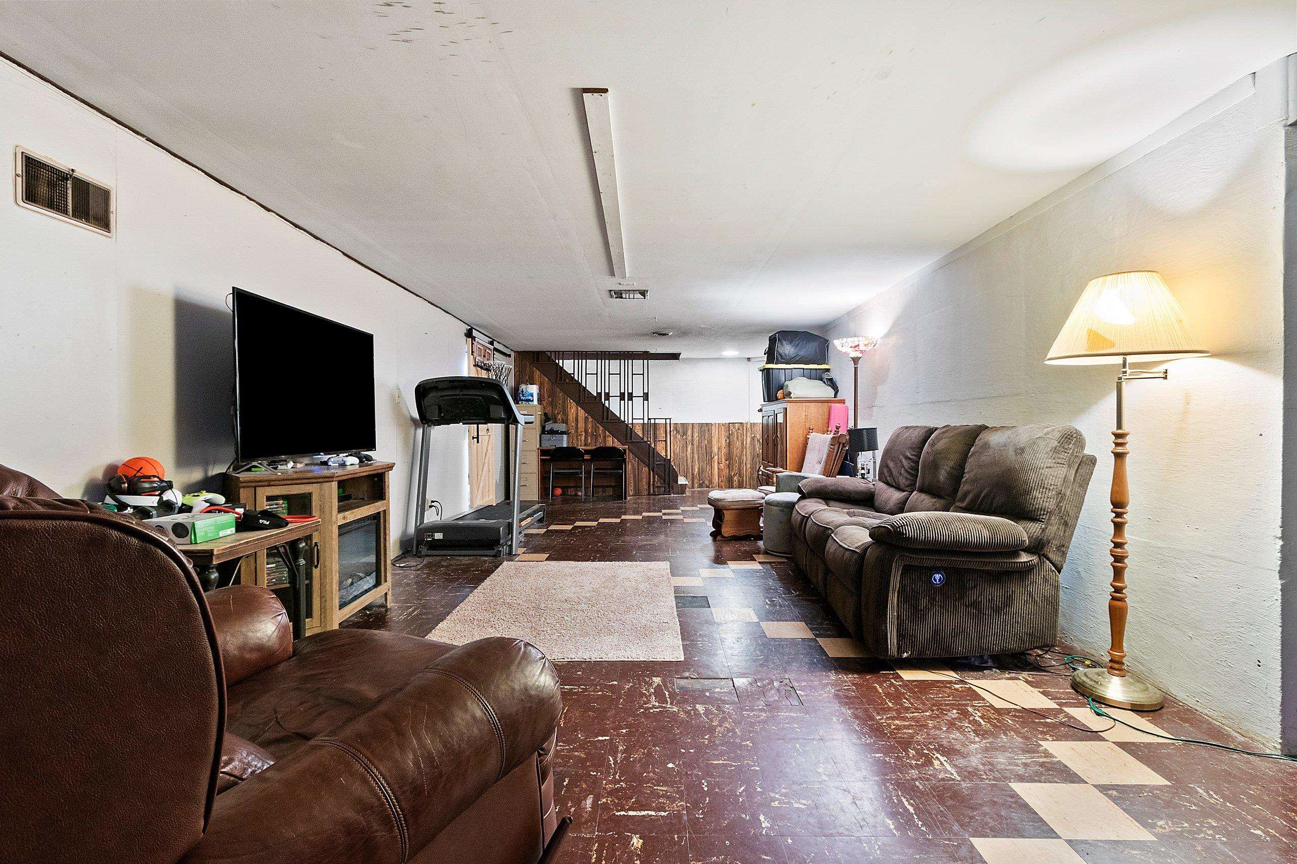 refrigerator, microwave, dishwasher, stove, washer, dryer, kitchen hutch, living room couch, basement couch, piano, swing set, trampoline