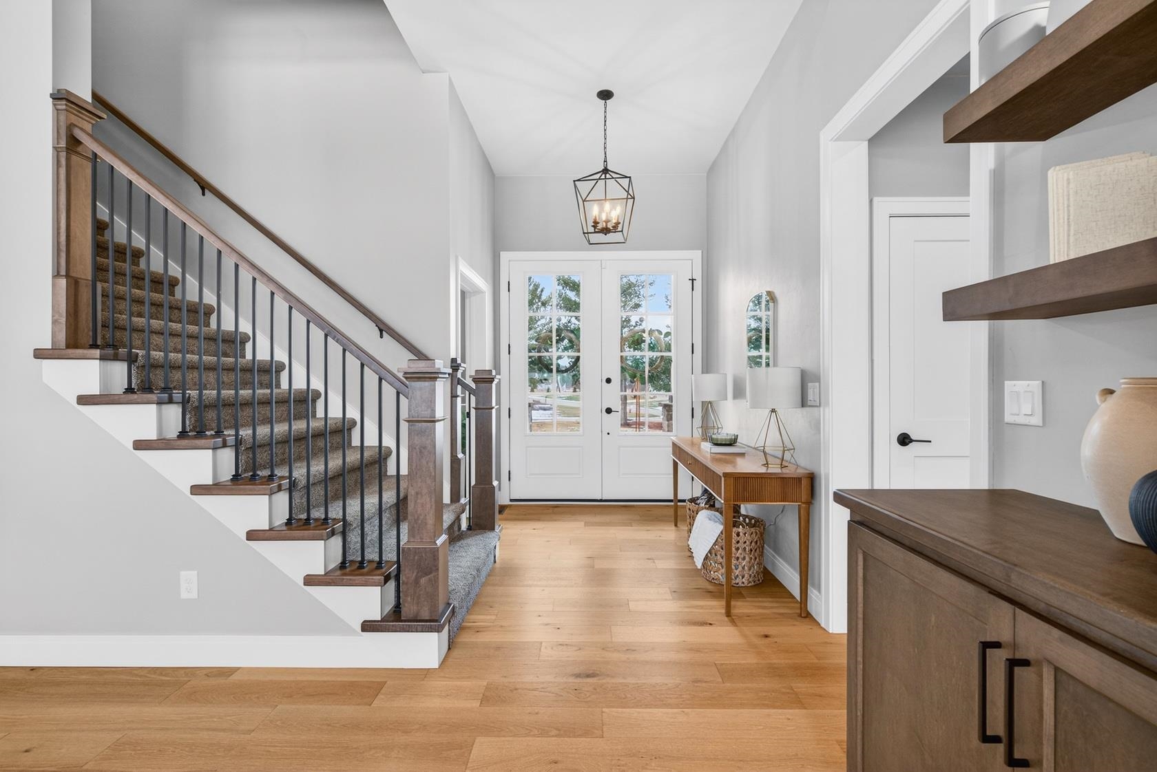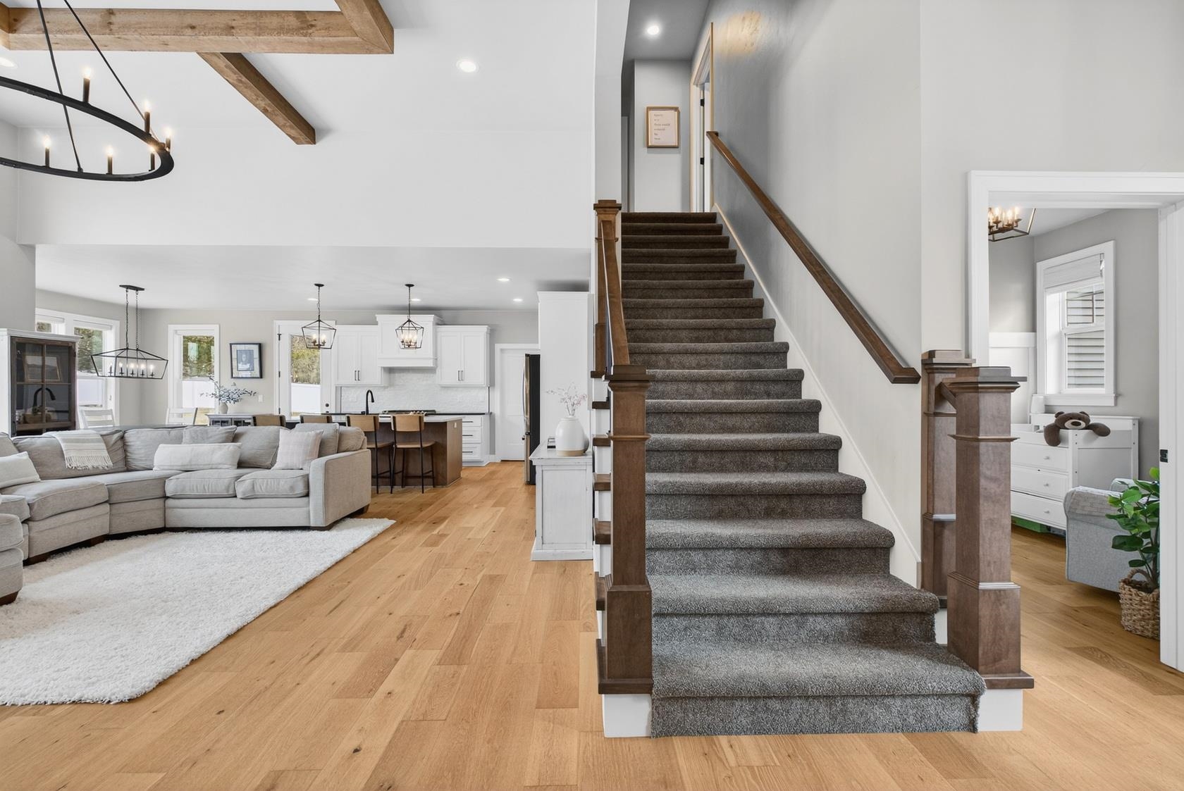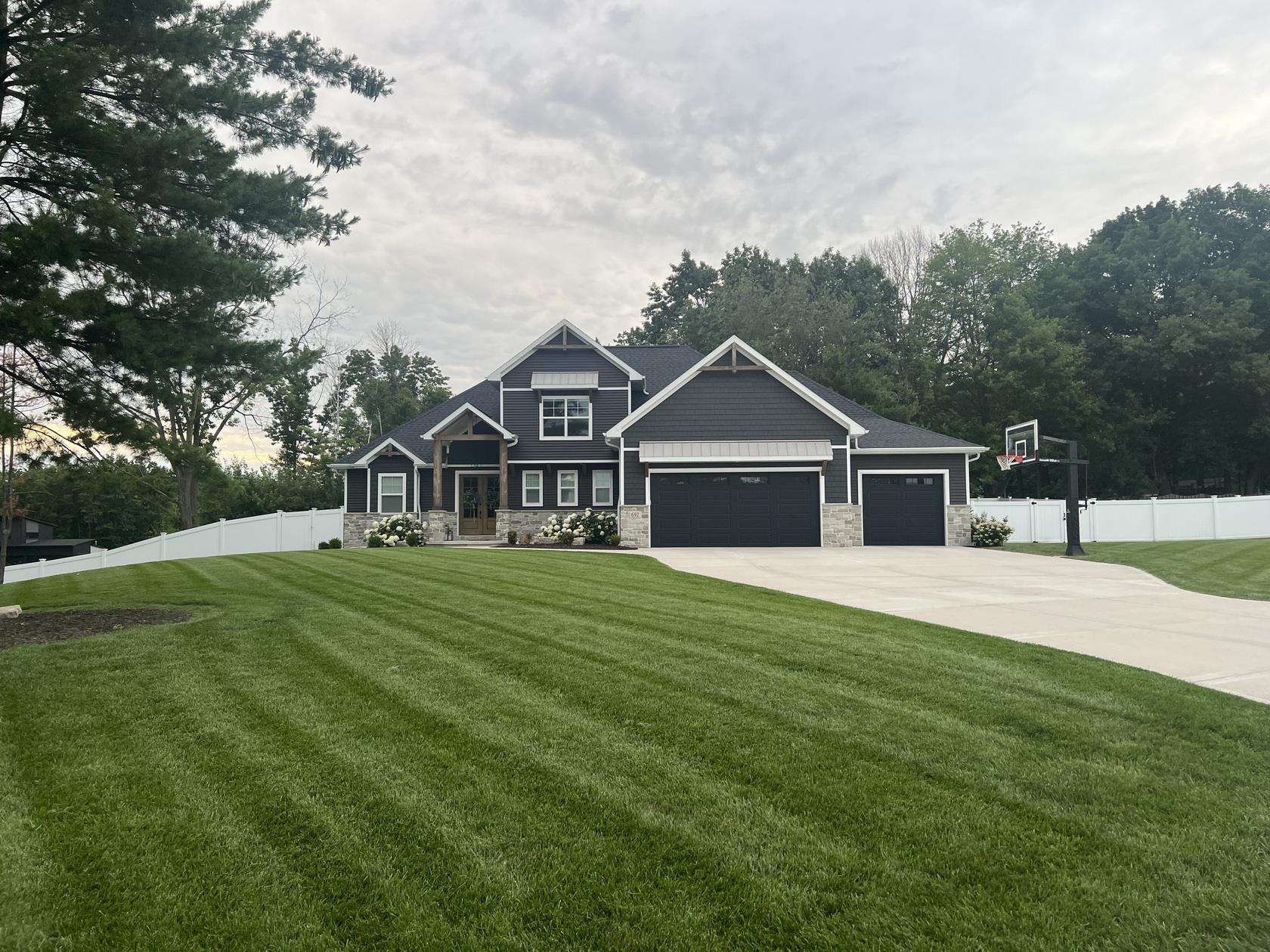 Meticulously maintained 1.5-story custom home in desirable Hobart on a landscaped 1-acre lot! This 5-bedroom, 3.5-bath residence blends craftsmanship with modern design. Bright open great room with floor-to-ceiling windows, chef’s kitchen with large island and walk-in pantry, plus dining area flowing to covered patio and fenced backyard. First-floor office and main-level primary suite with spa-like bath. Finished daylight lower level with rec room, bedroom, and full bath. 3-stall garage. Move-in ready!