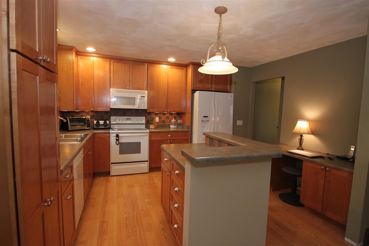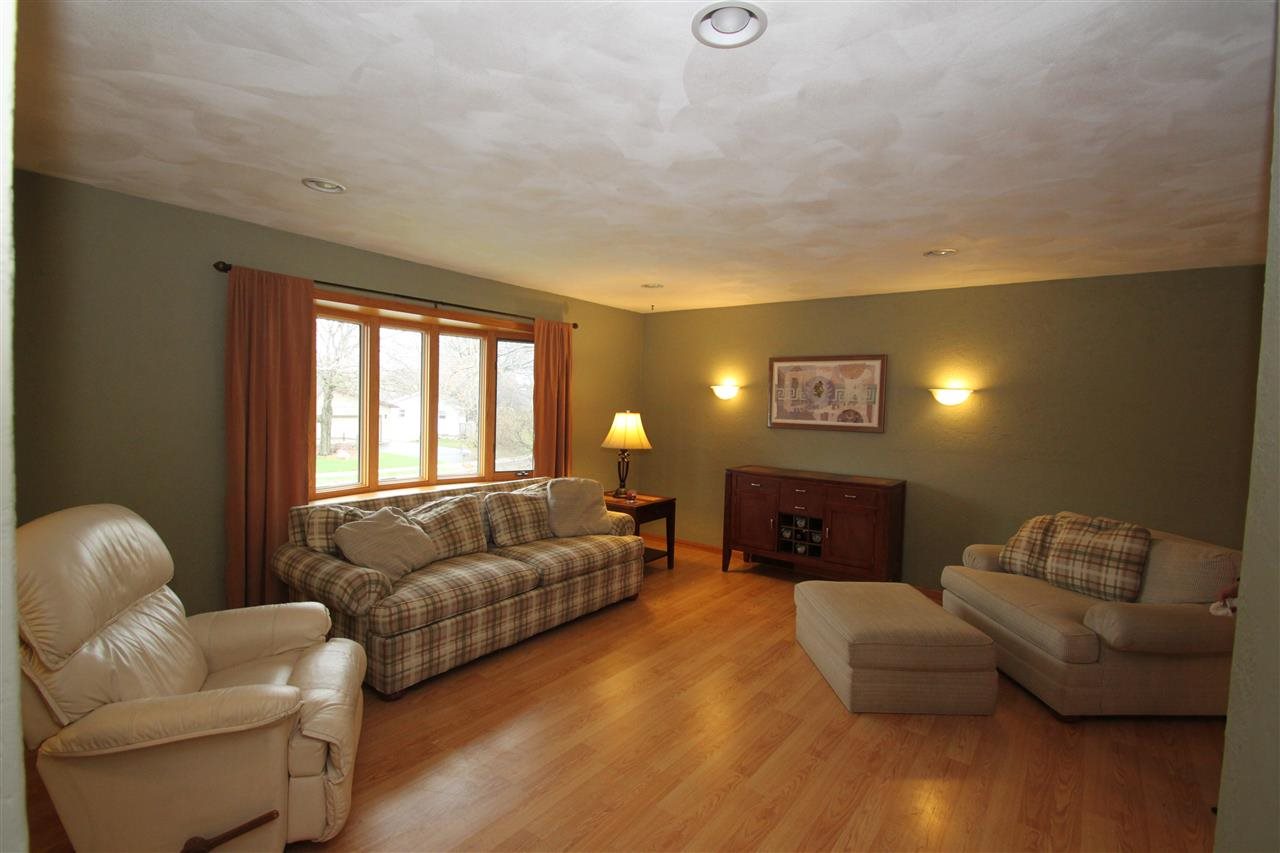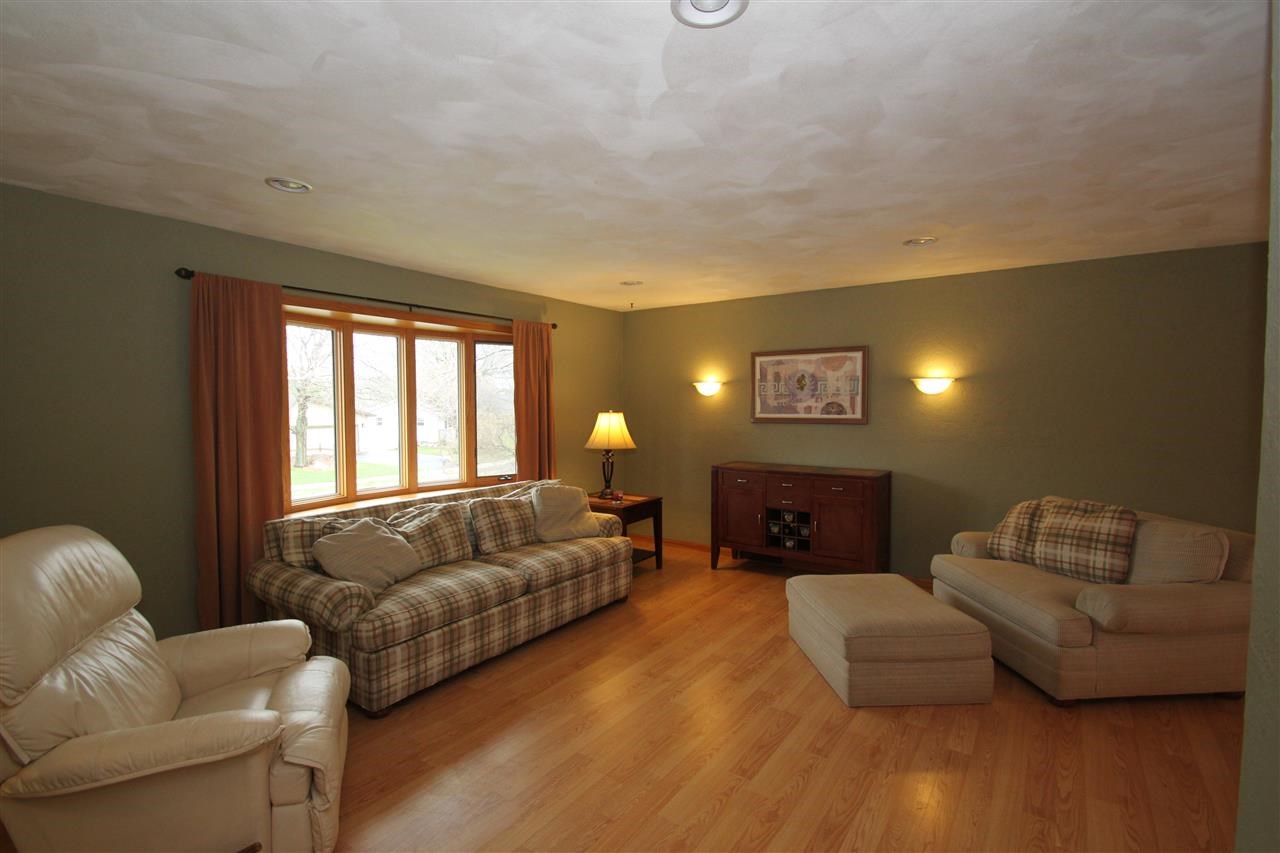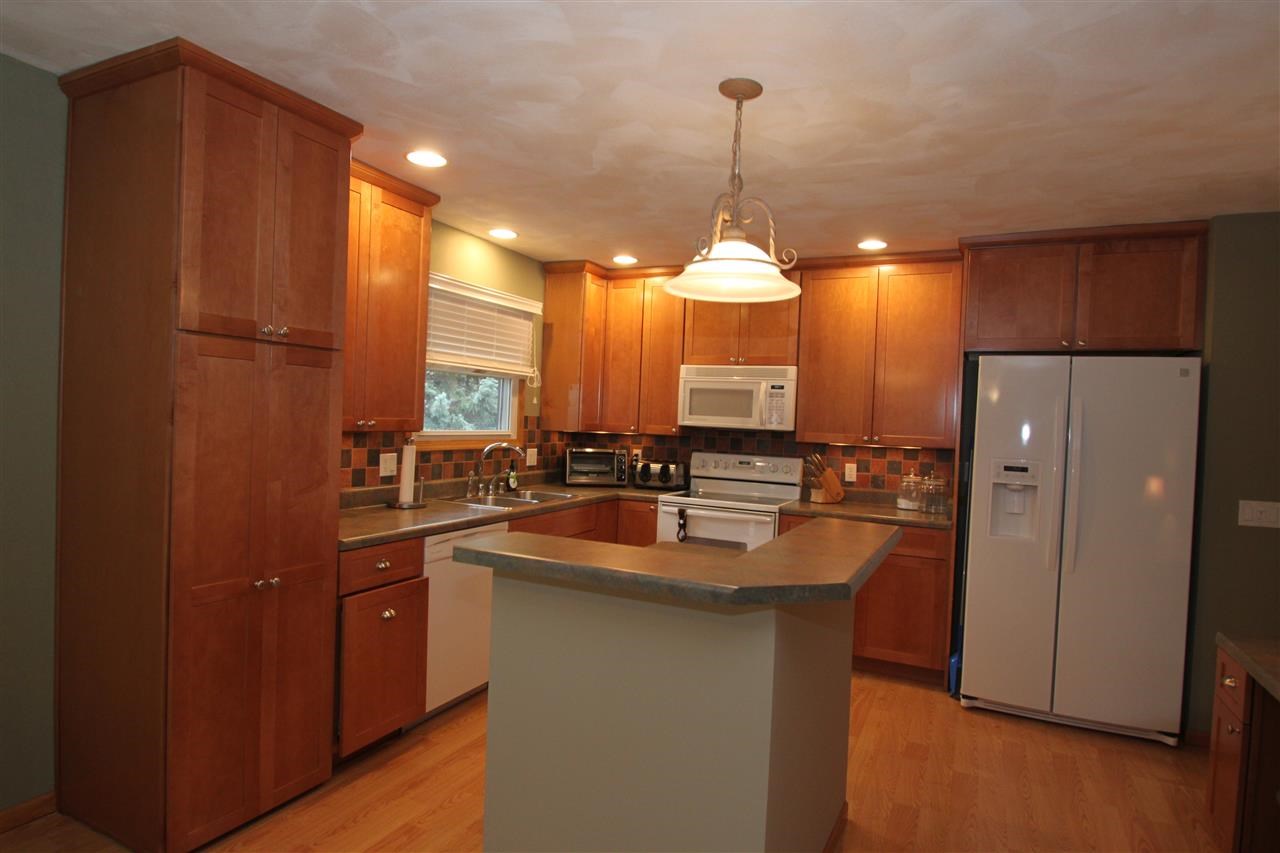 Kitchen is wrapped in rich new cabinetry with pull out shelving & large island. Beautiful tile backslash & wood floors. Dining area leads to large glass doors over looking ample size backyard w/mature trees. Open & spacious living room w/large bay window. Master suite w/walk through bath & double closets. Lwr level family rm w/ warm wood burning fireplace has plush new carpet. Home office or extra storage area. Newer siding, roof, windows & water softener. Home has been freshly painted.