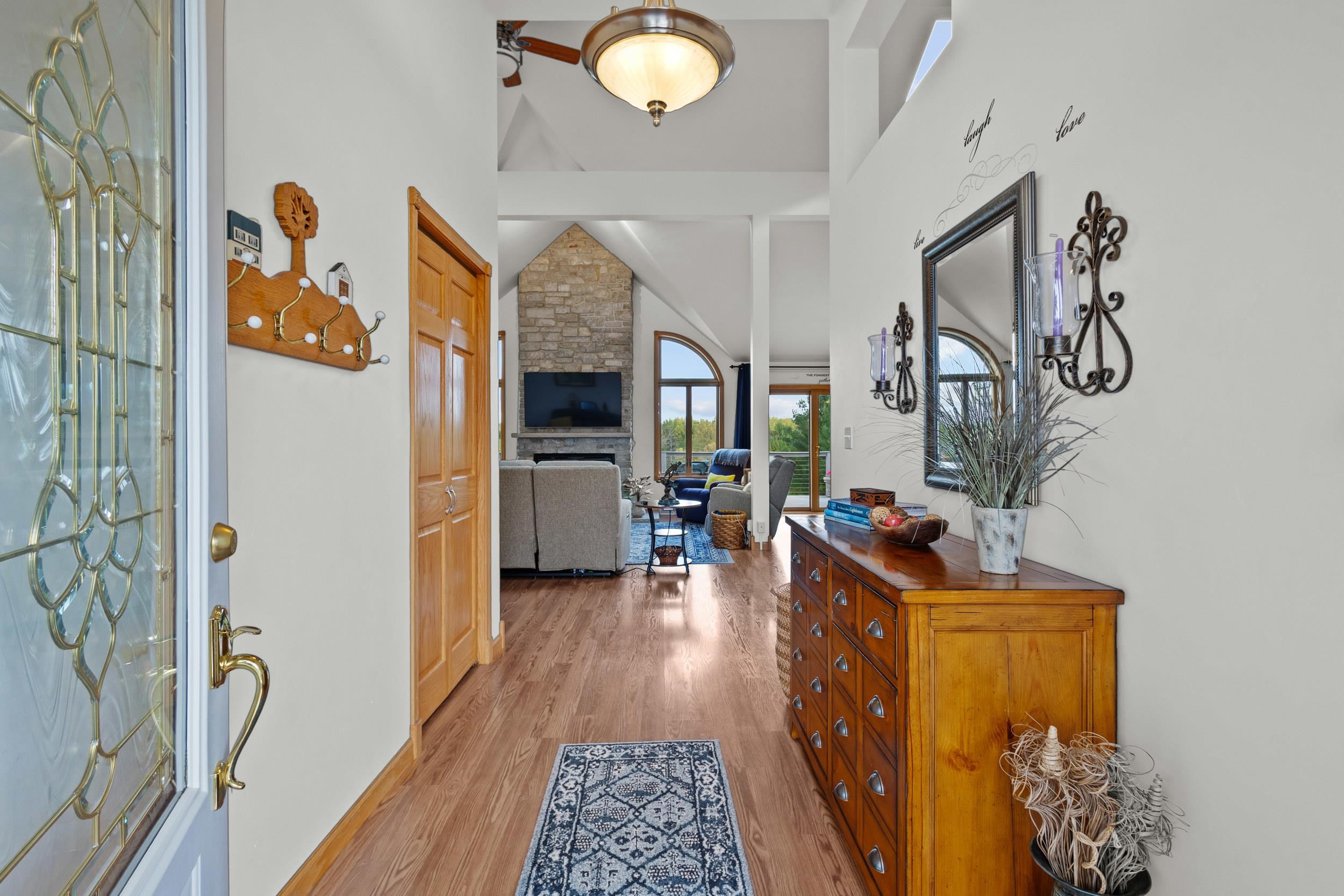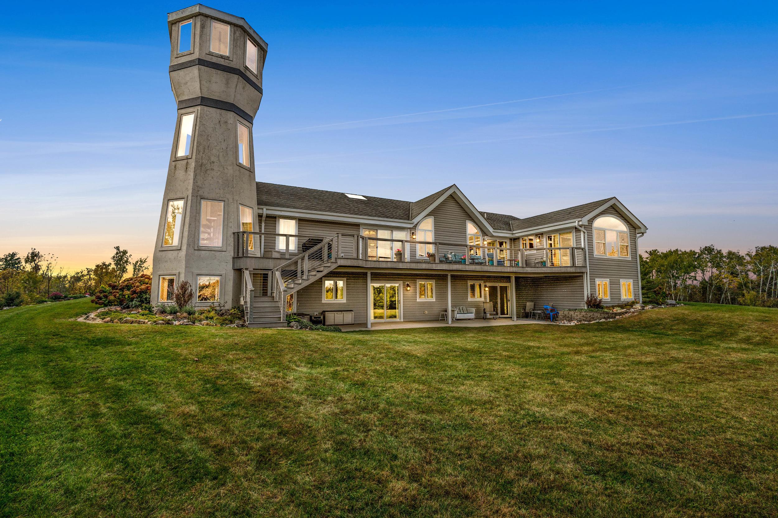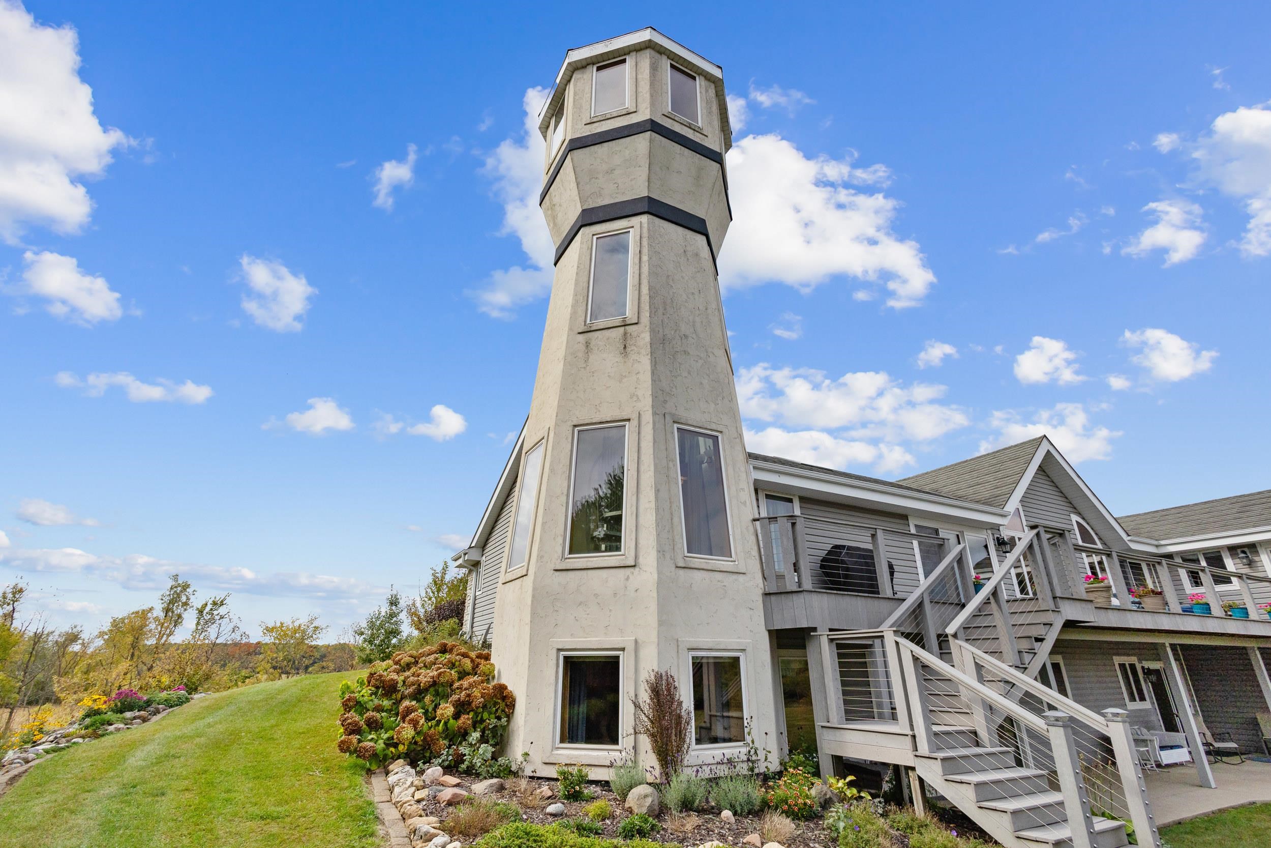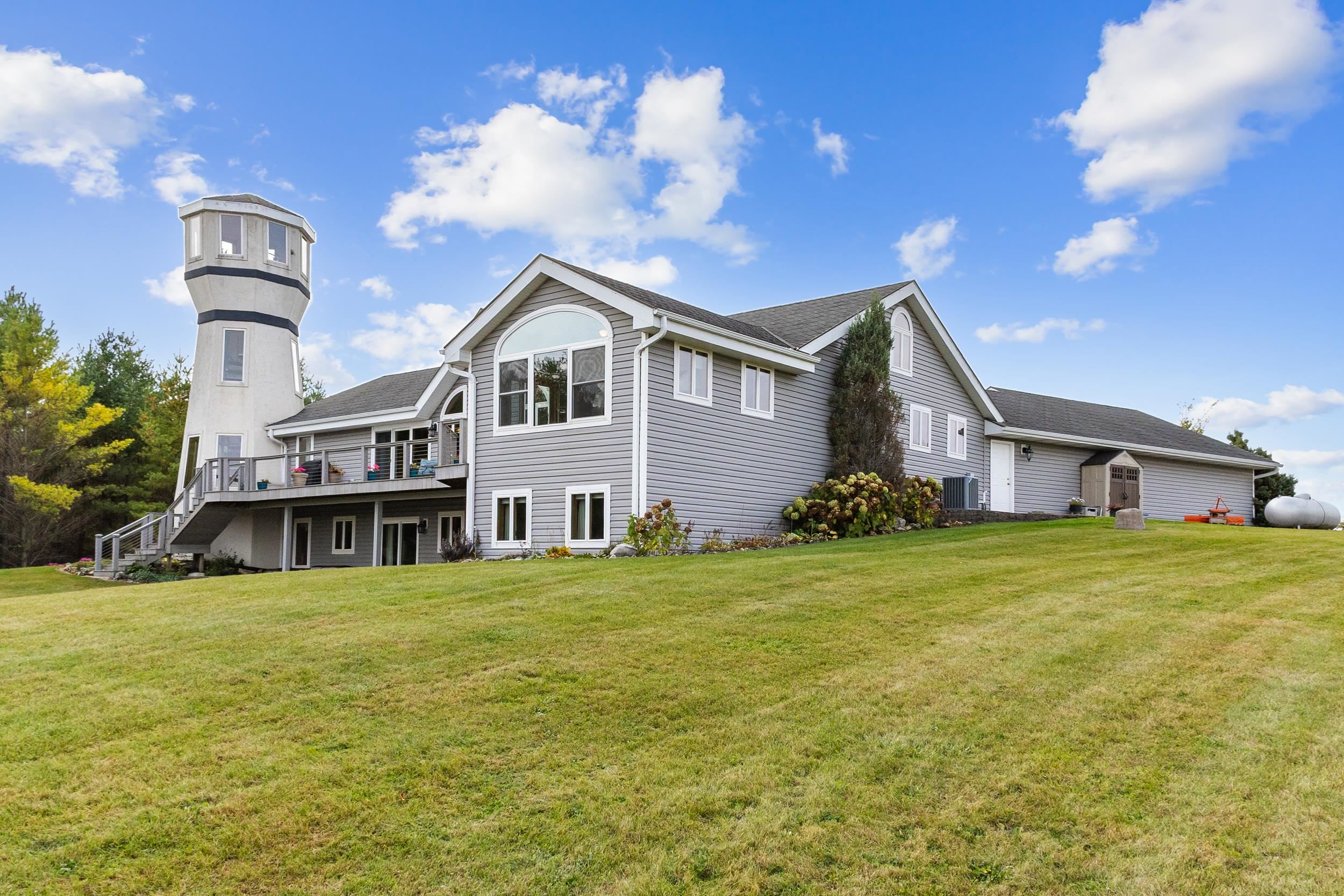 Custom craftsmanship defines this open concept, 5-bedroom modern ranch on 6.5 acres. Highlights include a lighthouse tower with spiral staircase and 360° views, vaulted ceilings, skylights, stone fireplaces, sunroom, granite kitchen, hardwood floors, and Kohler fixtures. The finished walkout lower-level features 2 patio doors, 2 large bedrooms, full bath with whirlpool tub, mini-kitchen/bar, radiant in-floor heat, and abundant storage. A 4 car insulated garage, 50-year roof, and composite deck overlooks mature trees, low-maintenance landscaping, perennial gardens and fieldstone walls to complete this high-quality, energy-efficient home. Thoughtful designs enable a fully accessible home. Impeccably cared for and move-in ready!