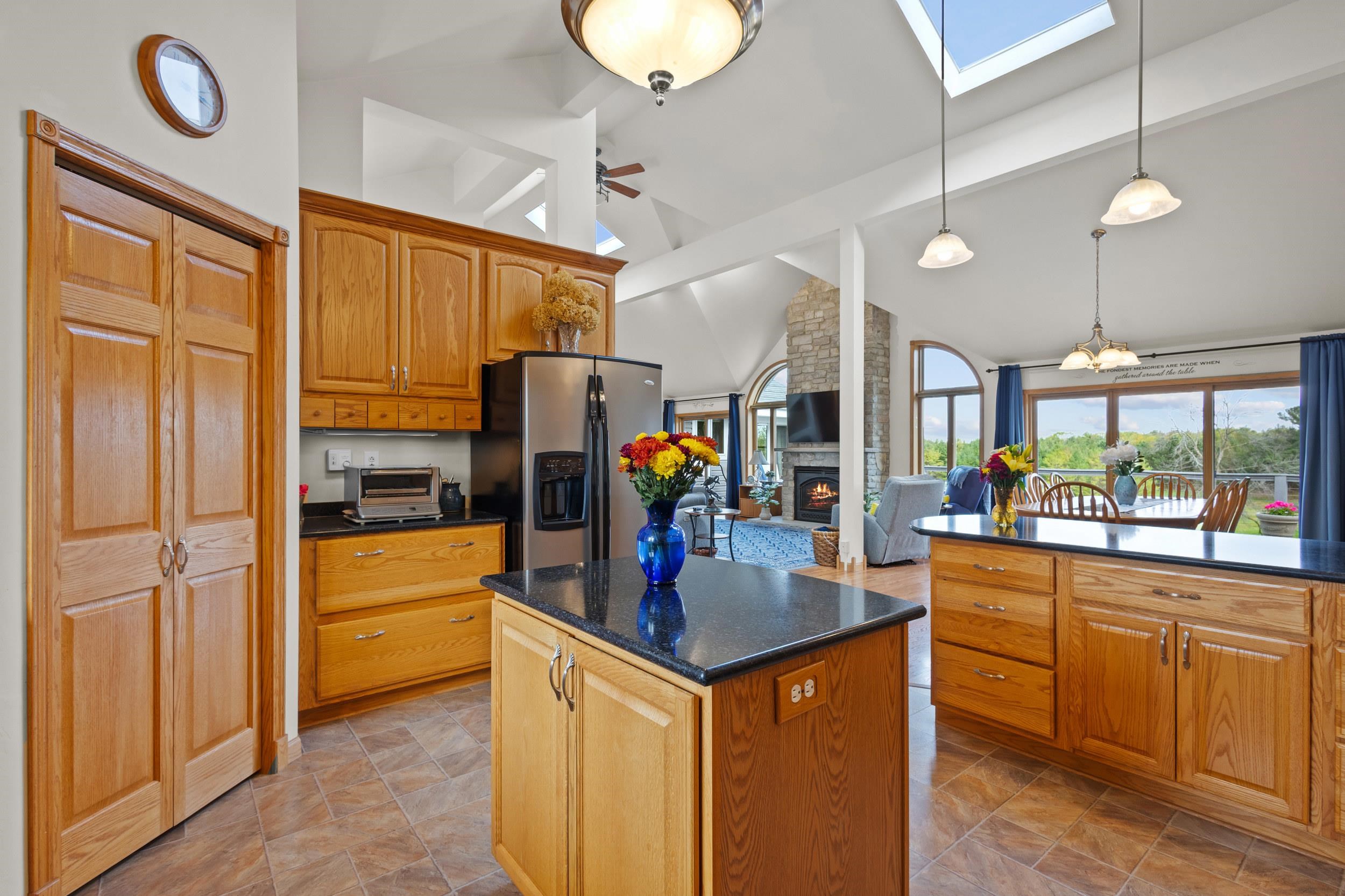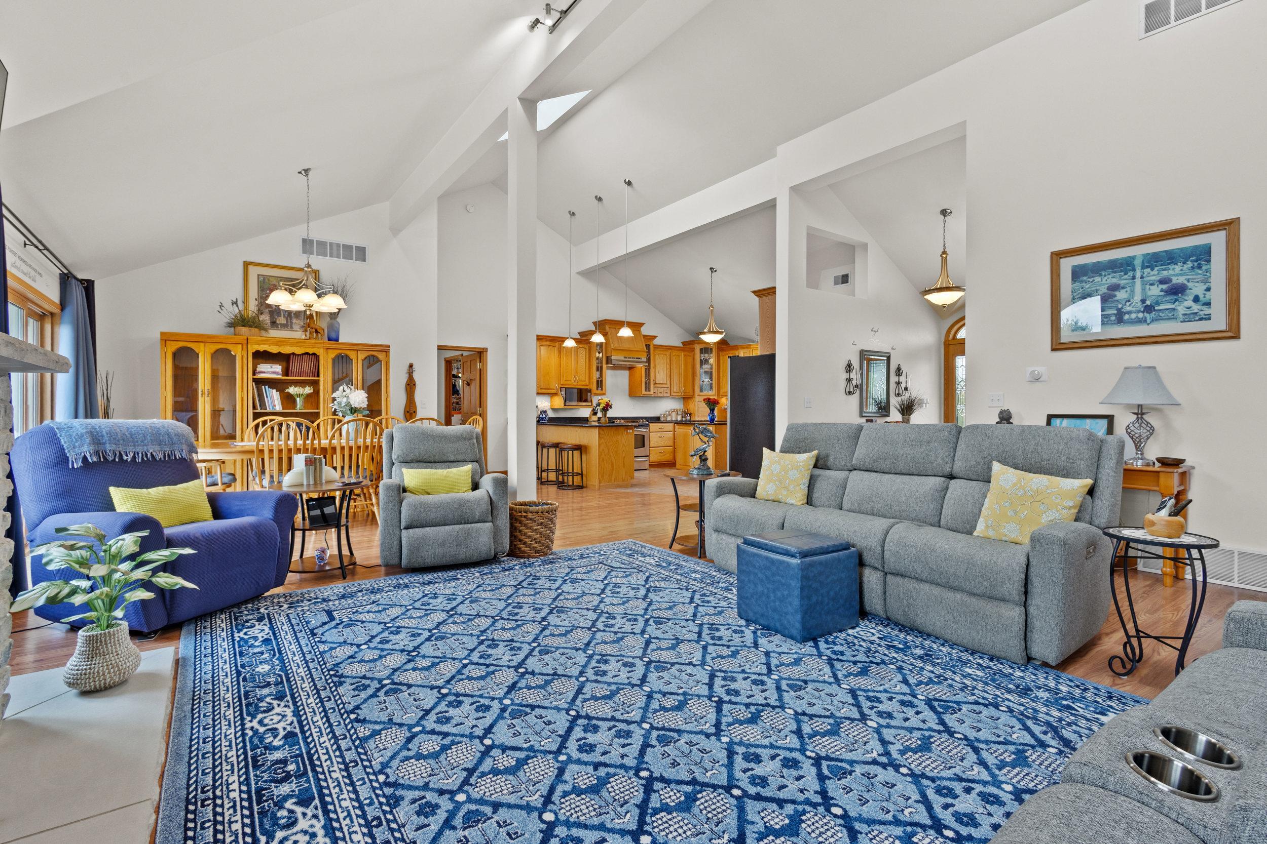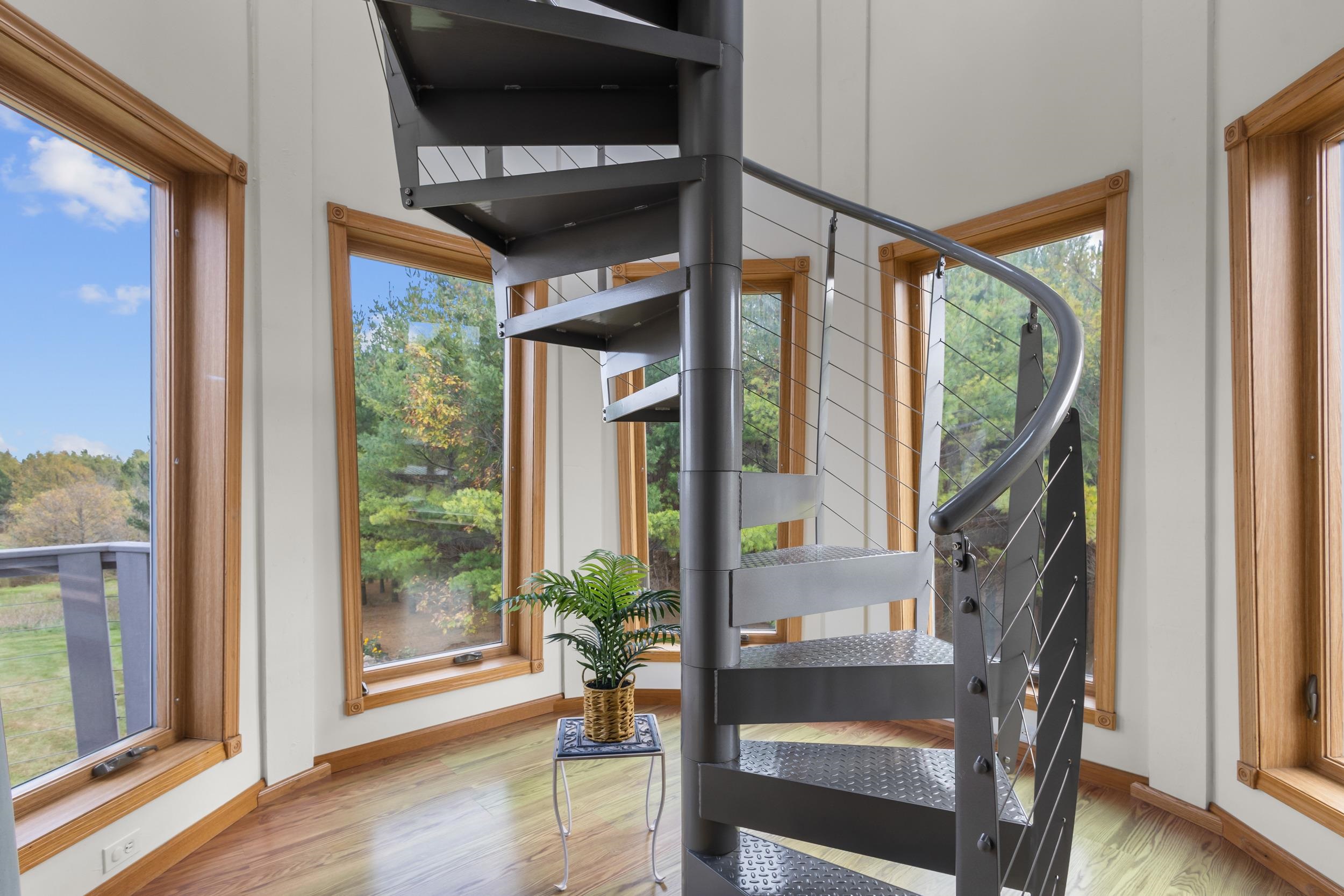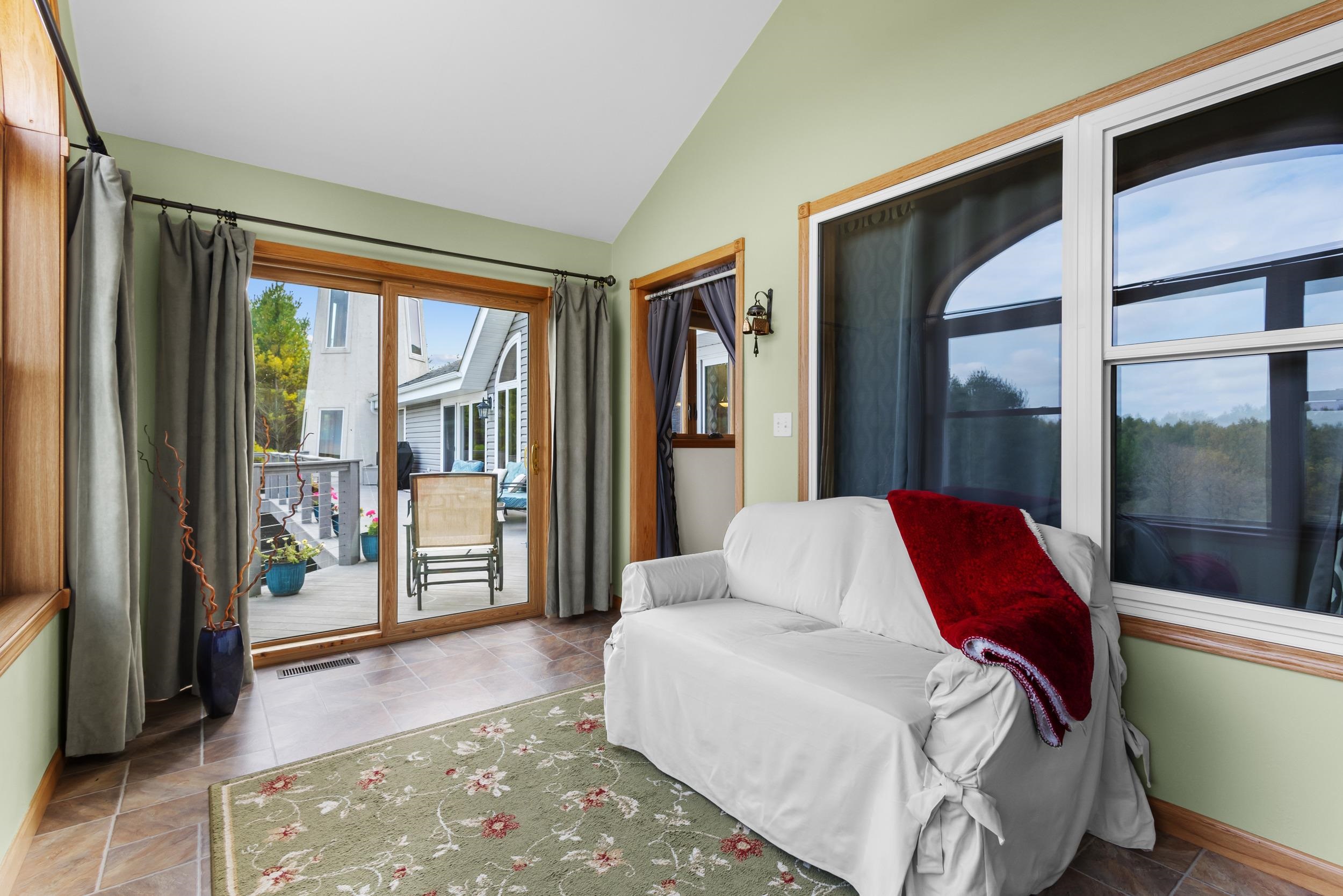 Custom craftsmanship defines this open concept, 5-bedroom modern ranch on 6.5 acres. Highlights include a lighthouse tower with spiral staircase and 360° views, vaulted ceilings, skylights, stone fireplaces, sunroom, granite kitchen, hardwood floors, and Kohler fixtures. The finished walkout lower-level features 2 patio doors, 2 large bedrooms, full bath with whirlpool tub, mini-kitchen/bar, radiant in-floor heat, and abundant storage. A 4 car insulated garage, 50-year roof, and composite deck overlooks mature trees, low-maintenance landscaping, perennial gardens and fieldstone walls to complete this high-quality, energy-efficient home. Thoughtful designs enable a fully accessible home. Impeccably cared for and move-in ready!