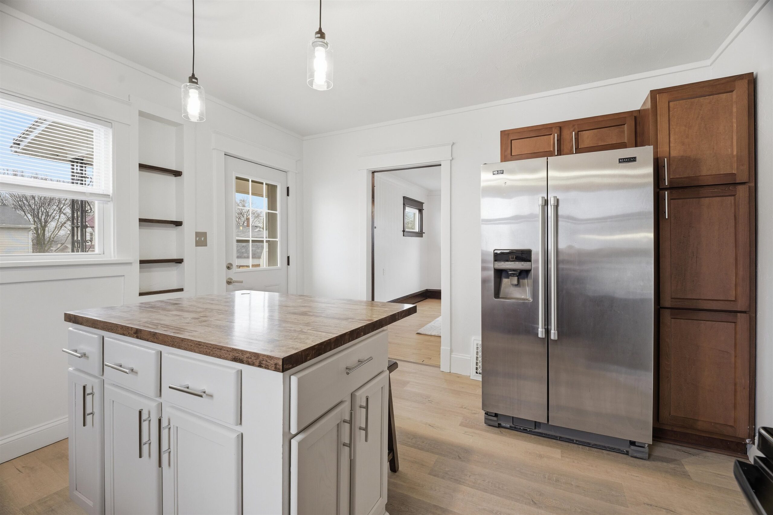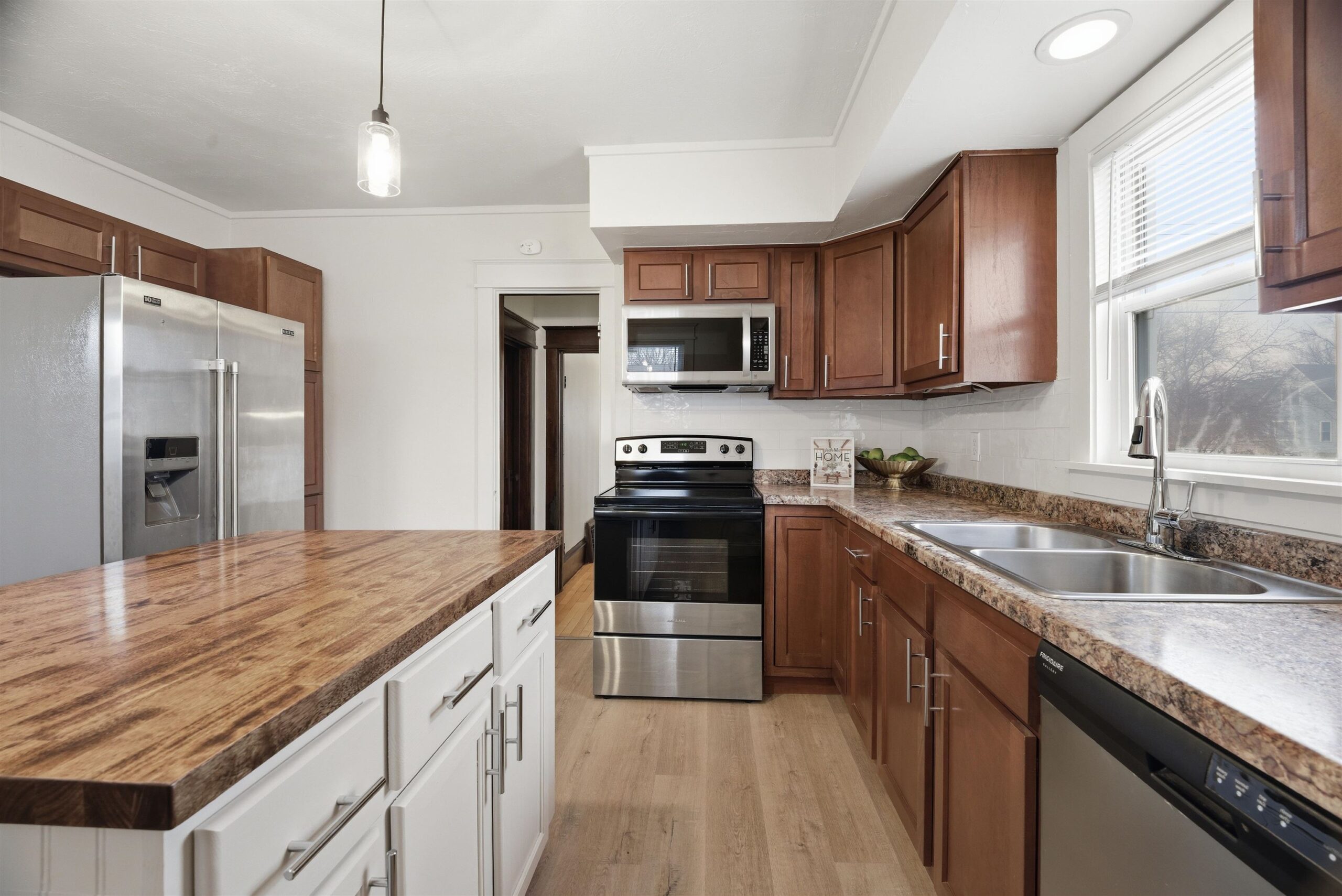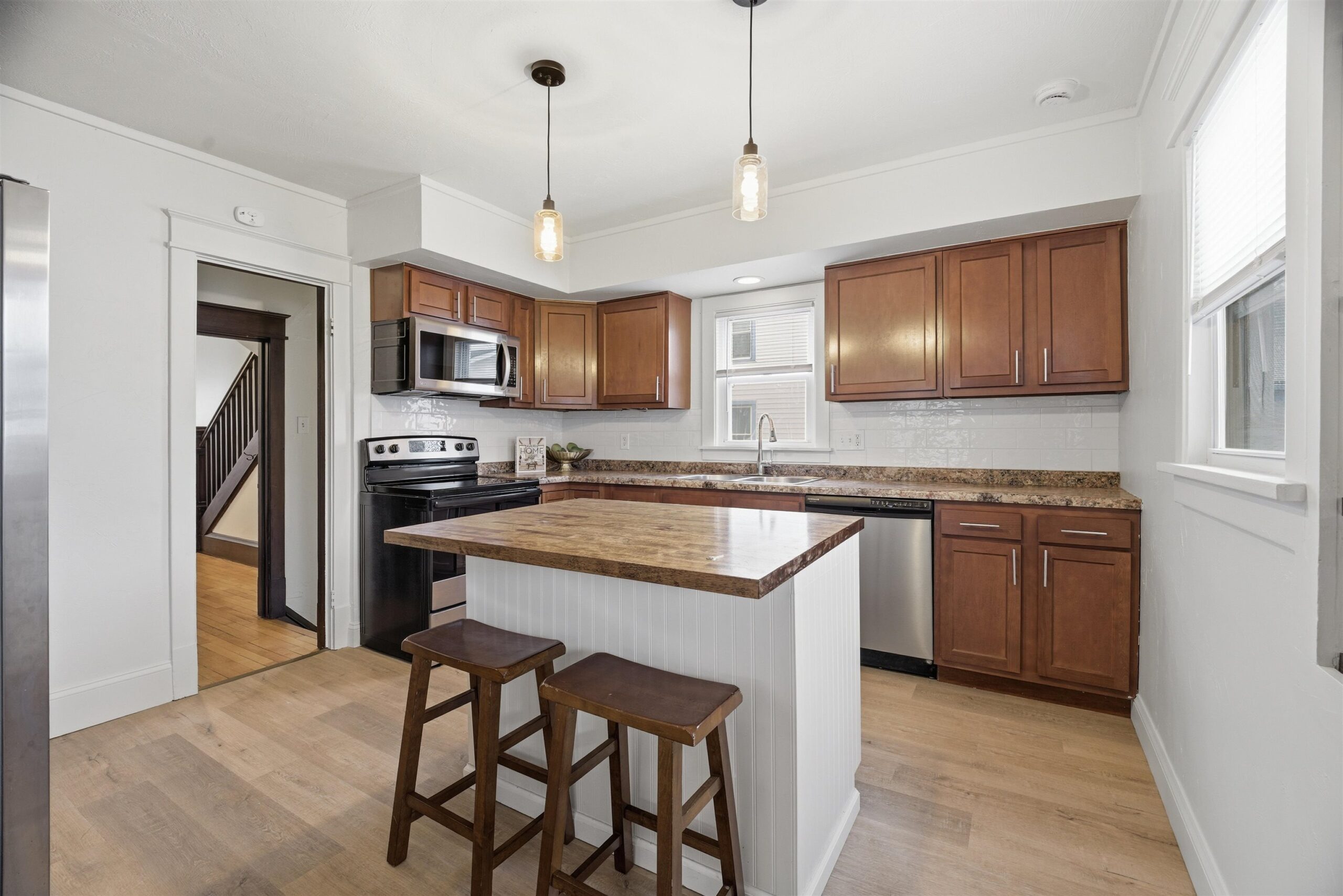 NEW GARAGE DOOR TO BE INSTALLED APRIL 4TH! Renovated 2-story home featuring 3 bedrooms and 1 full bath. Brand new roof on both the house and garage, plus all exterior windows and doors wrapped in aluminum for low maintenance(excluding porch). Enjoy a fully fenced yard with newer fencing. Inside offers beautiful hardwood floors and original wood character throughout. Spacious family room with recessed lighting and a formal dining room. Updated kitchen with stainless steel appliances, tile backsplash, island, pantry, newer cabinets and countertops. Upstairs includes 3 bedrooms and a full bath with new flooring, vanity, light fixtures and mirror. Fresh interior paint throughout. Washer and dryer included.