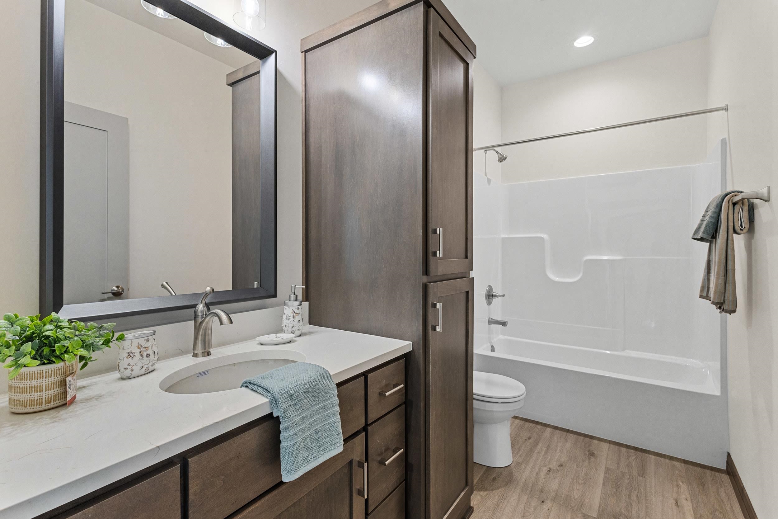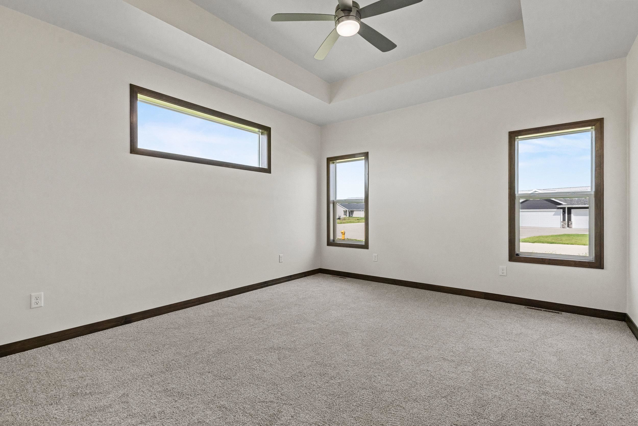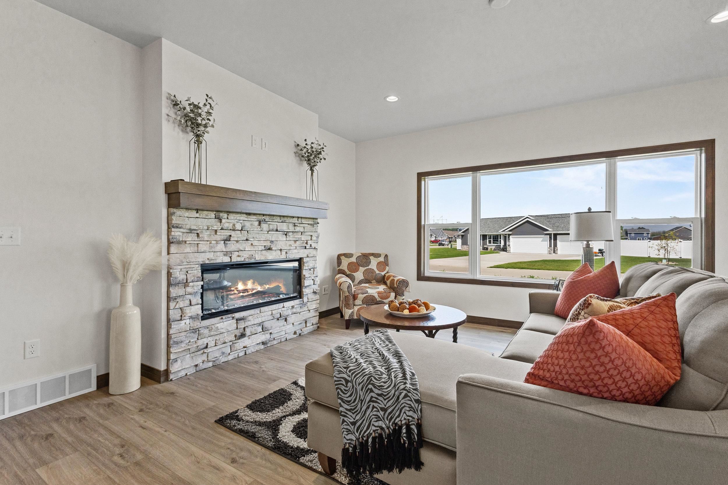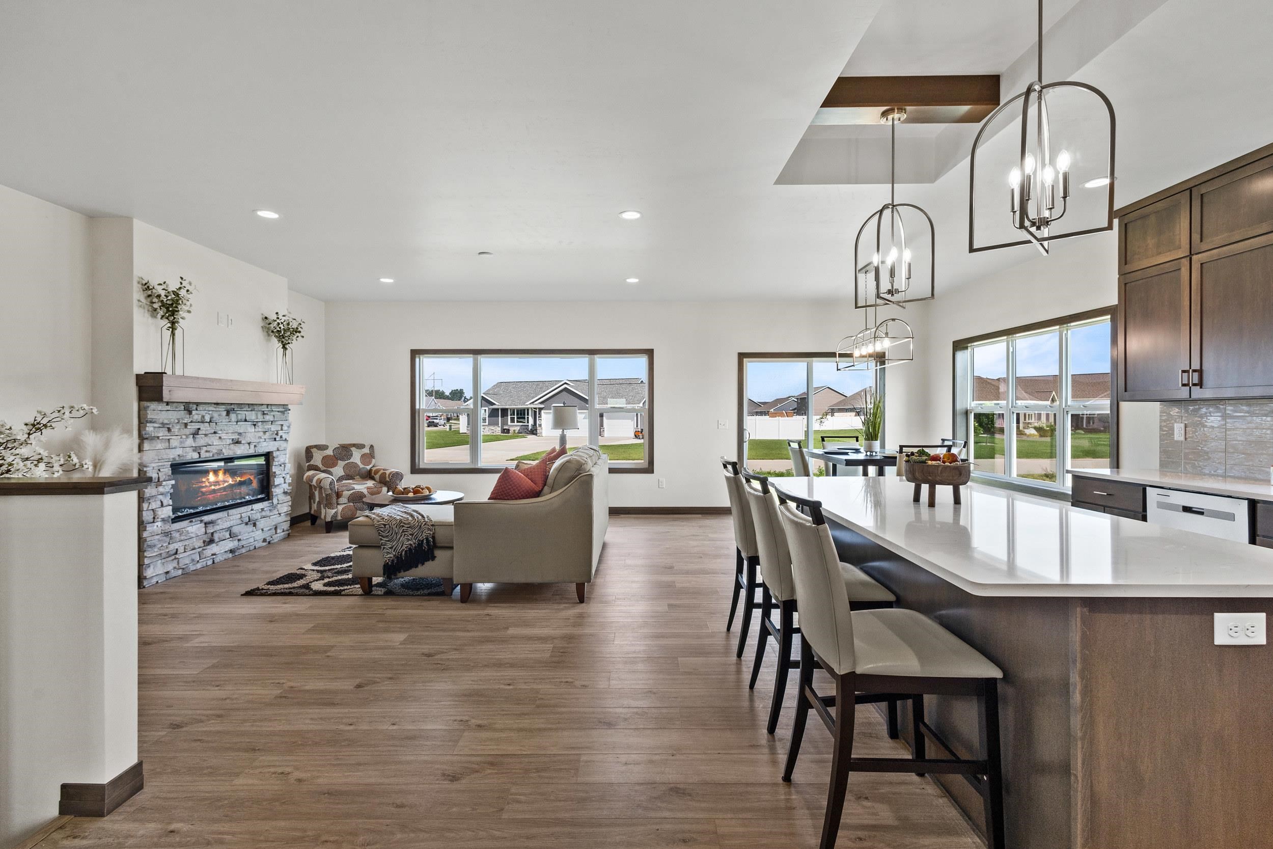 This classy 2 bedroom, 2 bath condo offers tons of space for entertaining or relaxing! The kitchen has beautiful custom Flint stained maple cabinets. Carrara Trigato Quartz countertops and Groove Glossy Funk Beige tile backsplash complete this elegant look. Paramount First Light LVP flooring can be found throughout main living areas. Relax next to your 50" Simplifire Allusion Platinum Linear Electric Fireplace surrounded by Precision Fit Alpine stone. The primary bedroom is a retreat with dual entry into the attached primary bath. Monthly association fee is $175.00. Basement offers full bath rough-in and egress window for future expansion. Lawn and shrubbery complete this package of maintenance-free living!