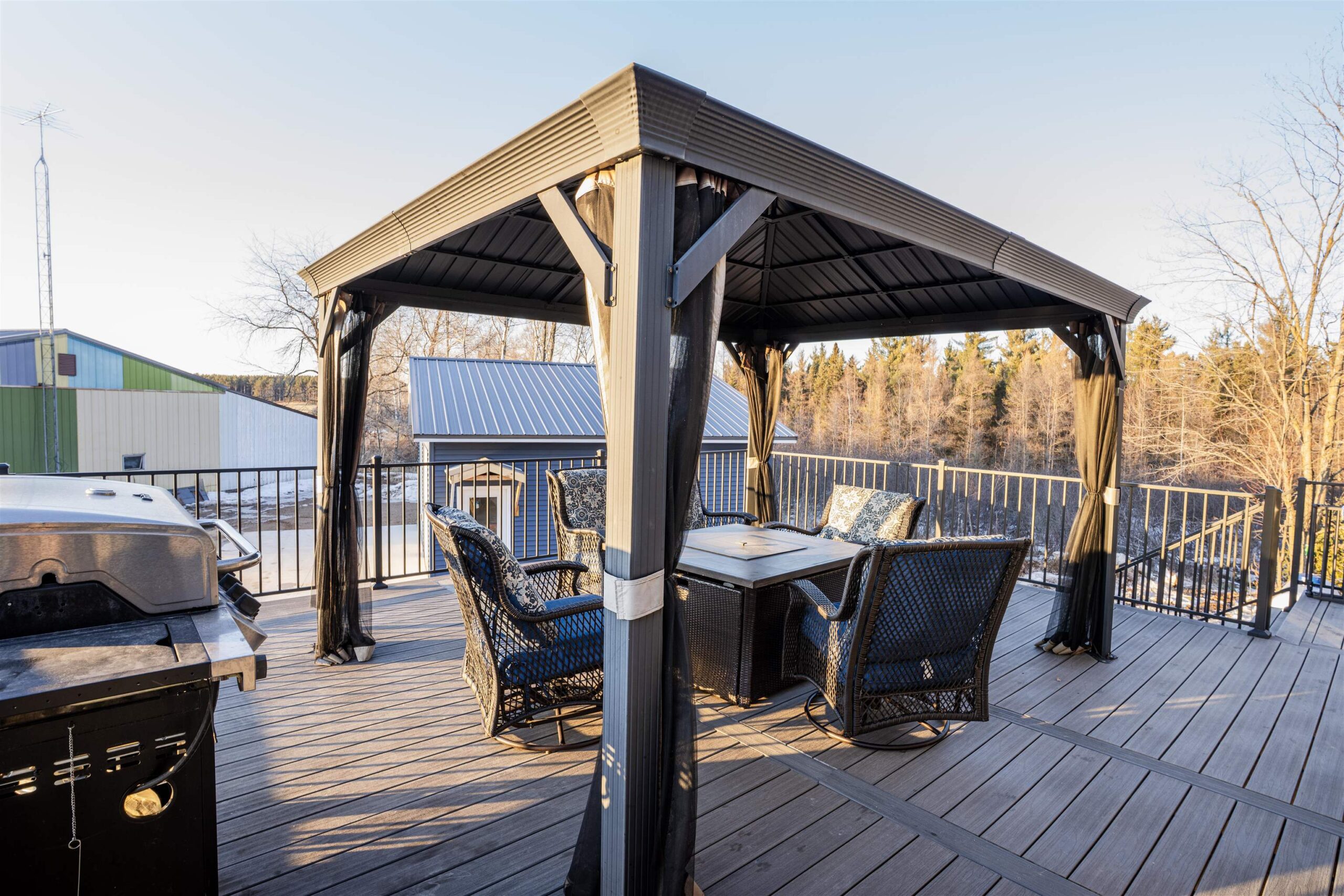 Refrigerator, Stove, Microwave, Dishwasher, Washer, Dryer, Car hoist,500 gallon LP tank, Antenna, Gazebo, Window treatments, Wooden shelving,Fire Pit.