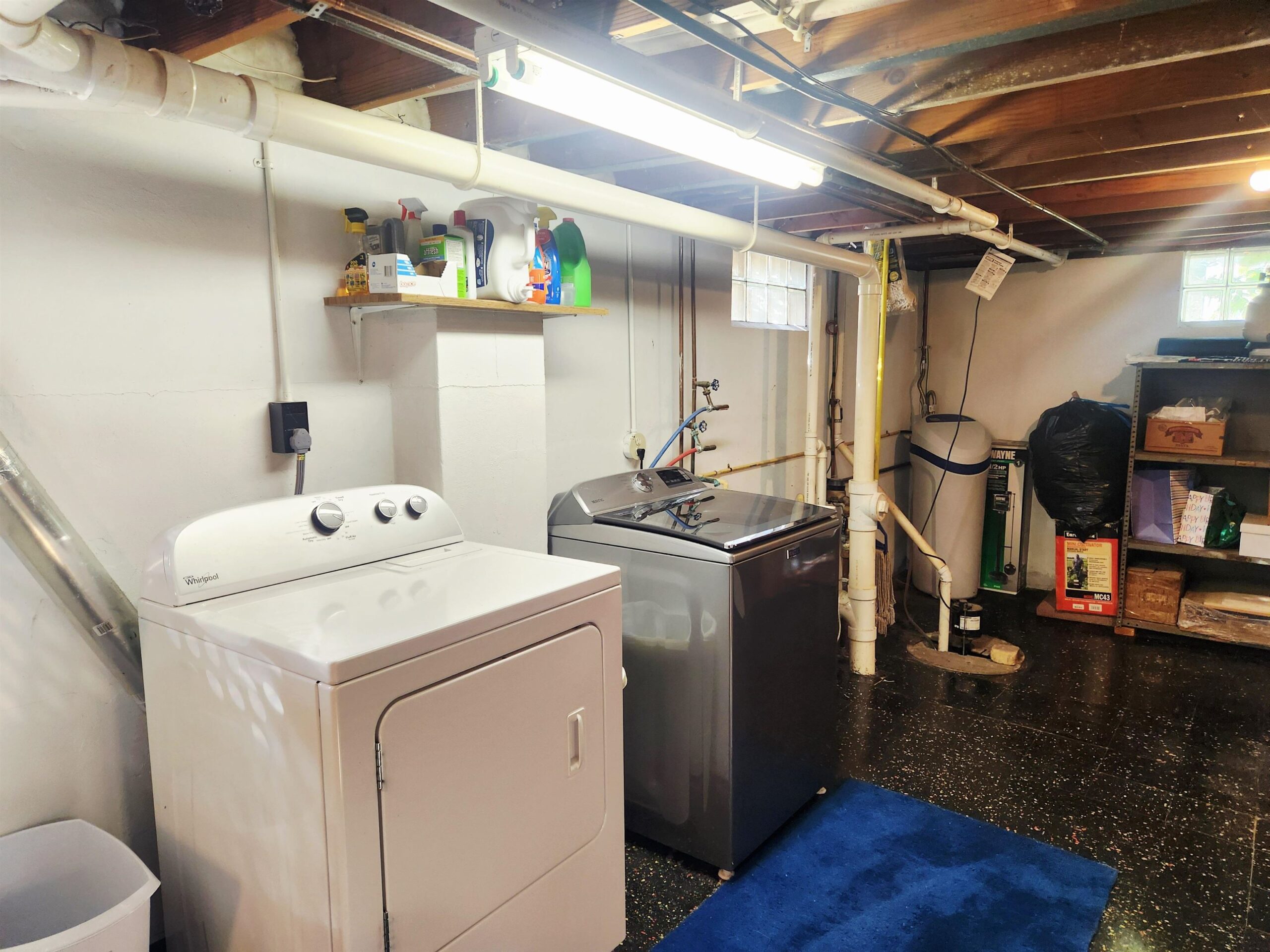 Stove, refrigerator, water softener, washer, dryer, blinds, work bench & couch in bsmt.