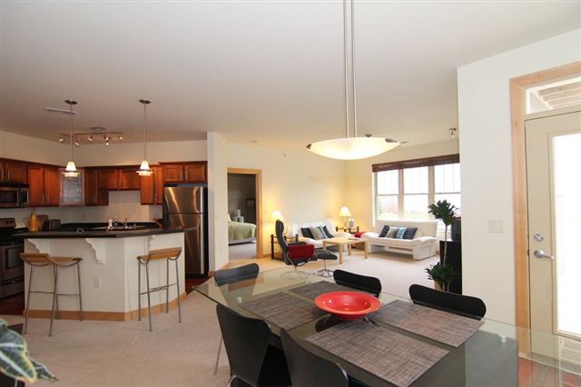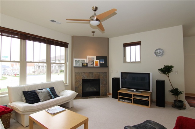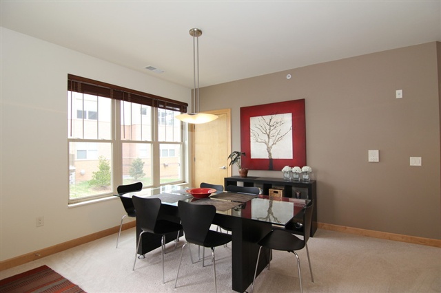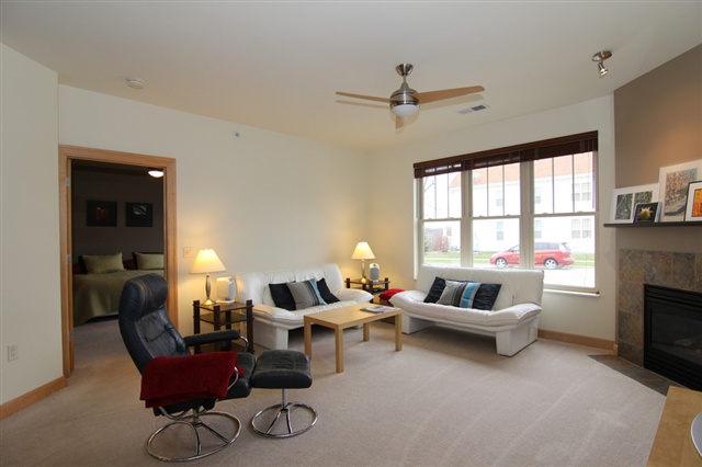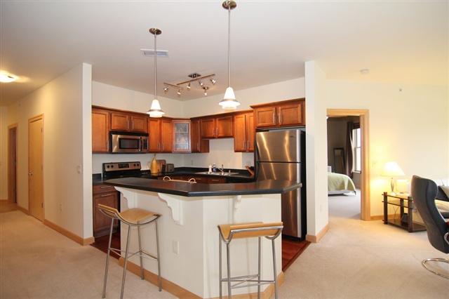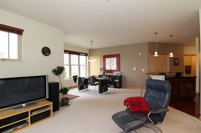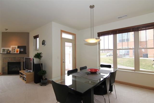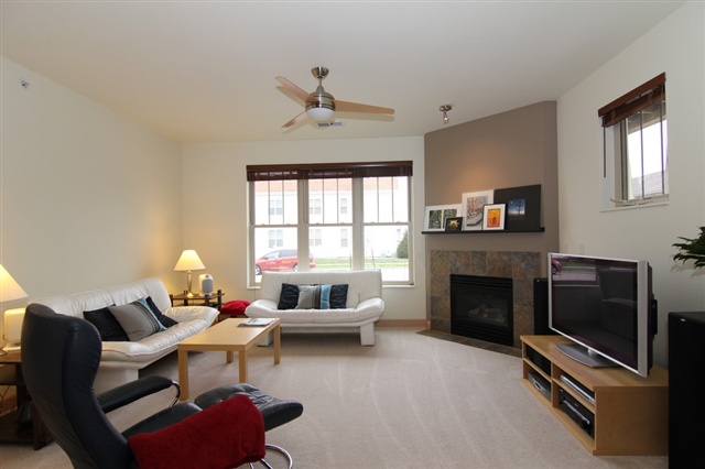 Condo Fees for a yr & $1500 closing cost credit w/ successful closing. Immaculate & move in ready first level corner unit! Open floor plan w/ tons of natural light. Great room includes kitchen, dining area & living room. Gas fireplace in the living room. Second bedroom & bath with granite counters & large closet. Large kitchen w/ solid surface countertops, all appliances. Large Master suite w/ a walk-in closet & double vanity. 9 ft ceilings, solid birch doors, custom trim & storage throughout. 2 Stalls!