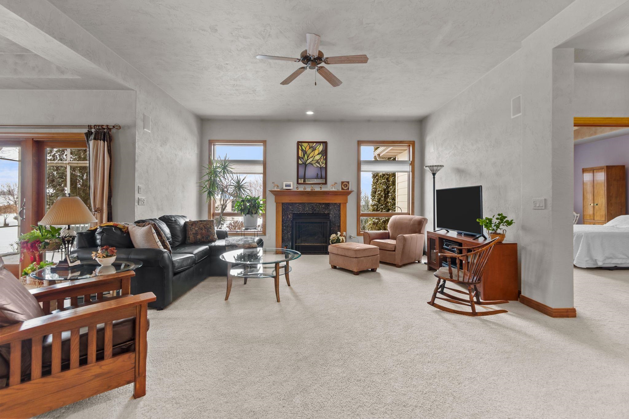 Custom-built home featuring a spacious foyer with hardwood floors and a private office with built-ins. The home offers peaceful pond views and an open-concept layout. The kitchen is equipped with maple cabinetry, quartz countertops, a center island with breakfast bar, walk-in pantry, and appliances included. Built-in speakers and a screened porch add to the home’s comfort and functionality. The primary suite features a private bath with dual vanities and a tiled shower. A second bedroom, full bath, and convenient laundry room complete the main level. The finished lower level includes a game room with multiple daylight windows for lots of natural light, full bath, walk-in closet, workshop area and a stairway with direct access to the garage. $200/month HOA fee covers lawn and snow.