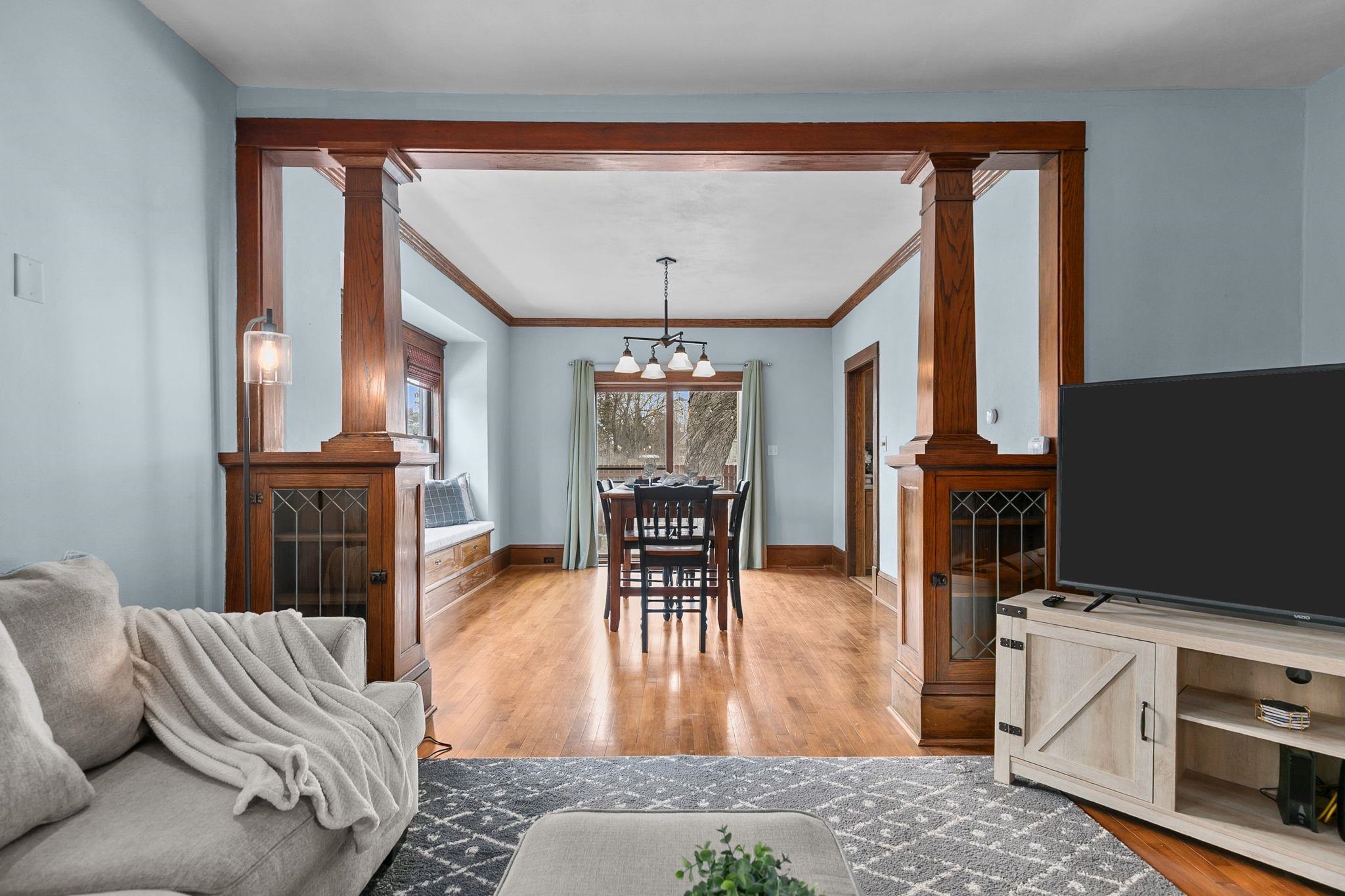 If you love original character, this stunner is sure to impress. This Appleton home features untouched millwork throughout the lower level, showcasing craftsmanship you rarely see today. Hardwood floors flow through most of the home, creating a warm, cohesive feel. The large living room is a showstopper, complete with stunning wood pillars off of the formal dining room and elegant French bifold glass doors that open to the entryway, giving a grand, open feel from the moment you walk in. The formal dining room offers direct access to the fully fenced backyard, perfect for gatherings or everyday living. A bright three-seasons porch is ideal for morning coffee or evening relaxation. Central A/C, forced air heat, and a one-car garage round out this well-kept home.