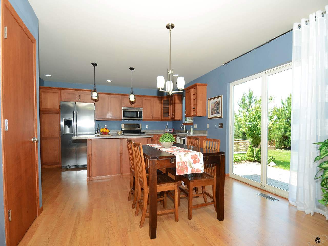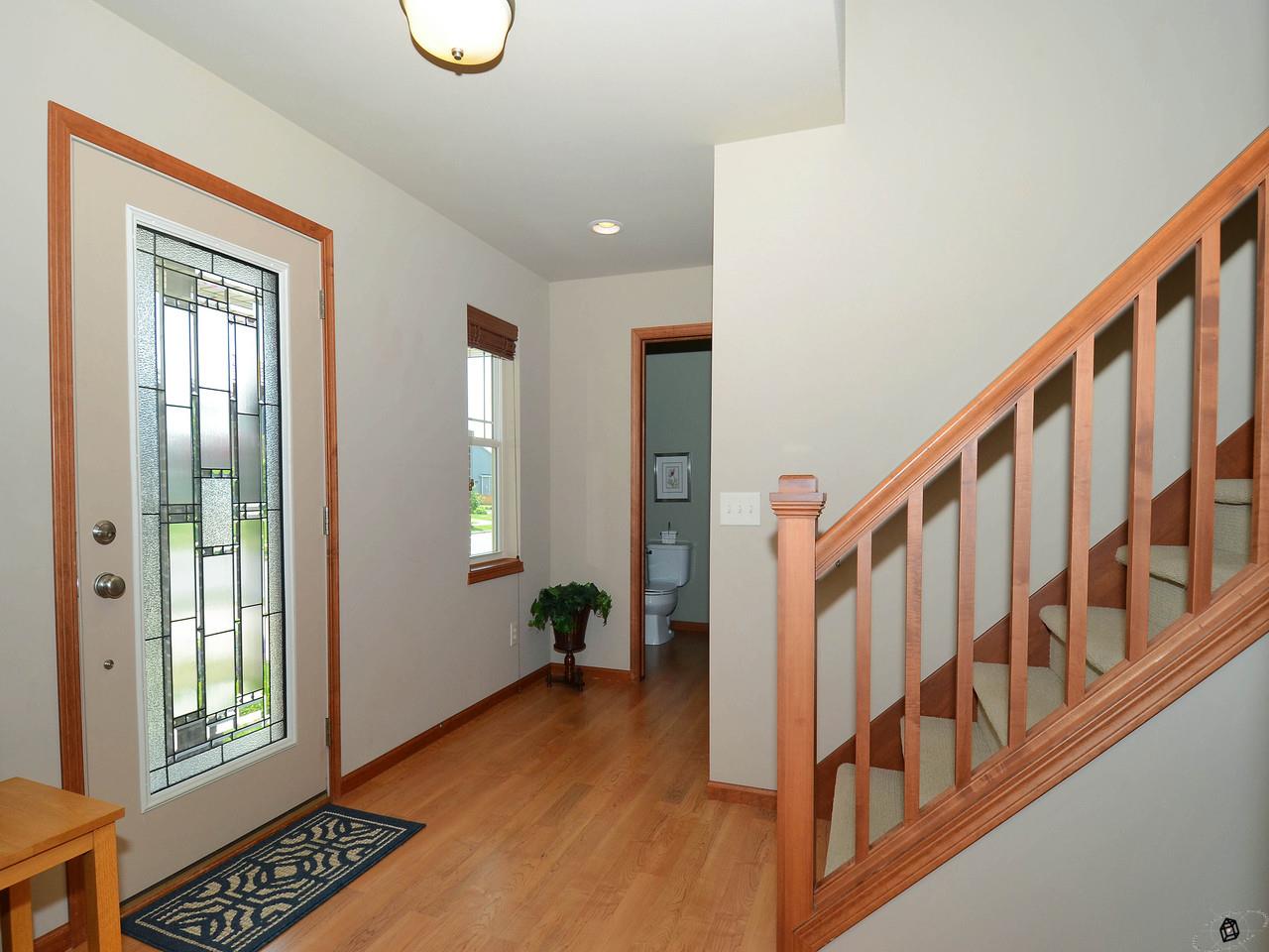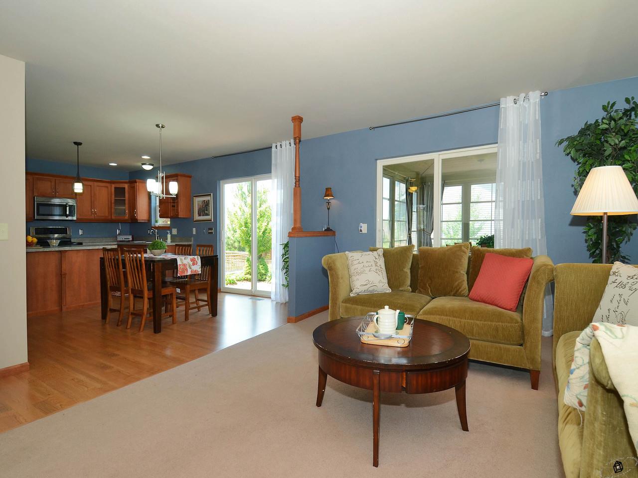 Relax on your 3 season porch and enjoy the "prettiest yard in the neighborhood". Fenced yard with stamped patio and landscaping provides privacy and room for a garden. Open floor plan with numerous custom upgrades including a stone fireplace, maple woodwork, chair rails & crown moldings throughout. Fantastic mudroom area with cabinetry, folding area and storage. Oversized garage. Energy efficient! Walk to the elementary school and playground, neighborhood park and walking trails.