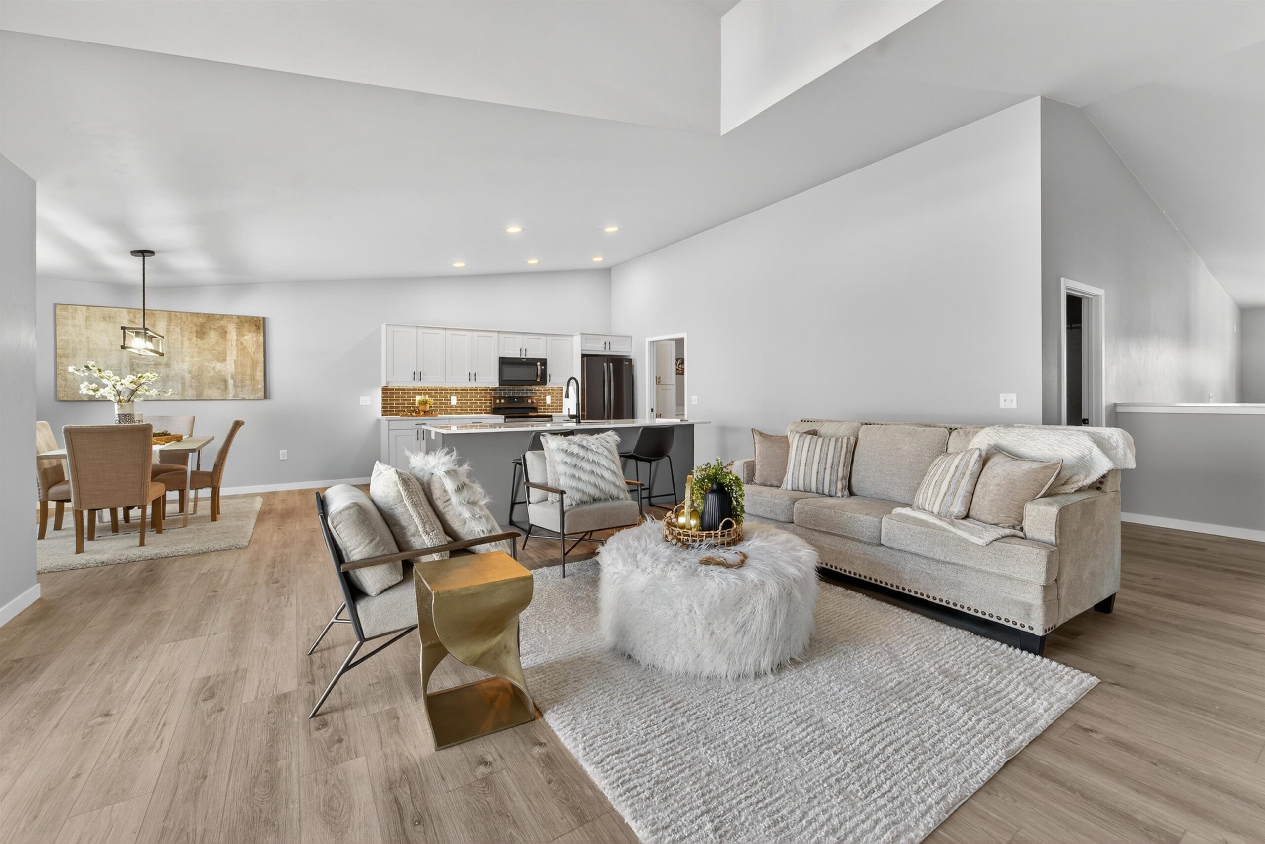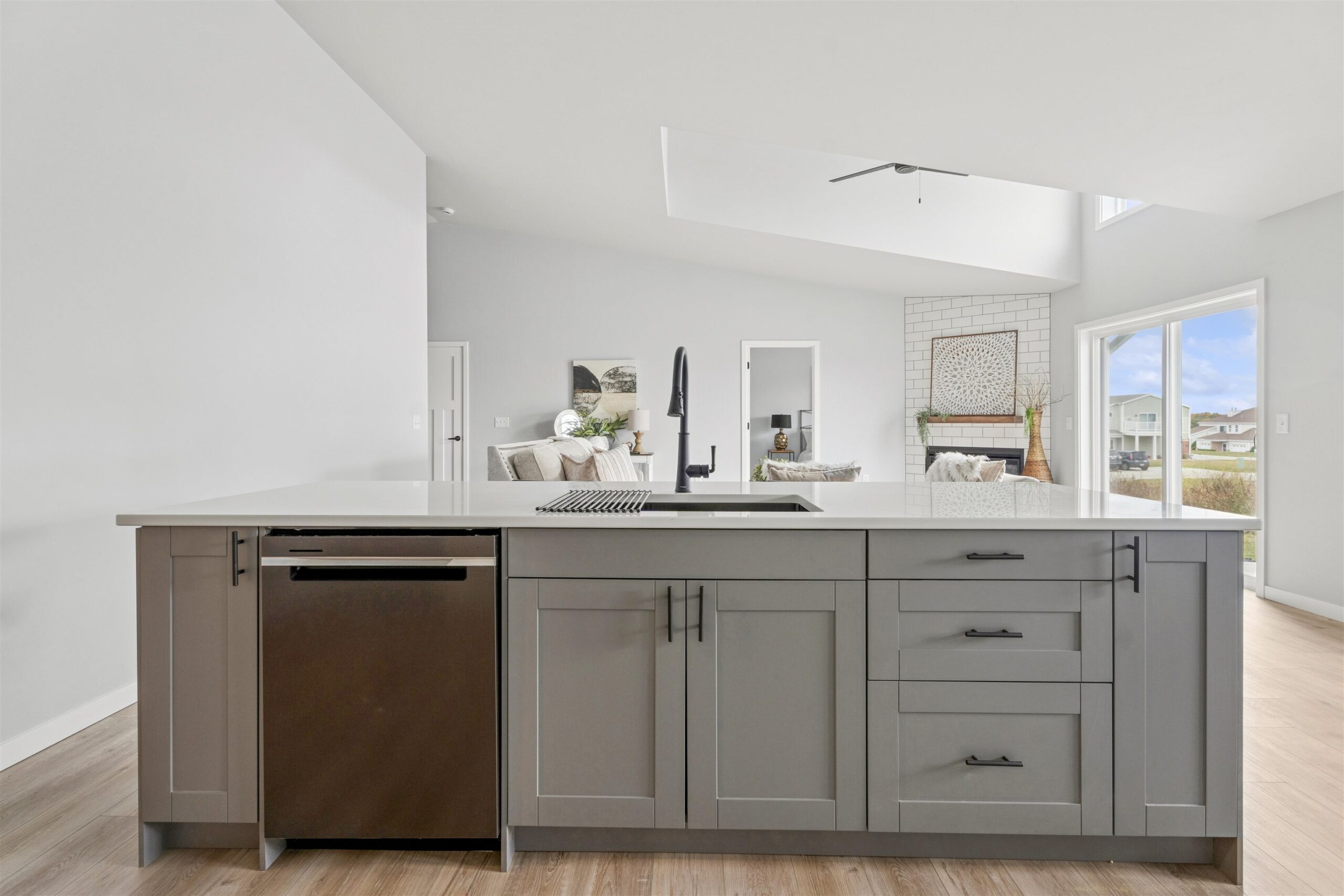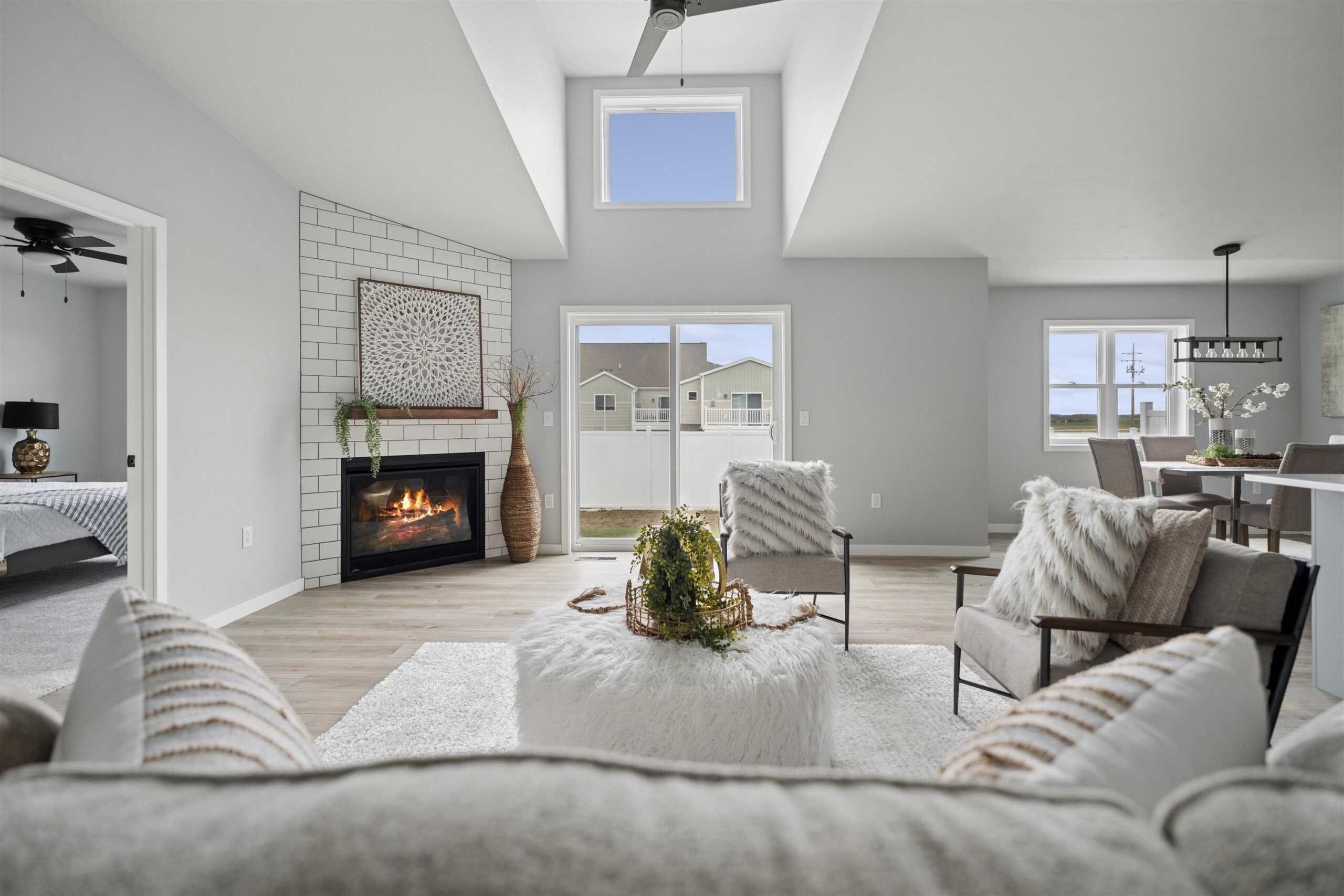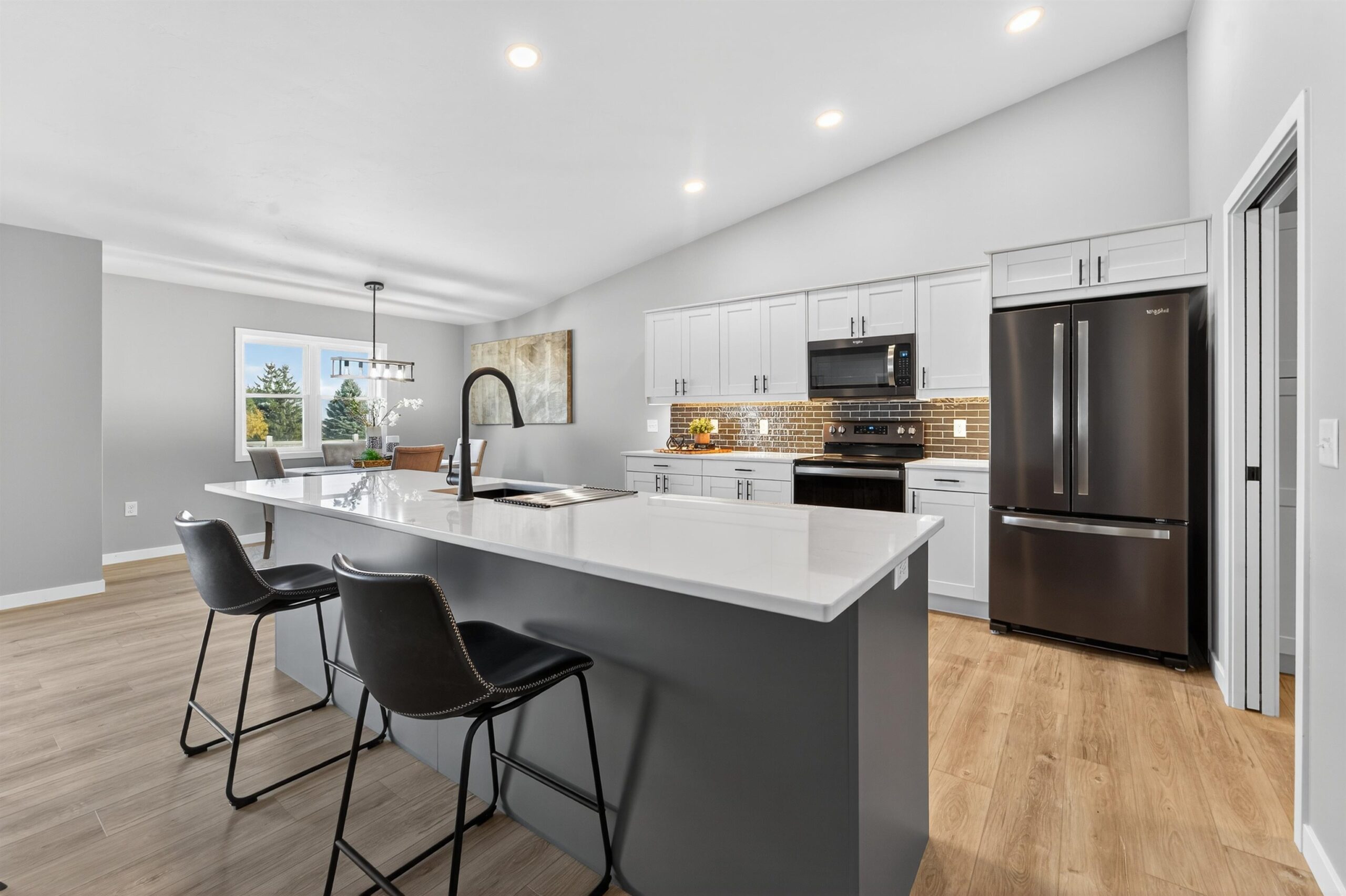 Quality-built condo featuring zero-step entry through the garage! Step inside to soaring cathedral ceilings in the living room accented by a cozy gas fireplace. The open-concept layout flows into the kitchen with Quartz countertops, glass back splash, black stainless-steel appliances, center island, pantry and a spacious adjacent dining area. The primary bedroom offers a walk-in closet and a private suite bath with a walk-in shower. Two additional generously sized bedrooms share a full main bath. Convenient first-floor laundry adds ease of living with washer and dryer included. The desirable lower level includes 3 egress windows—perfect for your future finishing needs. Enjoy the low HOA fee of $200 per month and plenty of surrounding green space.