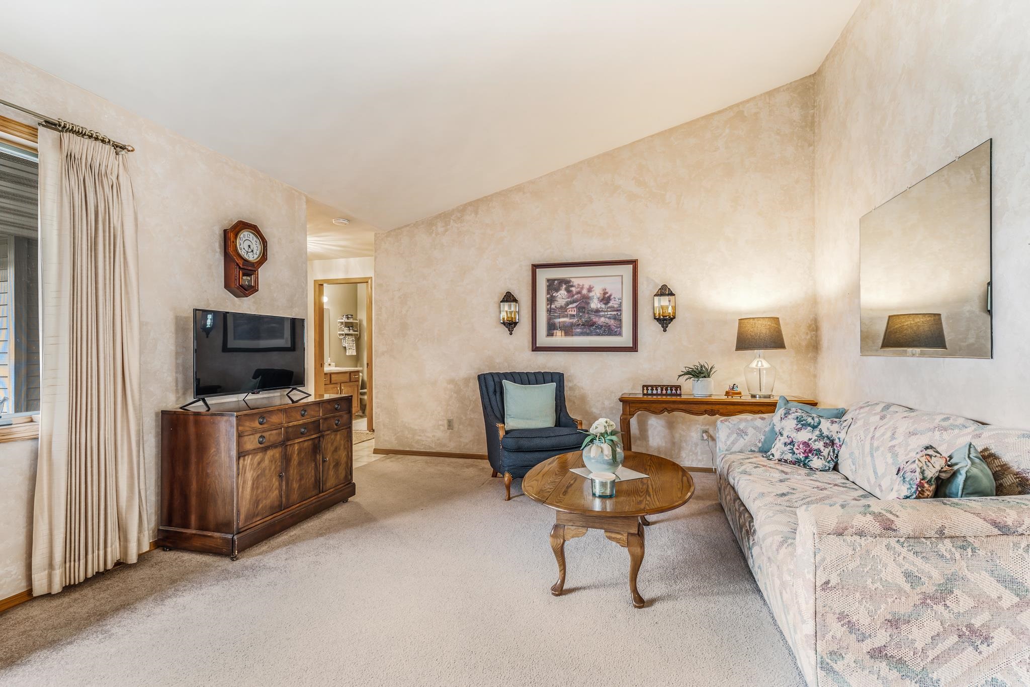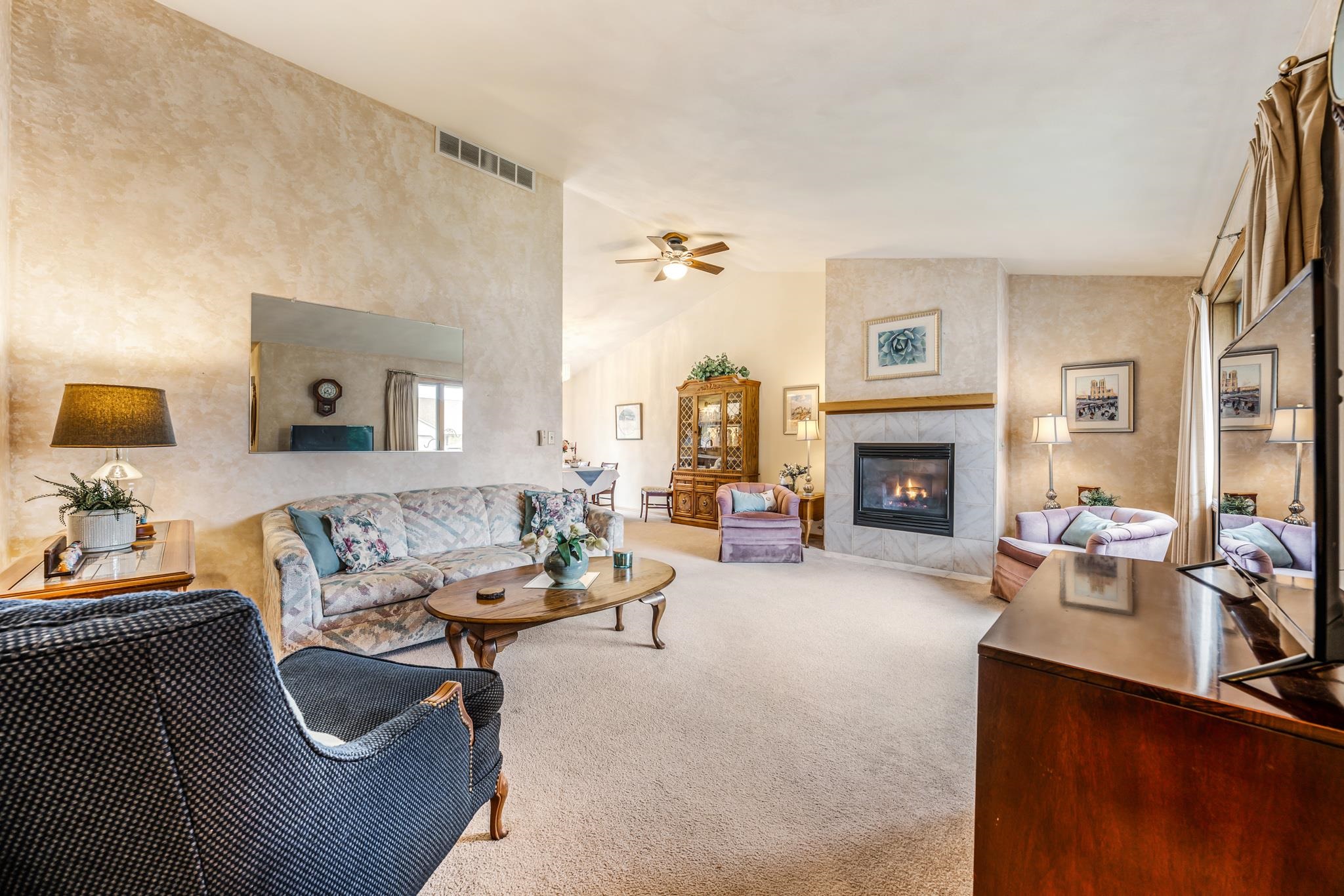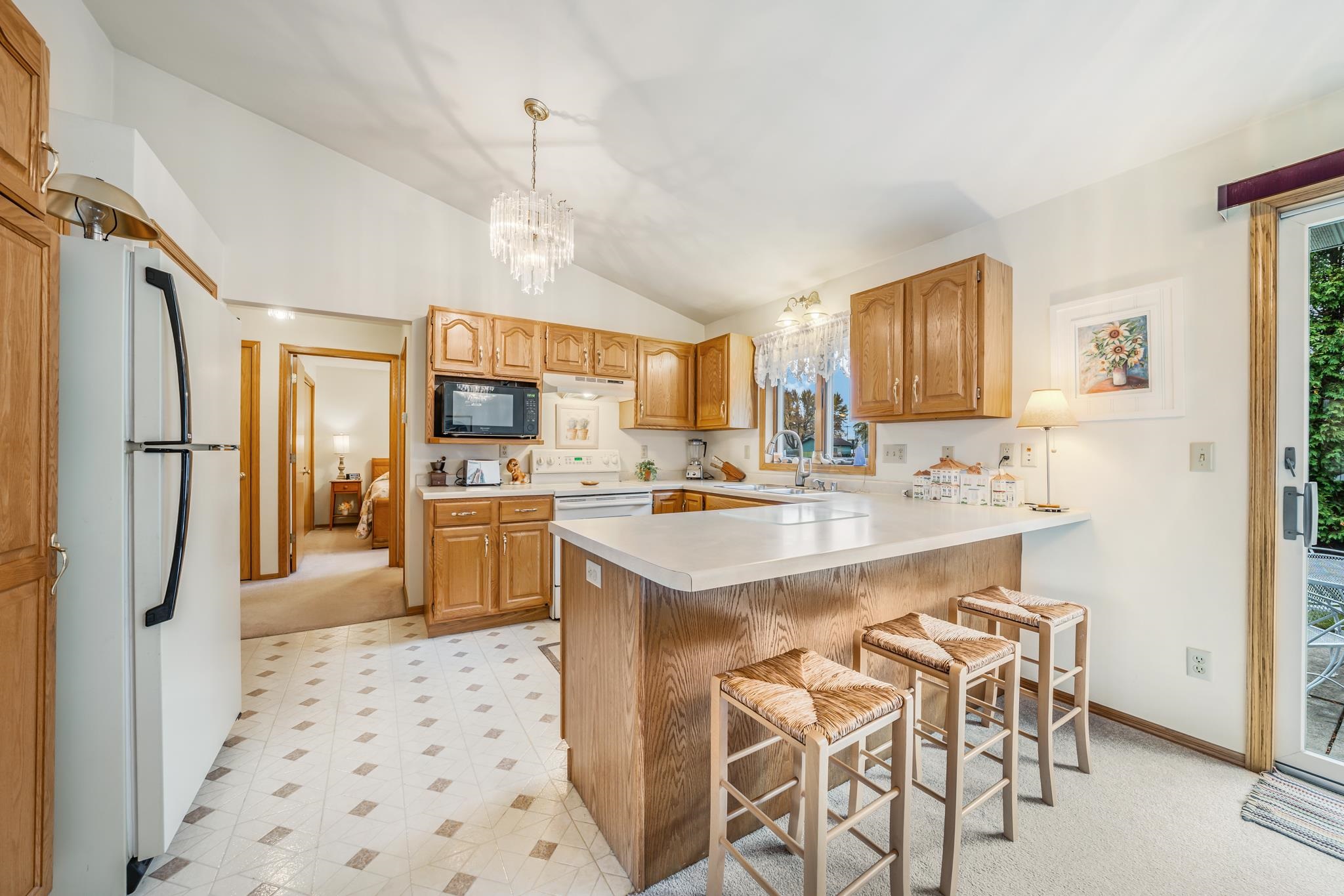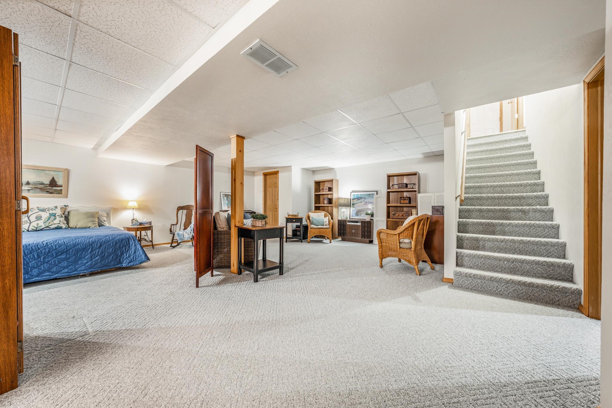 Warm and Welcoming! Thoughtfully designed layout with a spacious foyer, large closet, powder bath, and convenient first-floor laundry. Enjoy the open, sun-filled living and dining rooms with vaulted ceilings and sliding doors leading to a private patio and backyard oasis. The kitchen offers generous cabinetry, two pantries, and a full appliance package. Primary bedroom features both a walk-in and a king-size bonus closet; a second bedroom completes the main floor. The finished lower level feels like a studio suite—bedroom, family room, powder bath (with space for a shower), without the Kit, ideal for guests, or a king-size Great Room for gatherings, plus an office/exercise area. Two-car garage, quiet low-traffic setting, and easy highway access. Come and check this gem out!