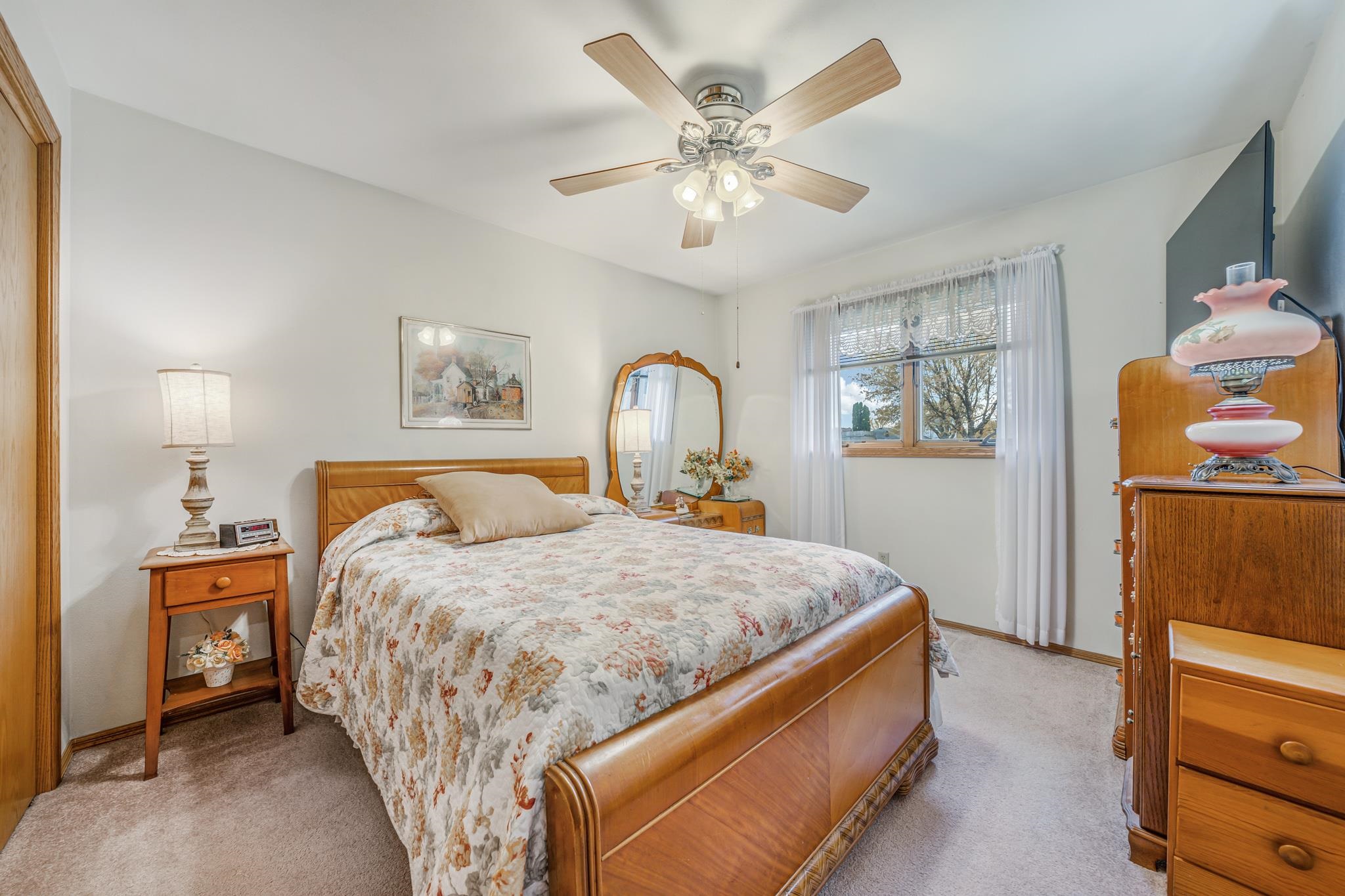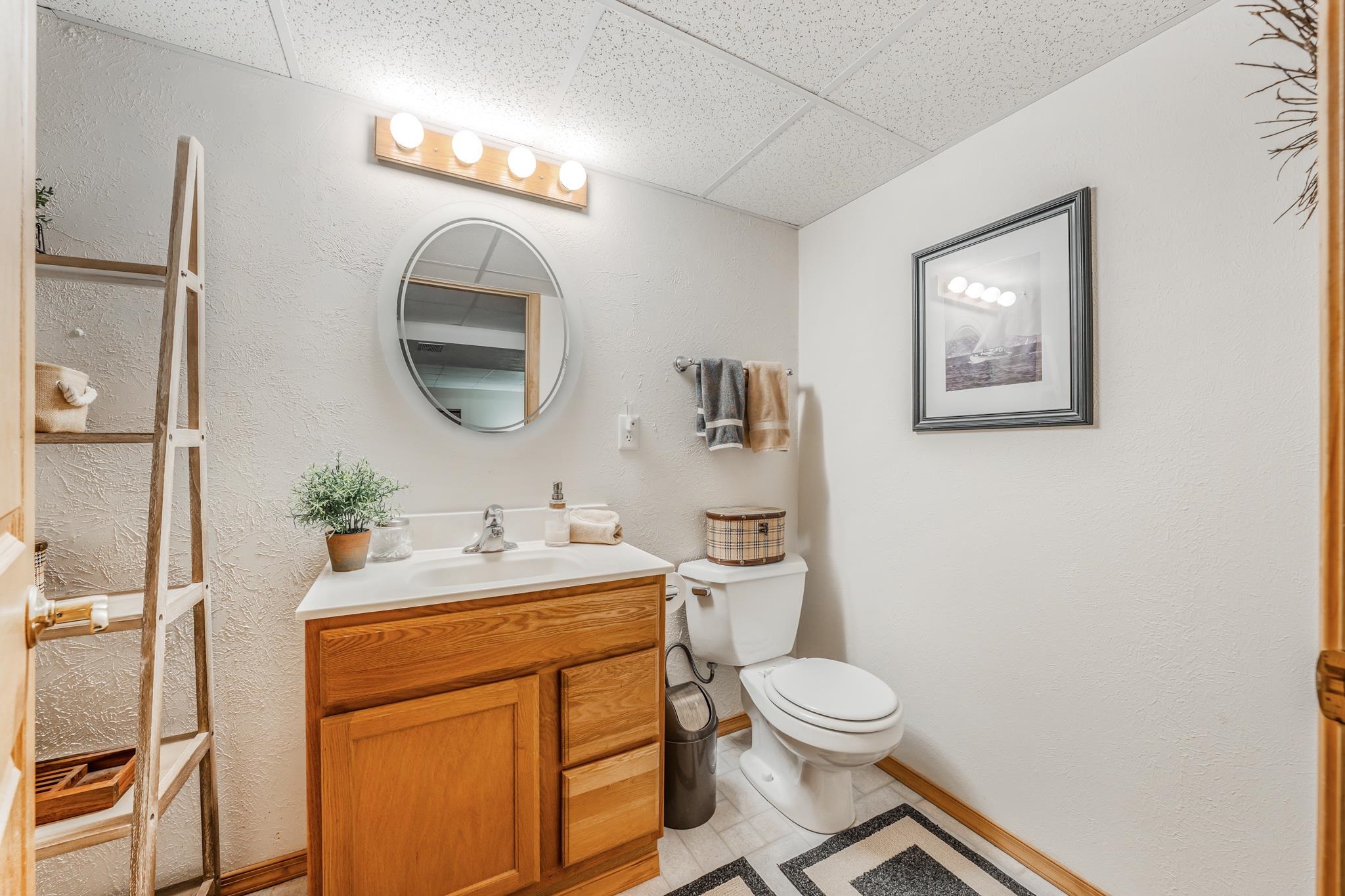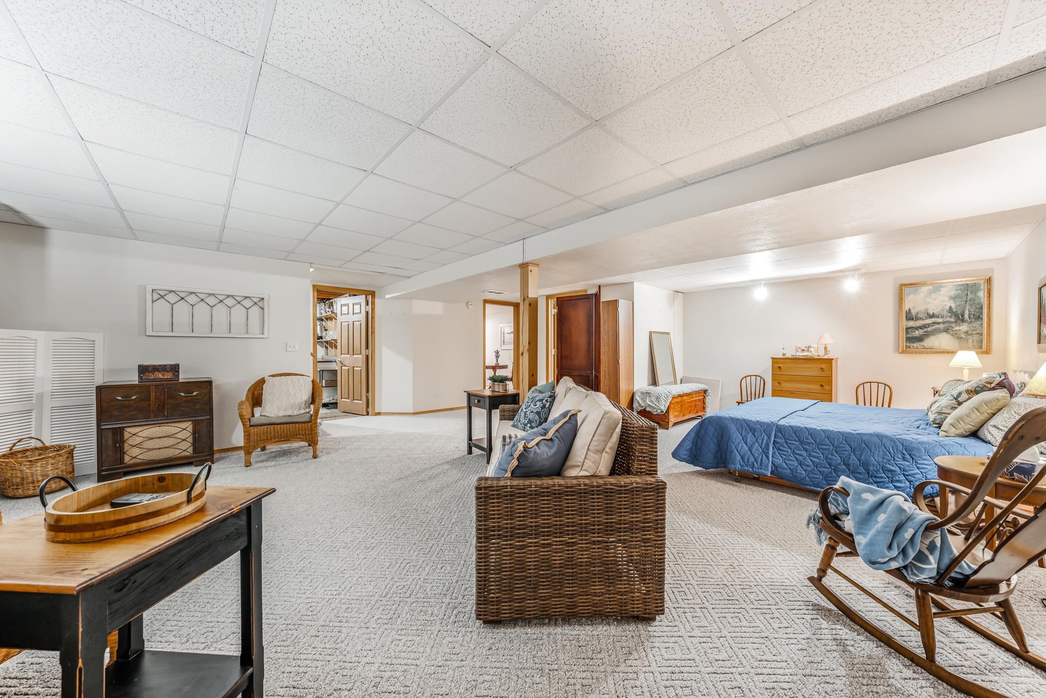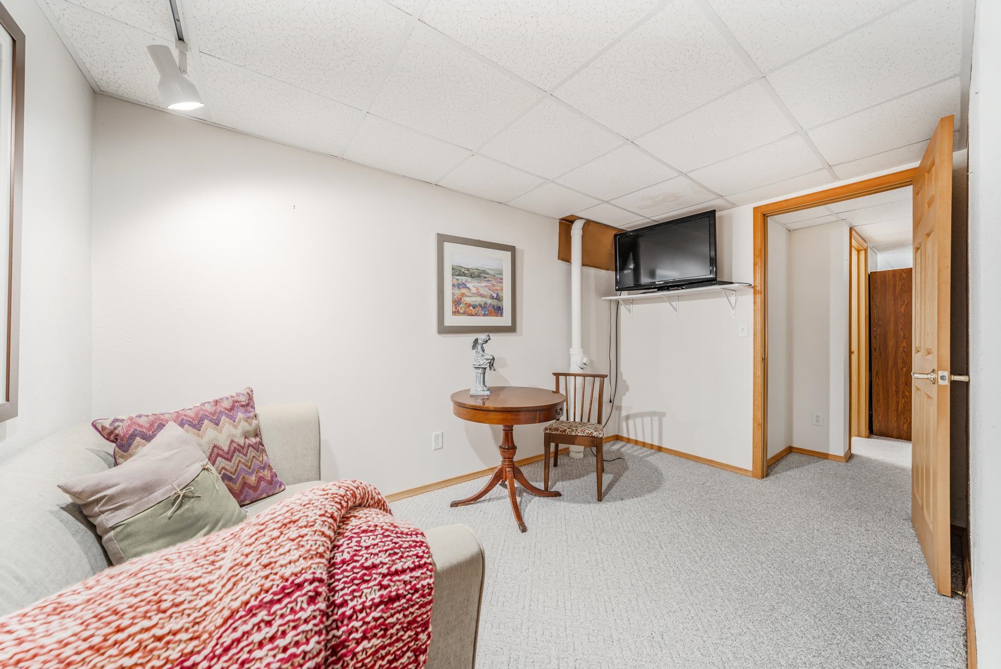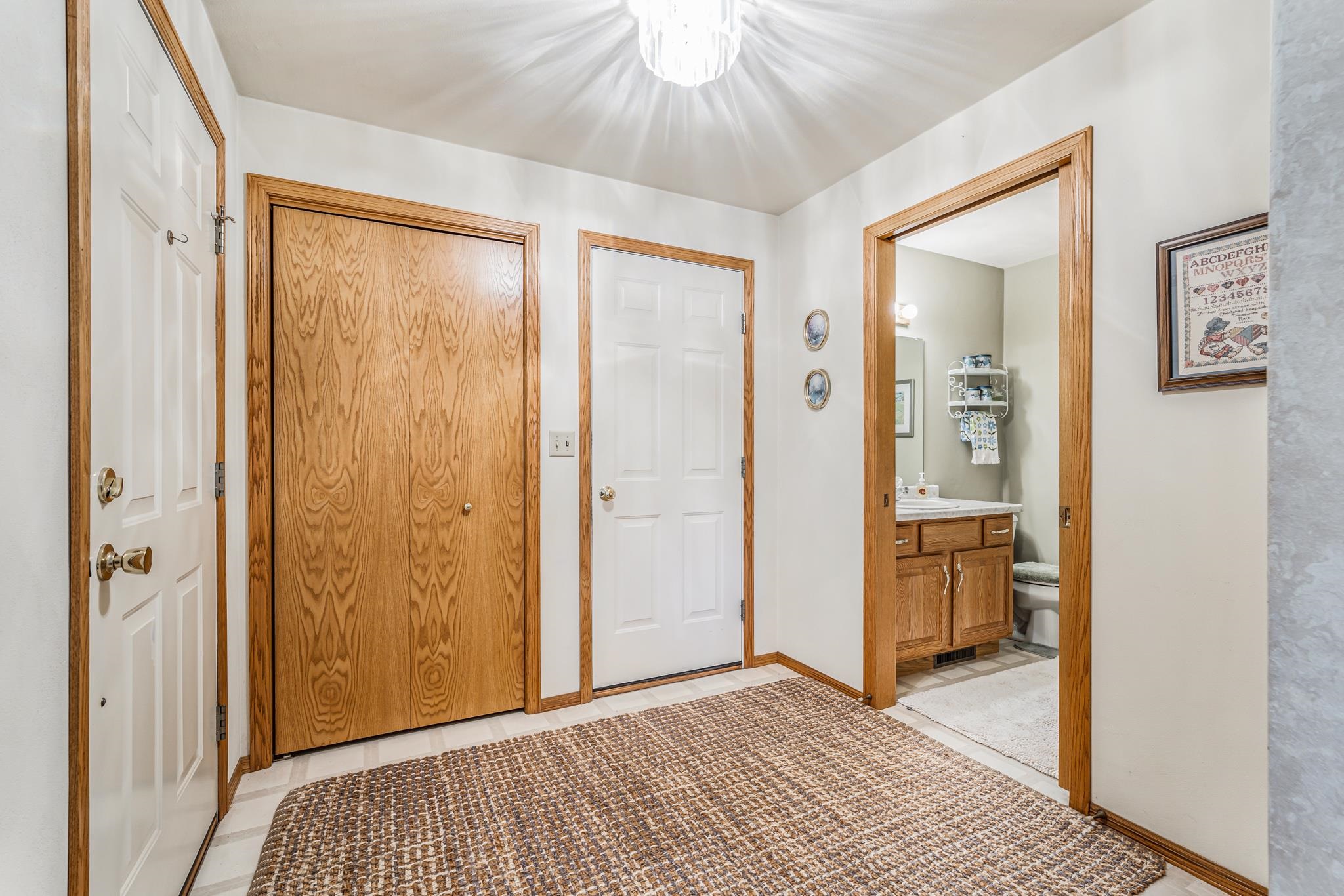 Warm and Welcoming! Thoughtfully designed layout with a spacious foyer, large closet, powder bath, and convenient first-floor laundry. Enjoy the open, sun-filled living and dining rooms with vaulted ceilings and sliding doors leading to a private patio and backyard oasis. The kitchen offers generous cabinetry, two pantries, and a full appliance package. Primary bedroom features both a walk-in and a king-size bonus closet; a second bedroom completes the main floor. The finished lower level feels like a studio suite—bedroom, family room, powder bath (with space for a shower), without the Kit, ideal for guests, or a king-size Great Room for gatherings, plus an office/exercise area. Two-car garage, quiet low-traffic setting, and easy highway access. Come and check this gem out!