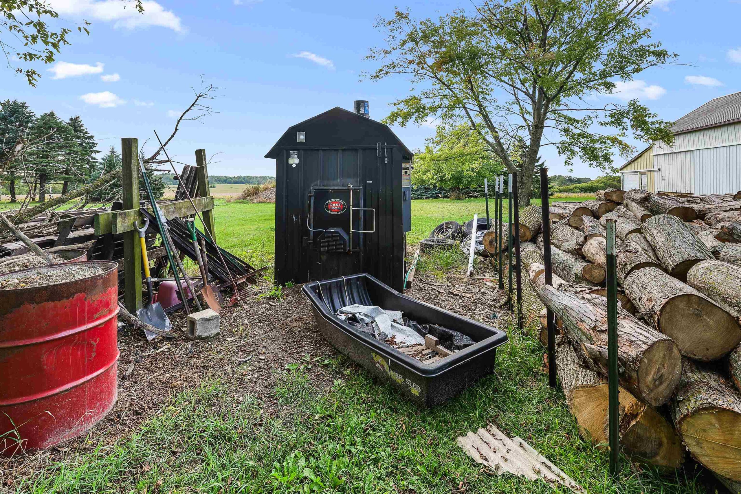 Refrigerator, Stove/Oven, Washer, Dryer, wood pile, outdoor burner (Central Boiler), GDO remotes (2).