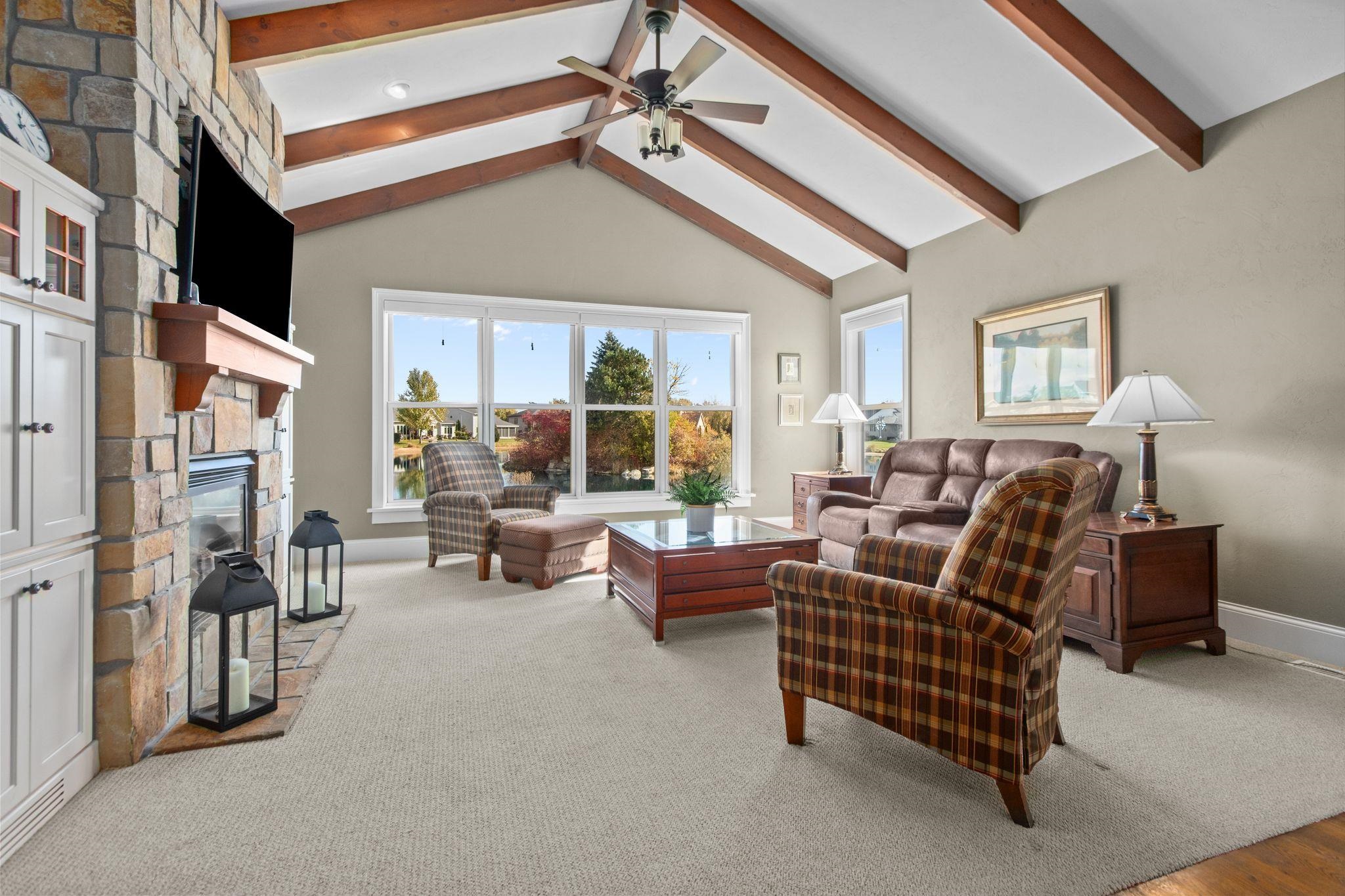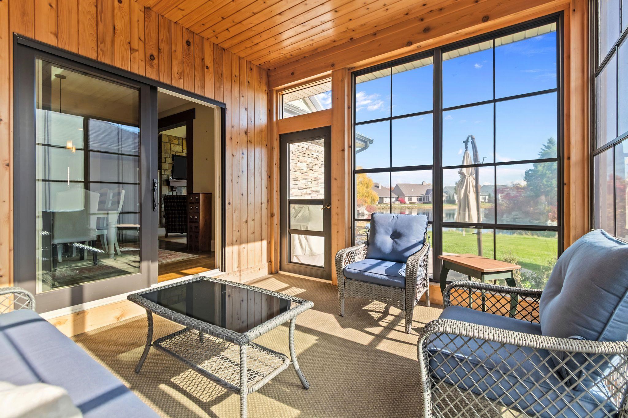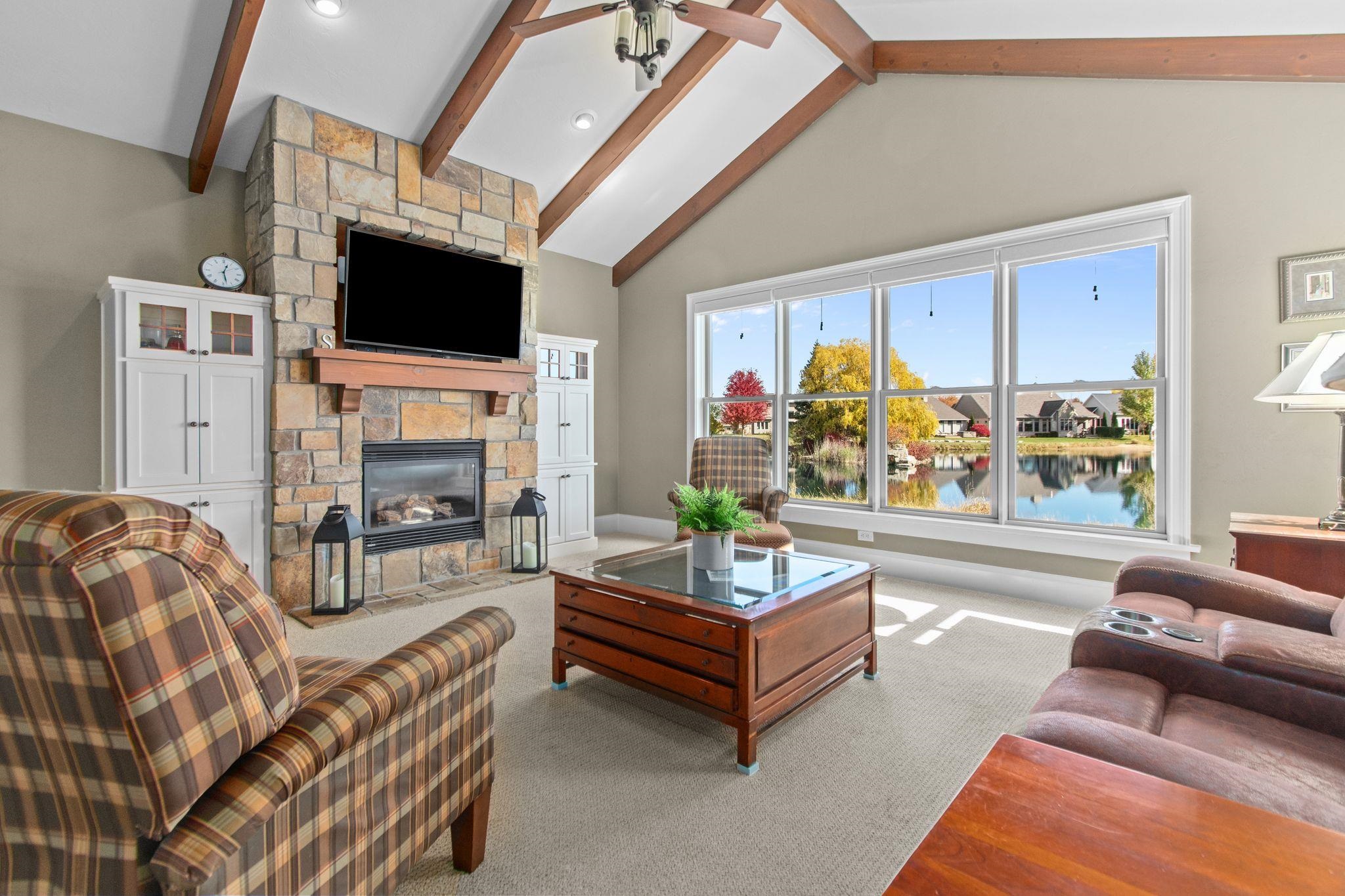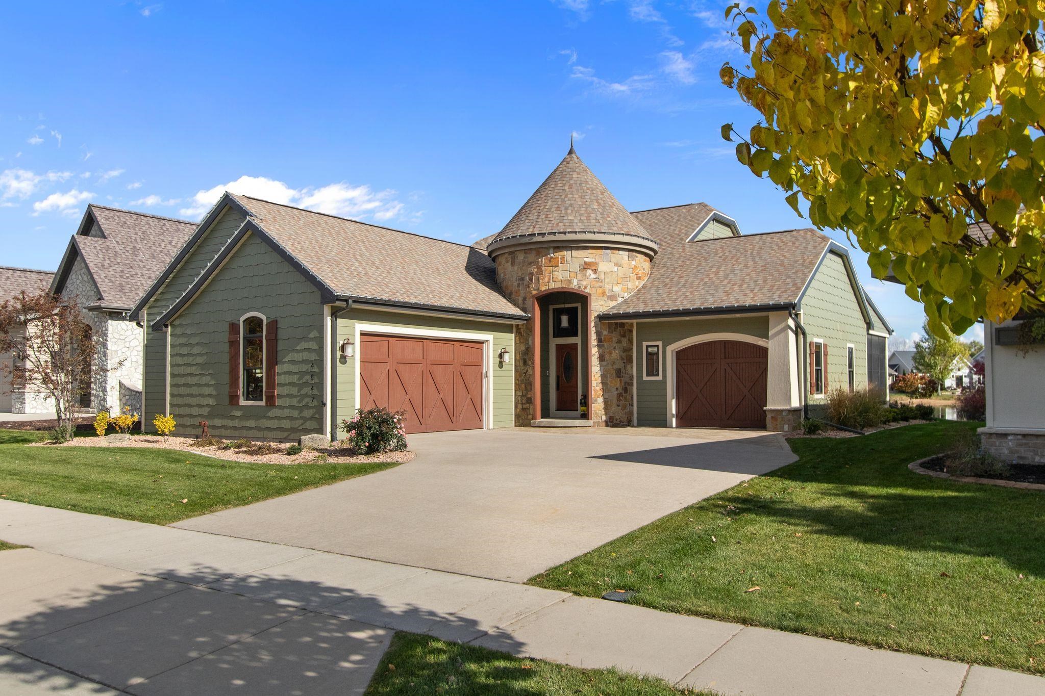 Wonderful opportunity for homeownership in this Griffin-built home showcasing quality craftsmanship throughout. Open-concept main floor features a great room with gas fireplace and wall of windows overlooking the shared pond. Spacious kitchen with large center island, walk-in pantry, painted cabinets, and stainless appliances. Oversized dining area with access to the 3-seasons room. Custom master suite with walk-in shower, water closet and walk-through closet to laundry room. Large rear entry w/cabinets and locker space. Upper level offers bedrooms 2 & 3, each with walk-in closets and shared full bath. Lower level partially finished w/large family room. Split attached 2.5-car and 1.5-car garages. New roof and additional solar heat source. Seller requests 48 hours to respond to all offers.