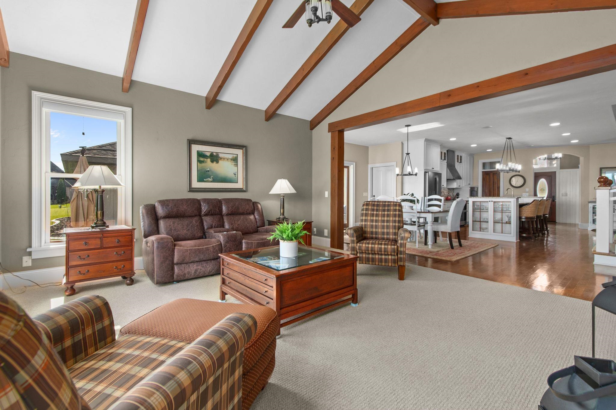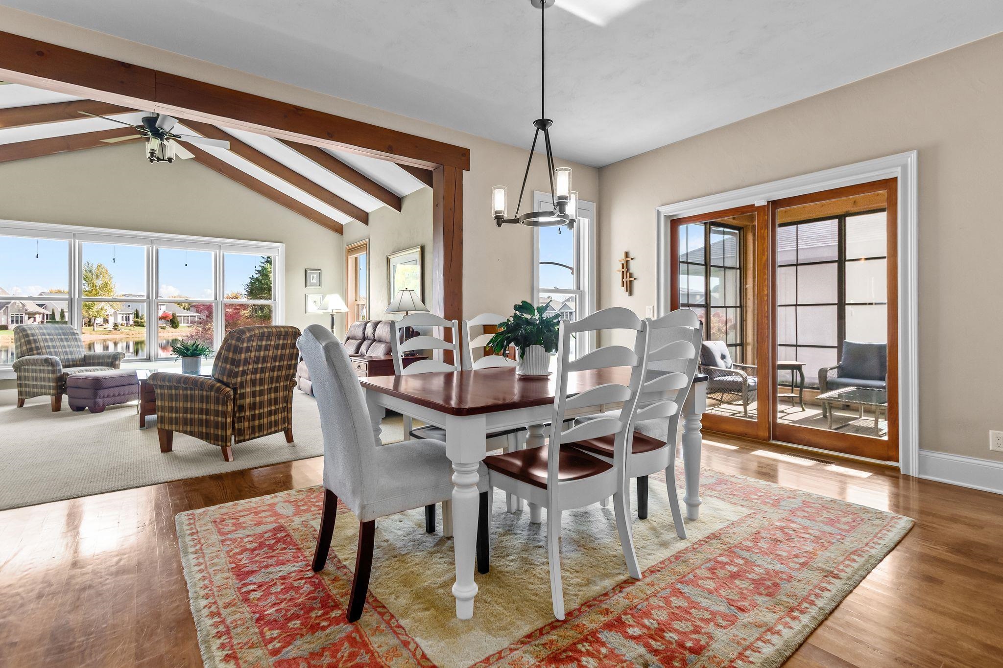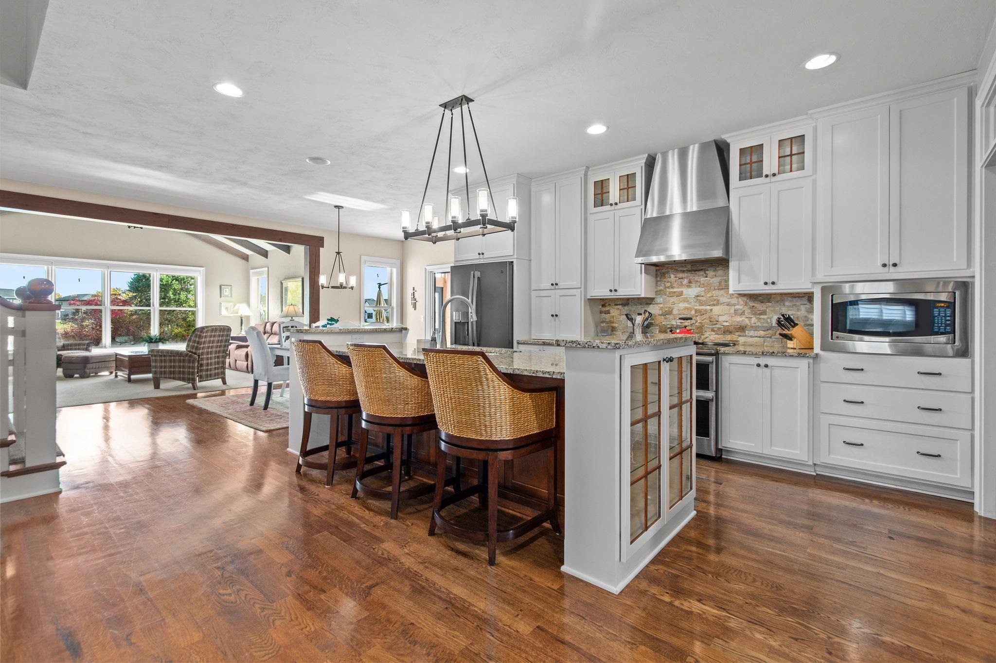 Wonderful opportunity for homeownership in this Griffin-built home showcasing quality craftsmanship throughout. Open-concept main floor features a great room with gas fireplace and wall of windows overlooking the shared pond. Spacious kitchen with large center island, walk-in pantry, painted cabinets, and stainless appliances. Oversized dining area with access to the 3-seasons room. Custom master suite with walk-in shower, water closet and walk-through closet to laundry room. Large rear entry w/cabinets and locker space. Upper level offers bedrooms 2 & 3, each with walk-in closets and shared full bath. Lower level partially finished w/large family room. Split attached 2.5-car and 1.5-car garages. New roof and additional solar heat source. Seller requests 48 hours to respond to all offers.