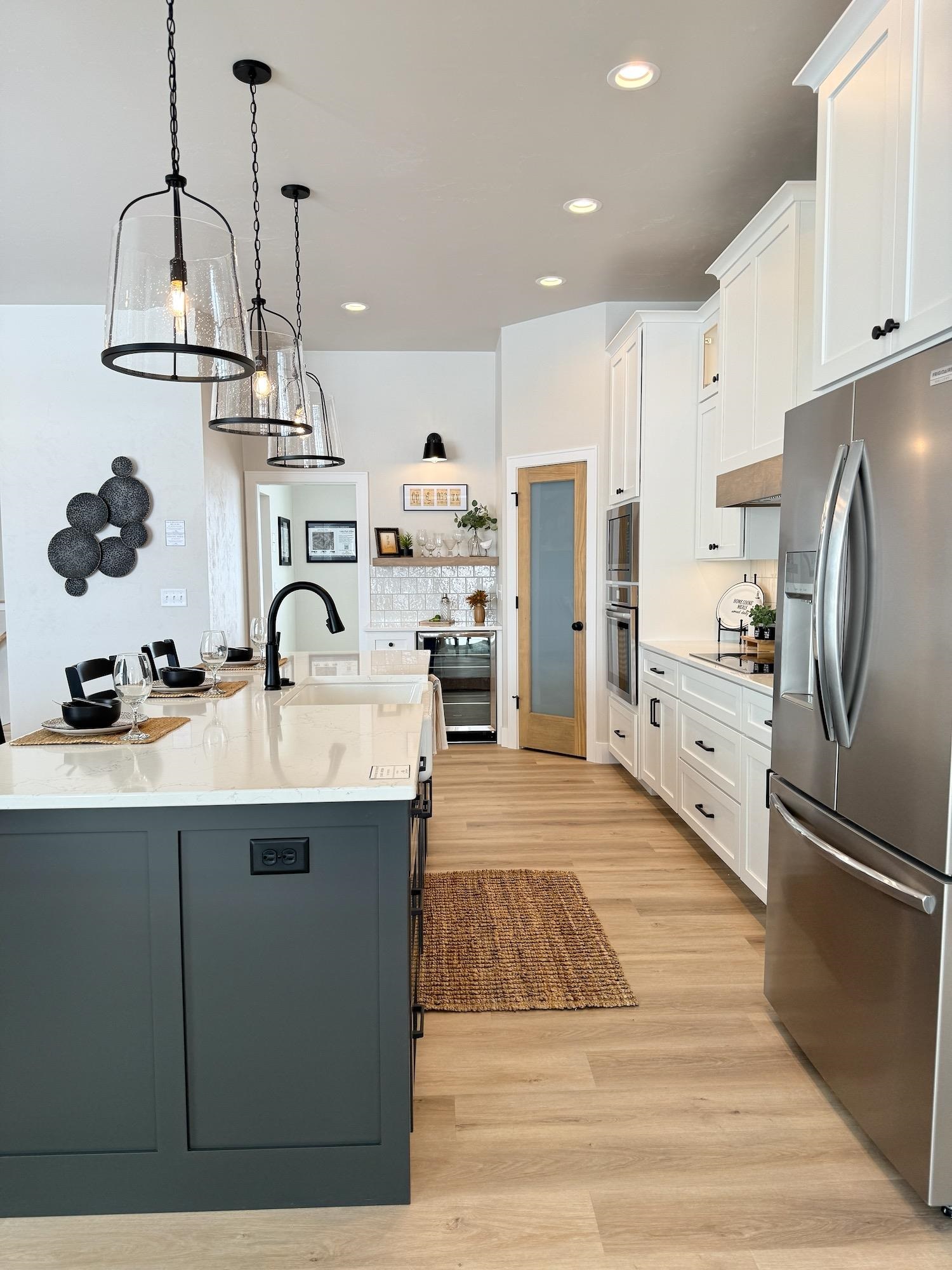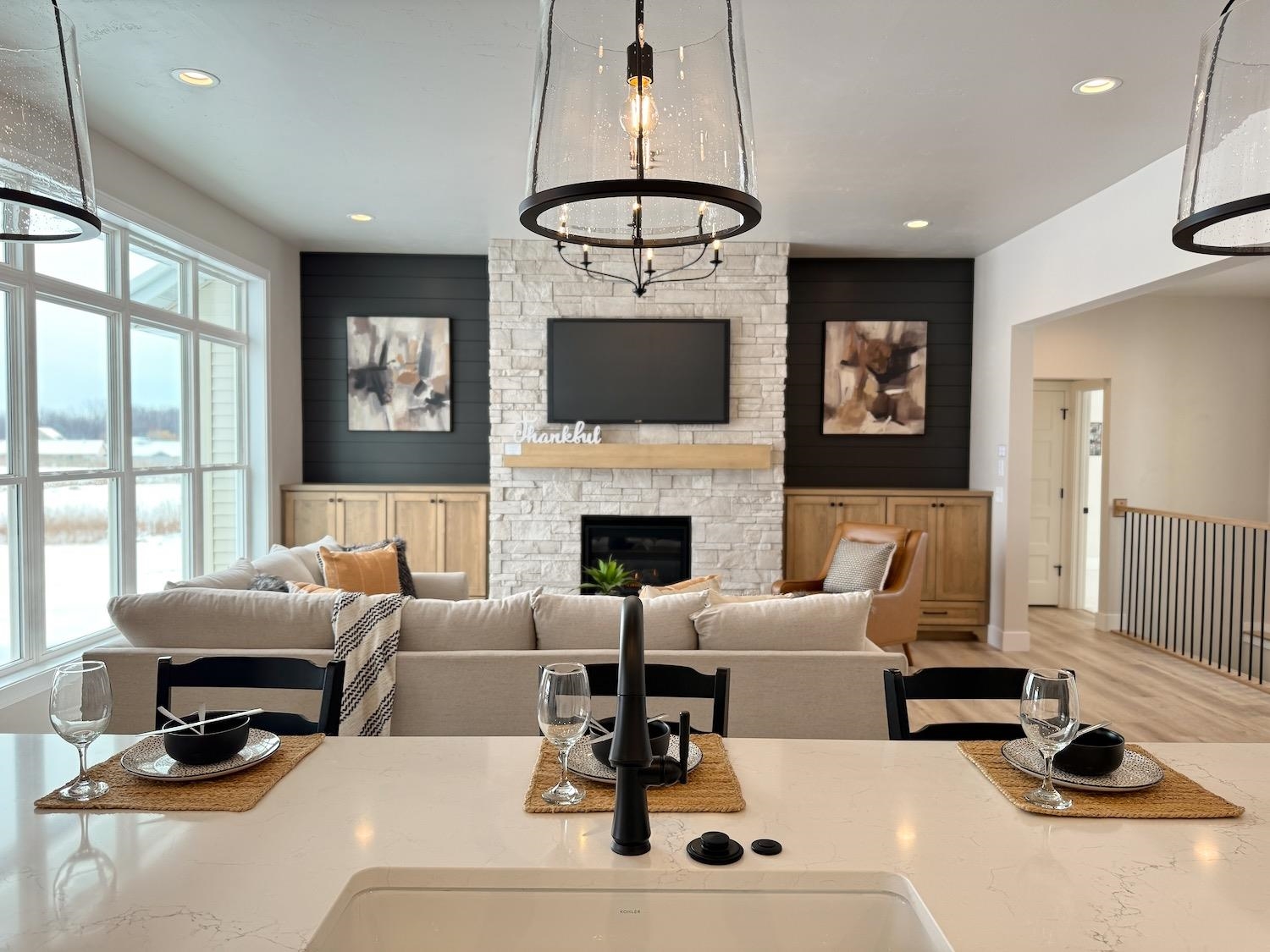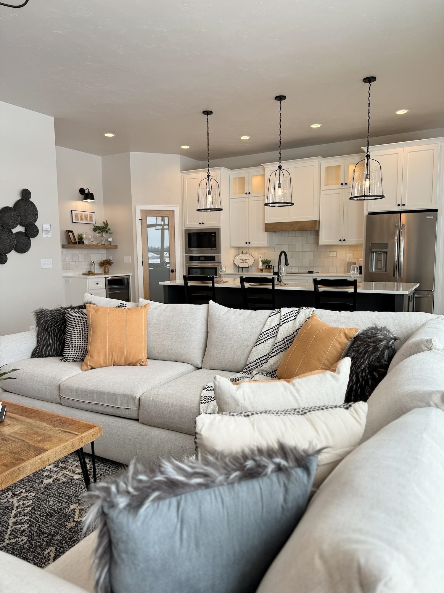 This split-bedroom ranch offers an open layout with 10' ceilings in the kitchen and great room, plus a stone fireplace with custom built-ins. The spacious primary suite includes a walk-in closet and a spa-like bath with freestanding tub and tiled shower. Enjoy first-floor laundry, an office, mudroom, and a large kitchen island perfect for gatherings. The finished lower level adds extra living space, and the 3-car garage features an extra-deep 36’ third stall. Stylish shiplap finishes and beautiful tilework throughout. Set on over an acre with city sewer and water—private feel with in-town perks!