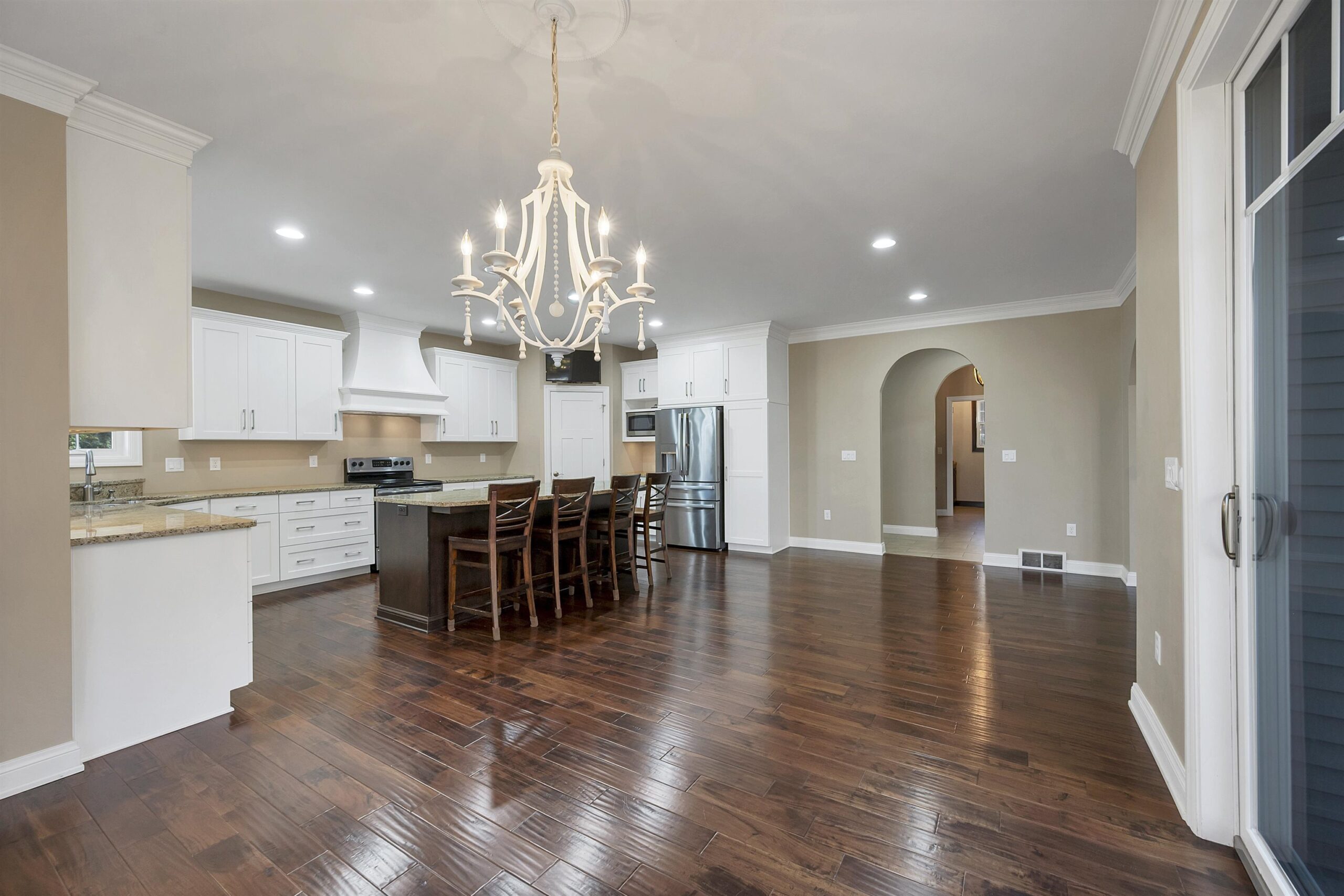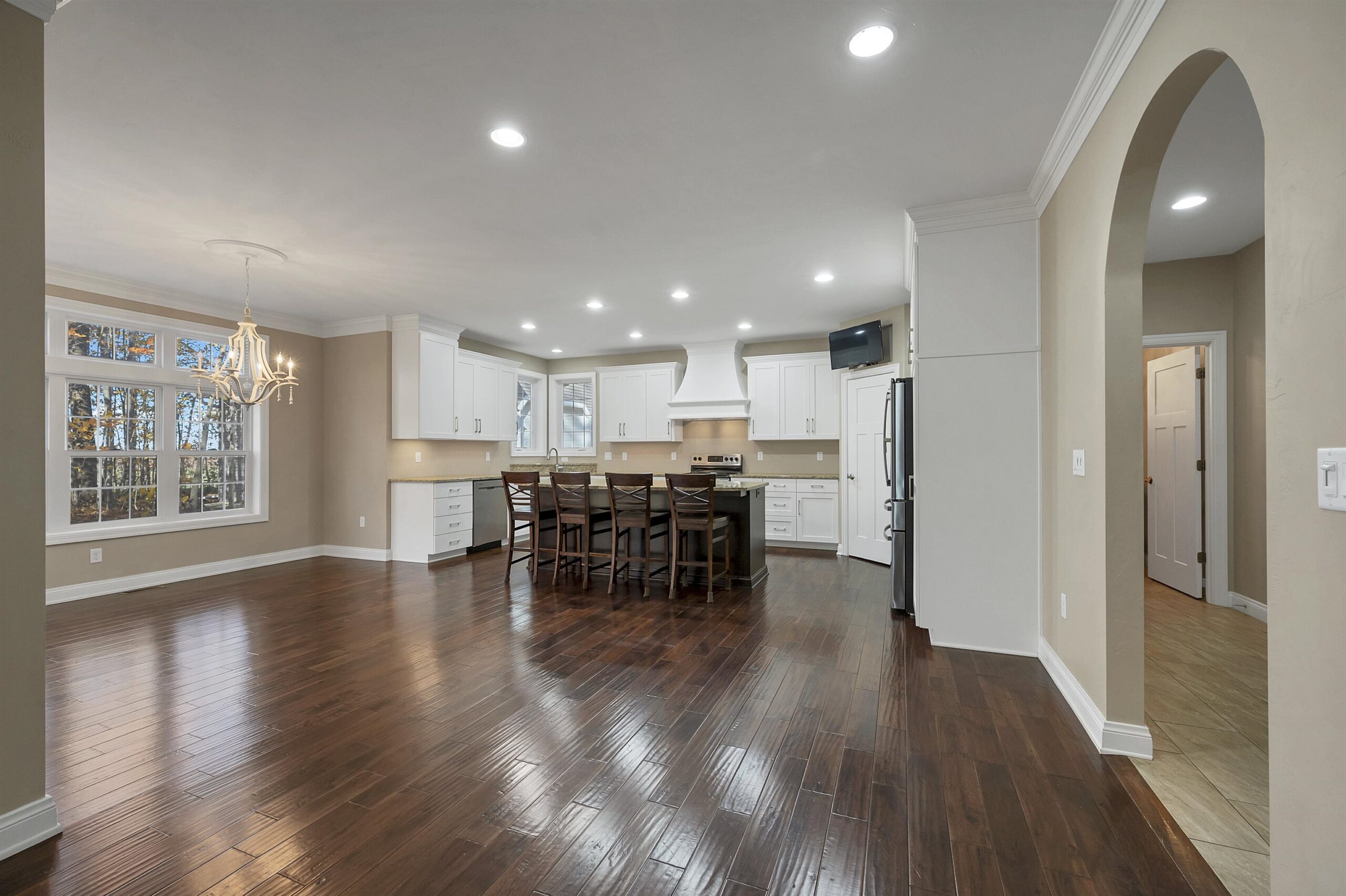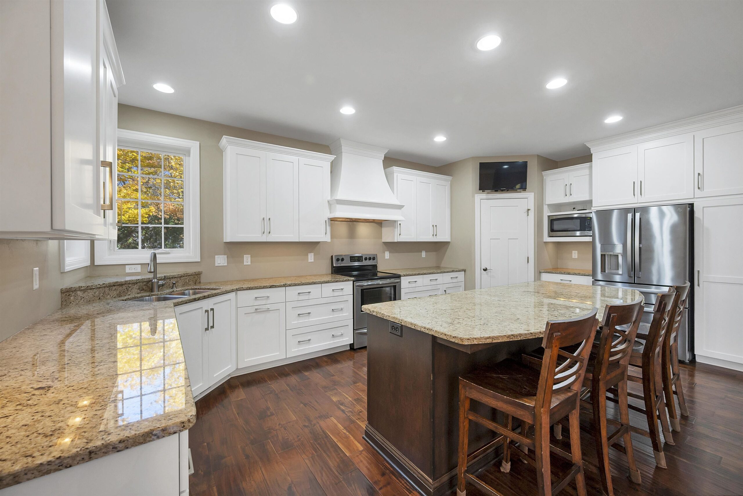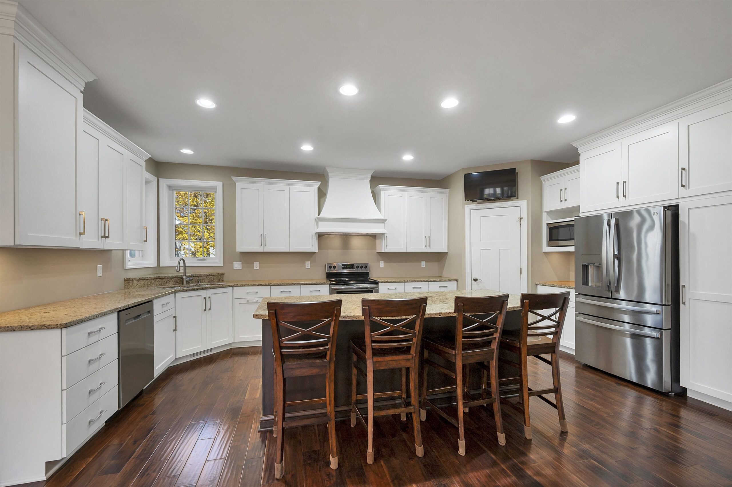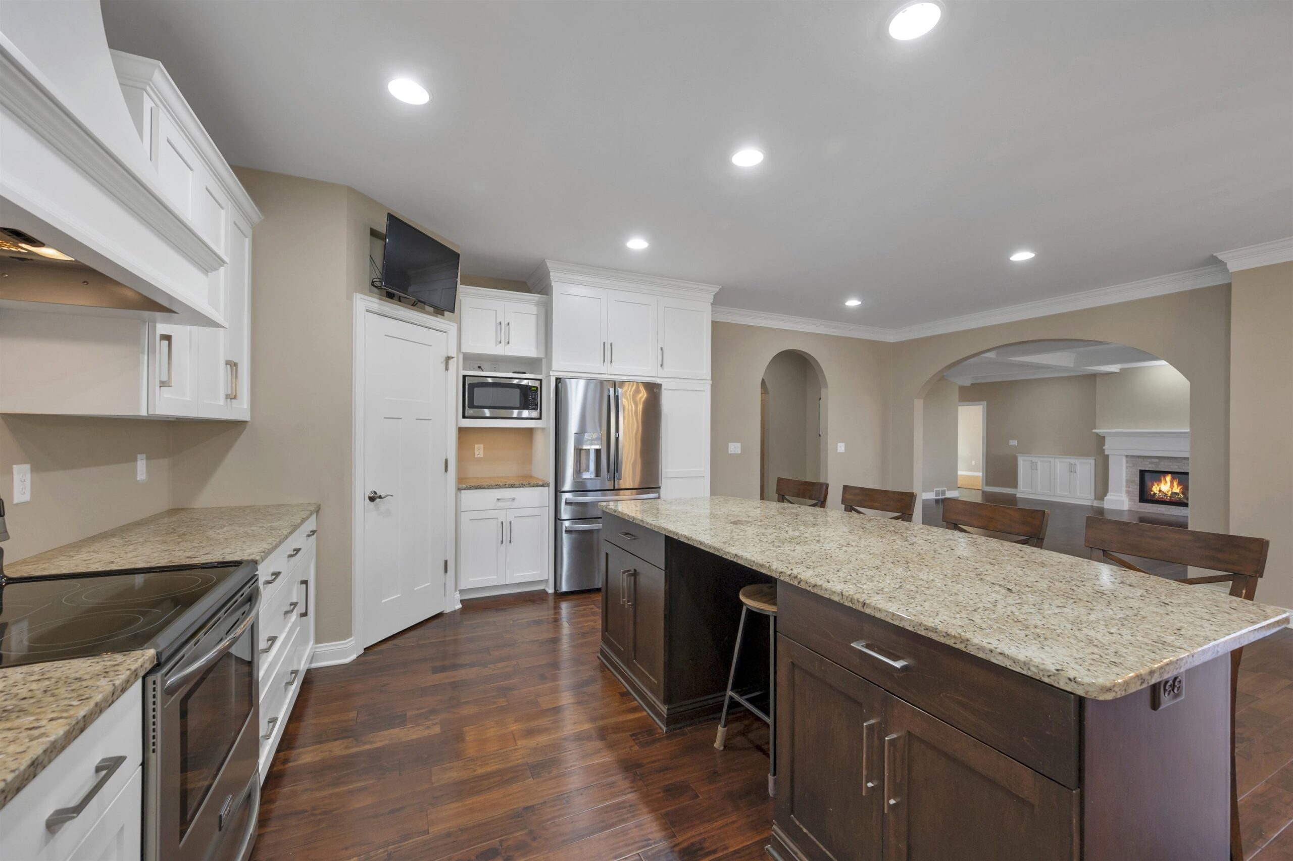 TV in kitchen, 4 stools @ kitchen island, refrigerator in kitchen+bar, microwave in kitchen, range, bsmt TV, all shelves in bsmt, TV in upstairs bdrm