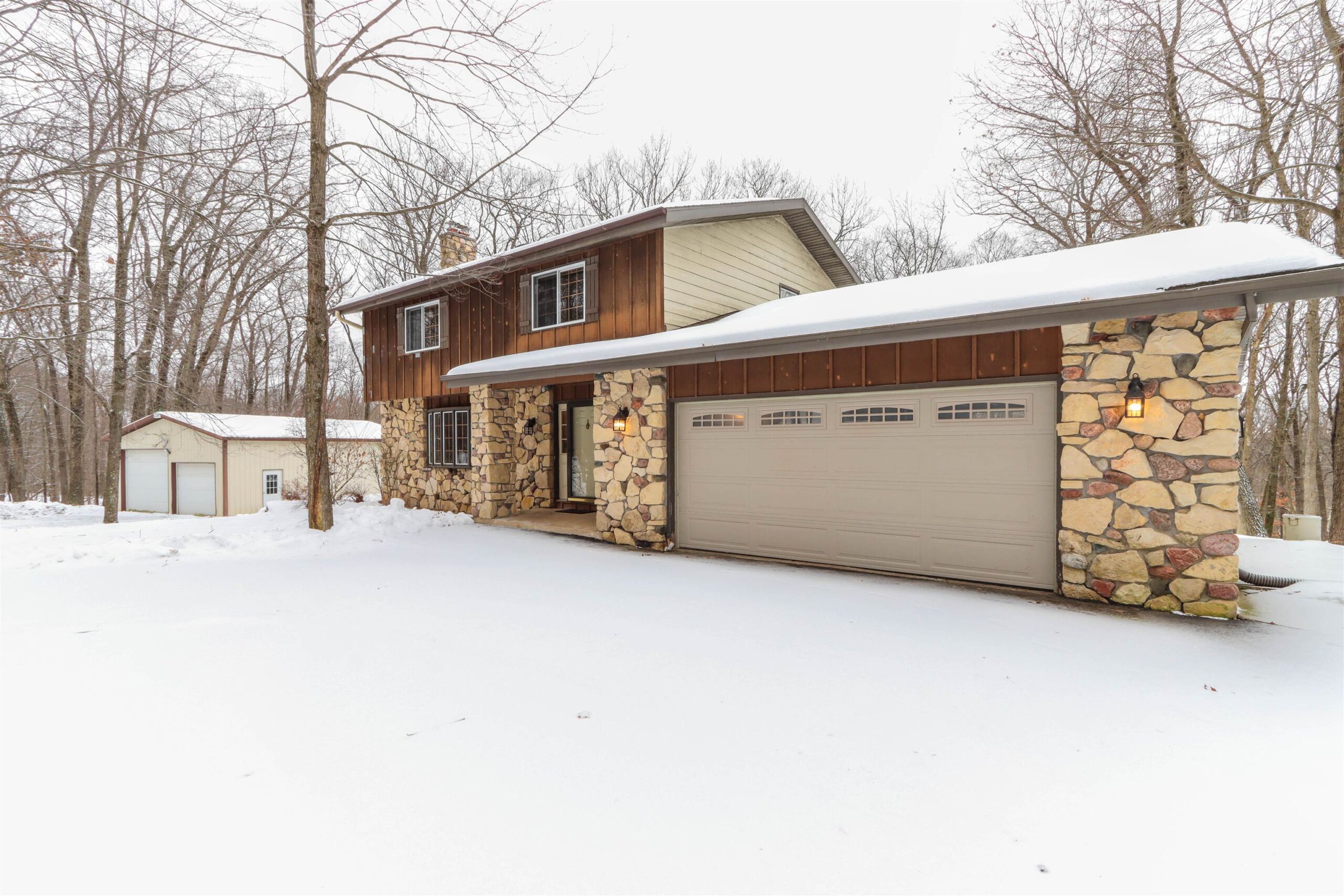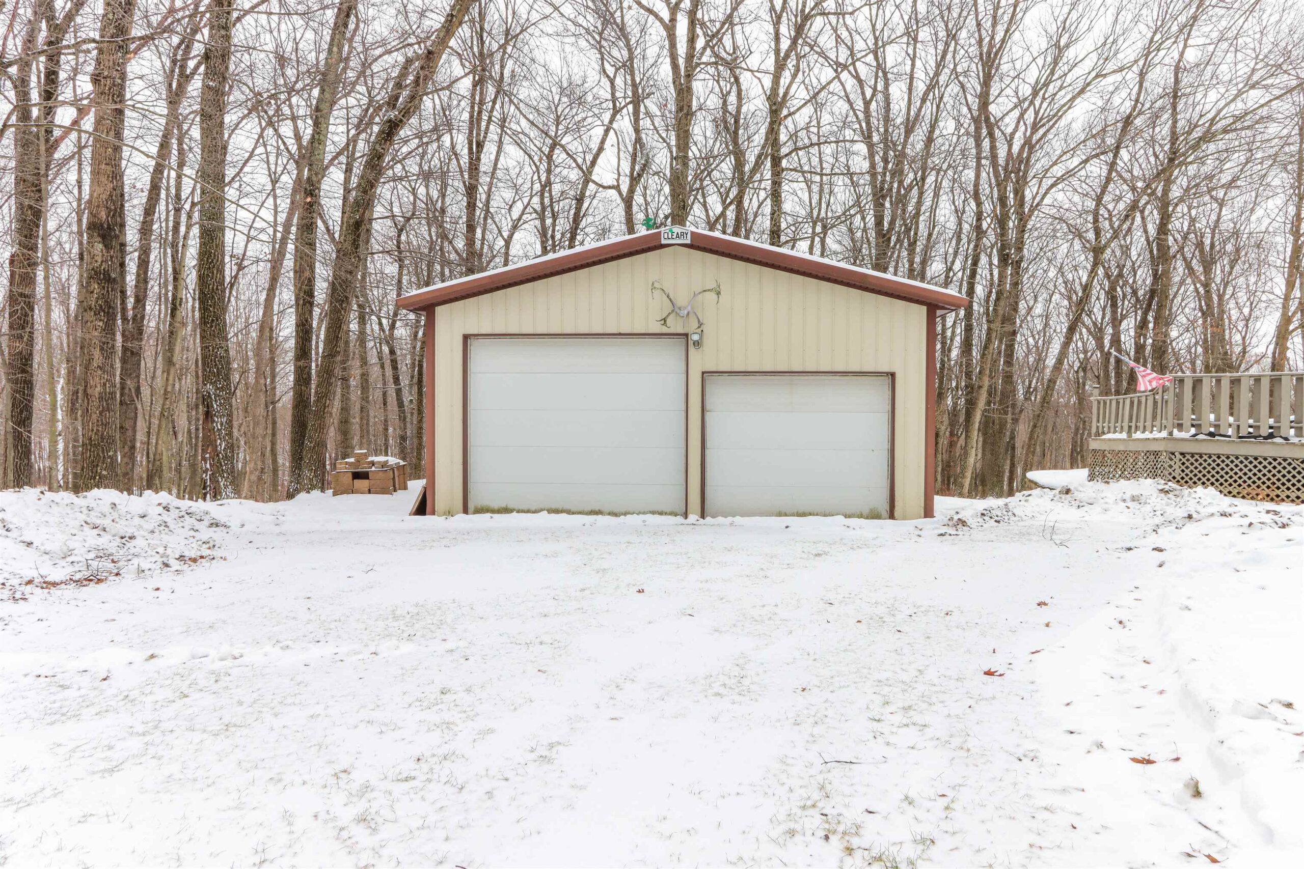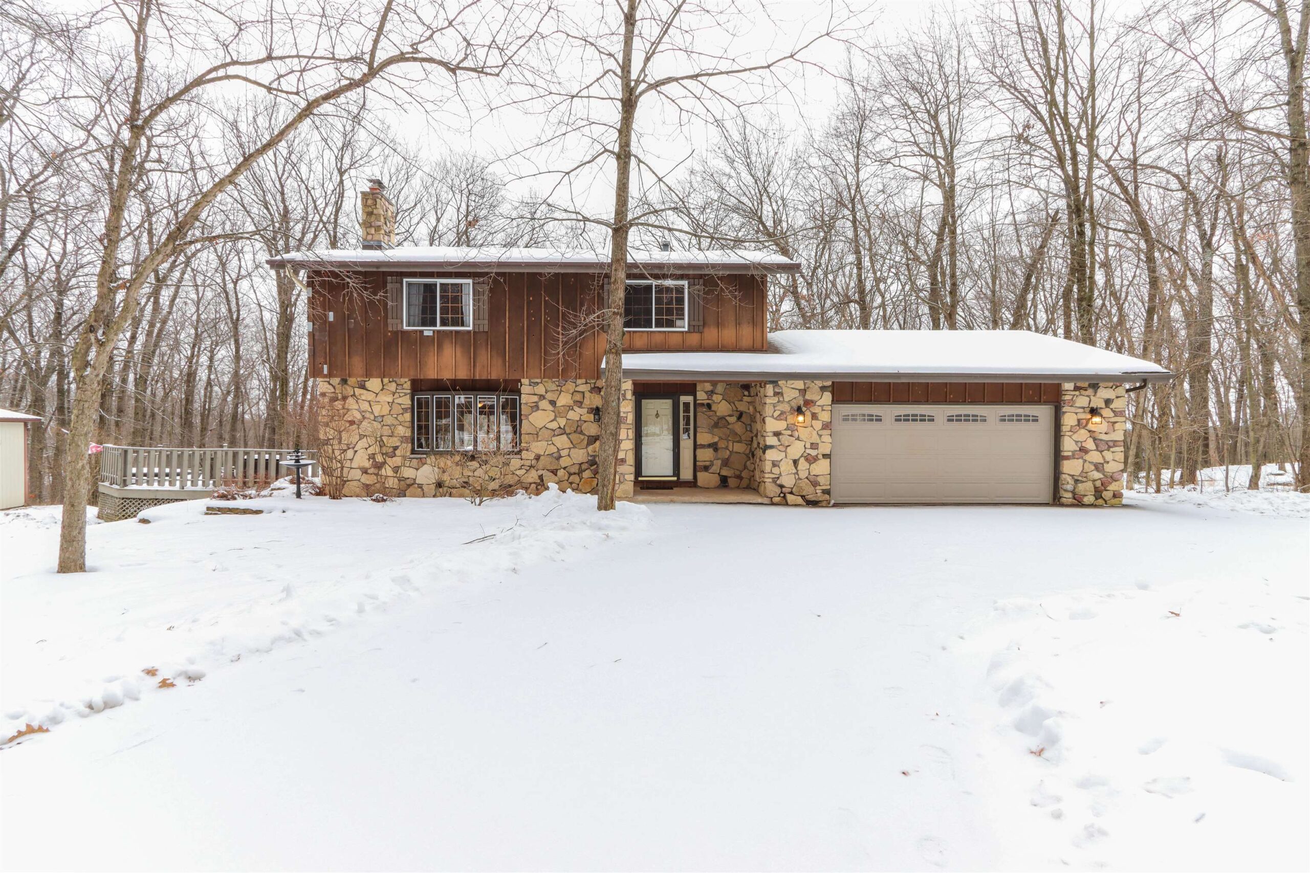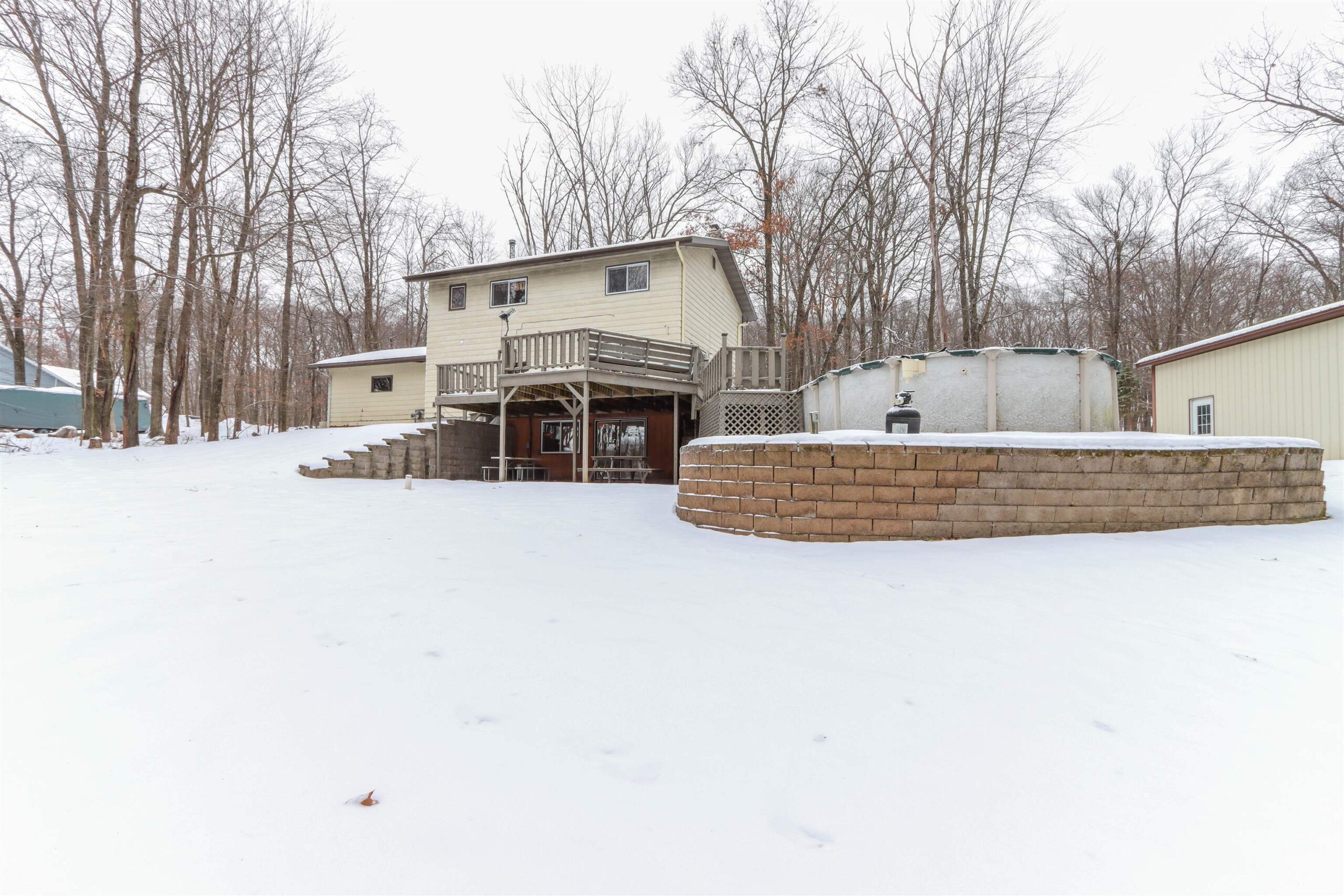 New Year - New Home! Located in the charming Woodridge Subdivision at the very end of the quiet road, this 1-acre property abuts to Waupaca's beautiful Swan Park and the River Ridge Trail for great hiking just steps from your front door! The 4 Bedroom, 3 full bathroom home features 2 fireplaces, one in the lower level walkout basement with wet bar for entertaining. Main floor living room has a stone fireplace w/ pellet stove insert. The home features a tiered deck wrapping around the above-ground pool, overlooking the private wooded setting. In addition to the spacious 2 car garage, there is a bonus 35x27 Cleary pole building with an oversized 10ft door in addition to the 8ft door, concrete floors and electric. Seller is offering a $9k flooring credit. Check it out today!