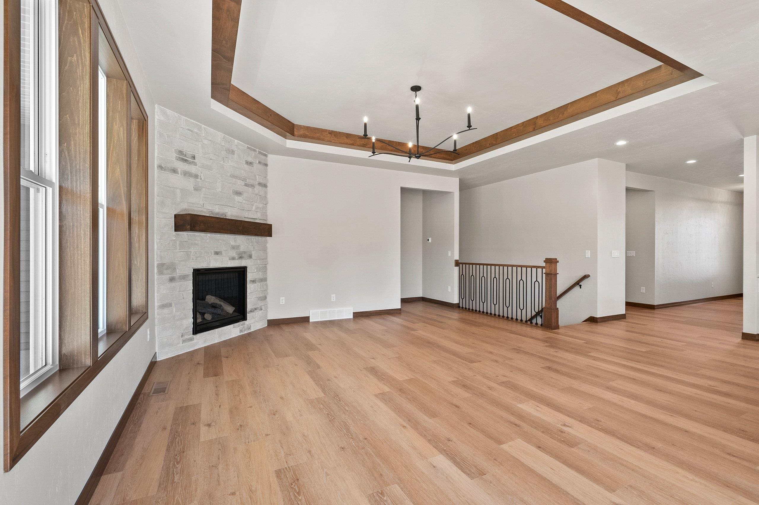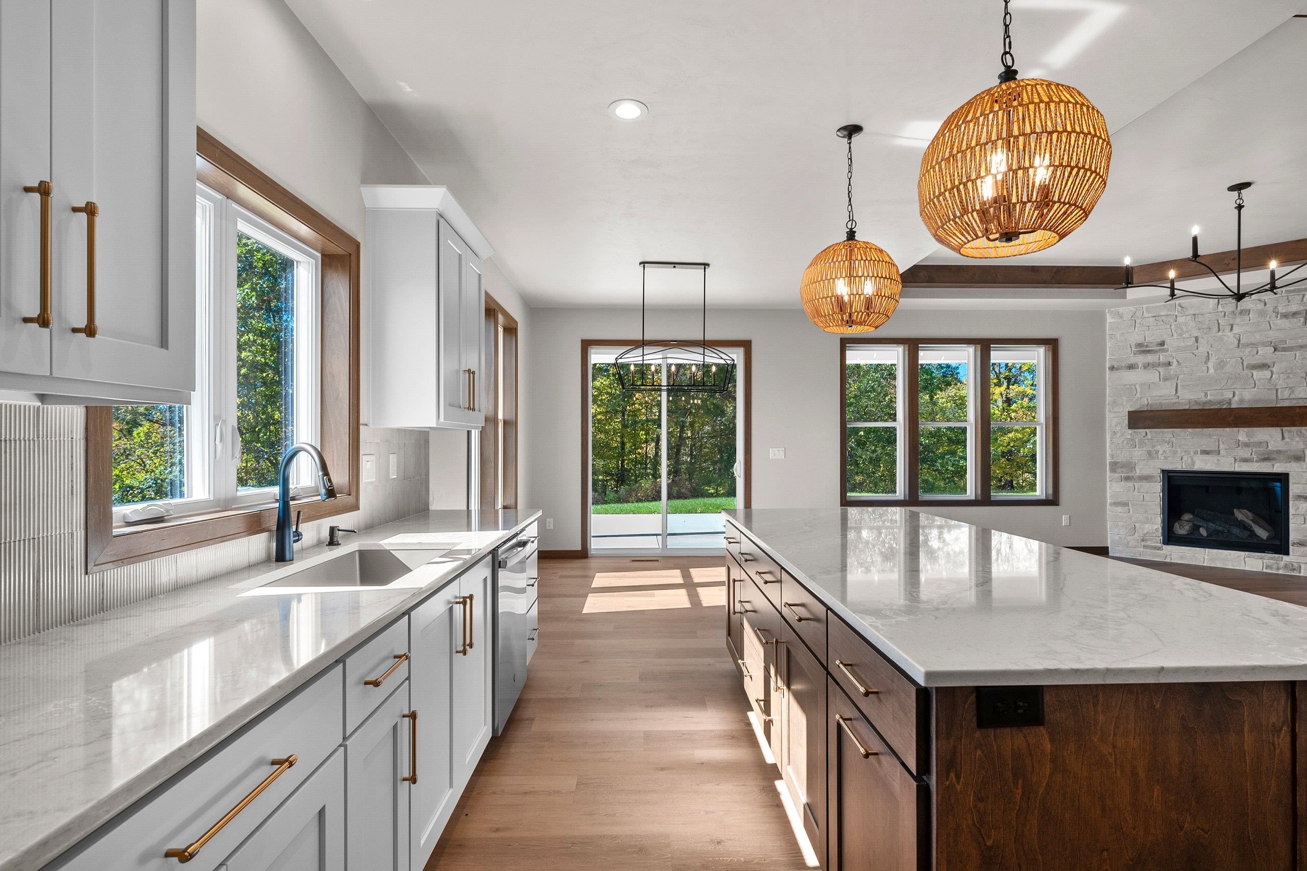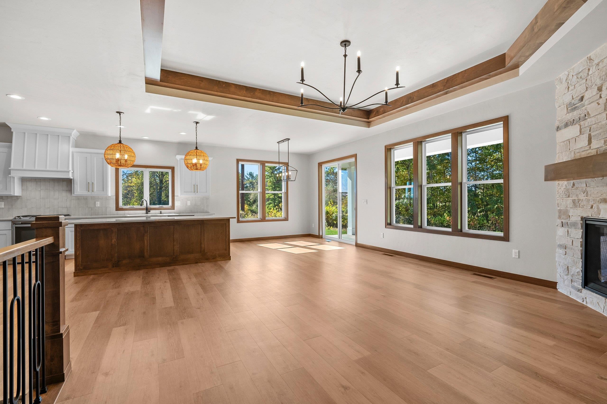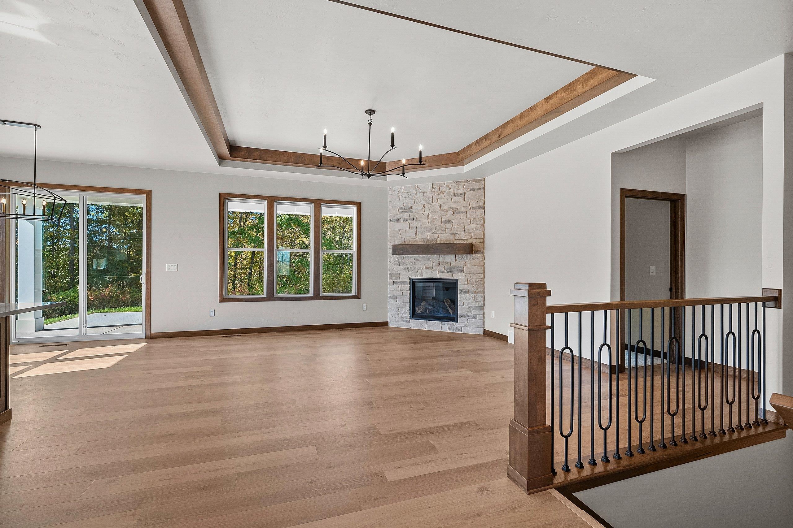 Enjoy the privacy & convenience of this beautiful zero entry condo located in the desirable Woods Reserve. Spacious open concept design flows into cozy LR w/ floor-to-ceiling stone fireplace, tray ceiling w/ wood beam perimeter & lg daylight windows. You will love the amazing kitchen w/ oversized center island, custom cabinets, quartz countertops & pantry. From the dining area, step outside to a covered porch which provides great outdoor space for entertaining w/ private lot backing up to Baird's Creek. Primary Bedroom offers a peaceful retreat w/ tray ceiling & walk-in closet. Primary Bath includes dual sinks & zero entry tiled walk-in shower. Other amenities include a finished garage & LL stubbed bath for future expansion.
