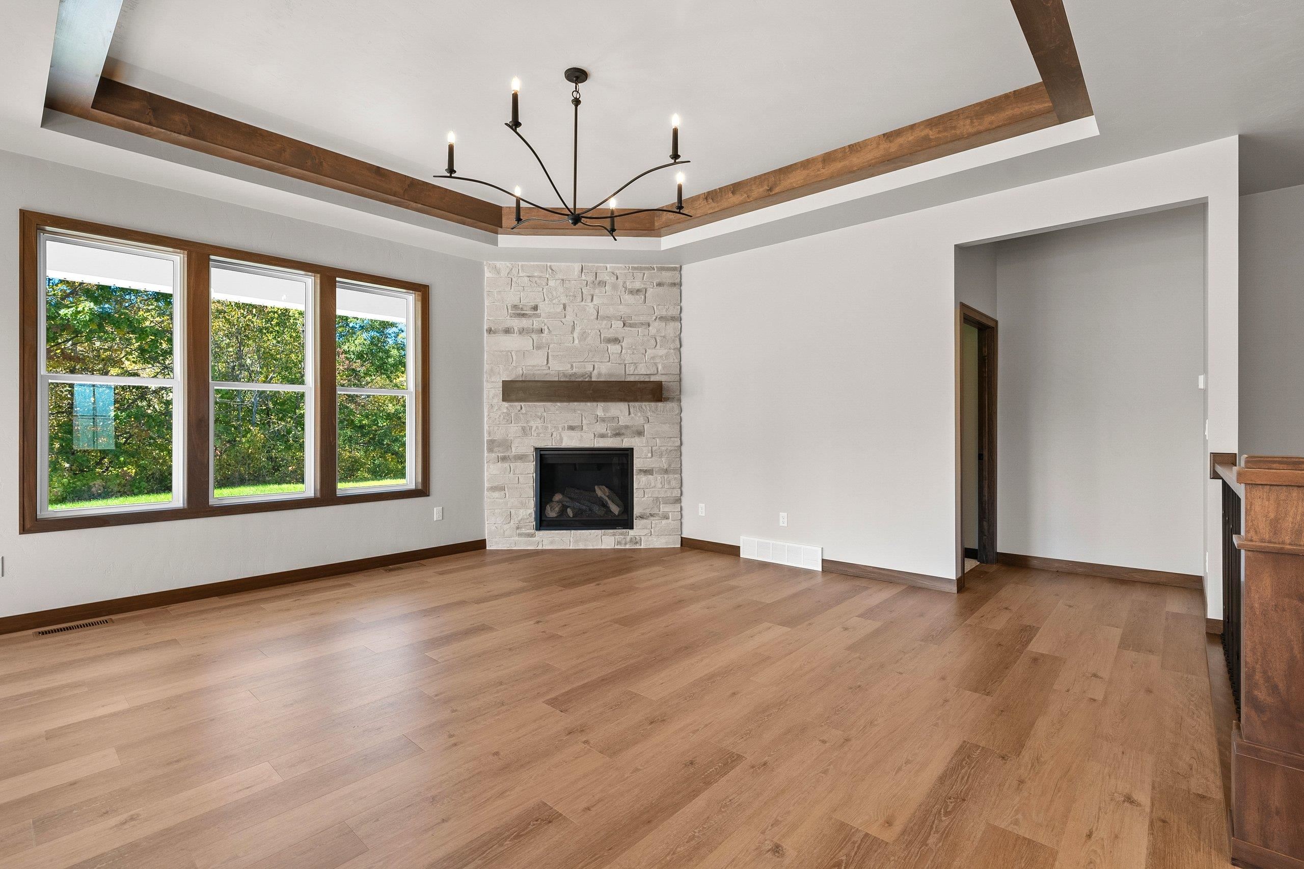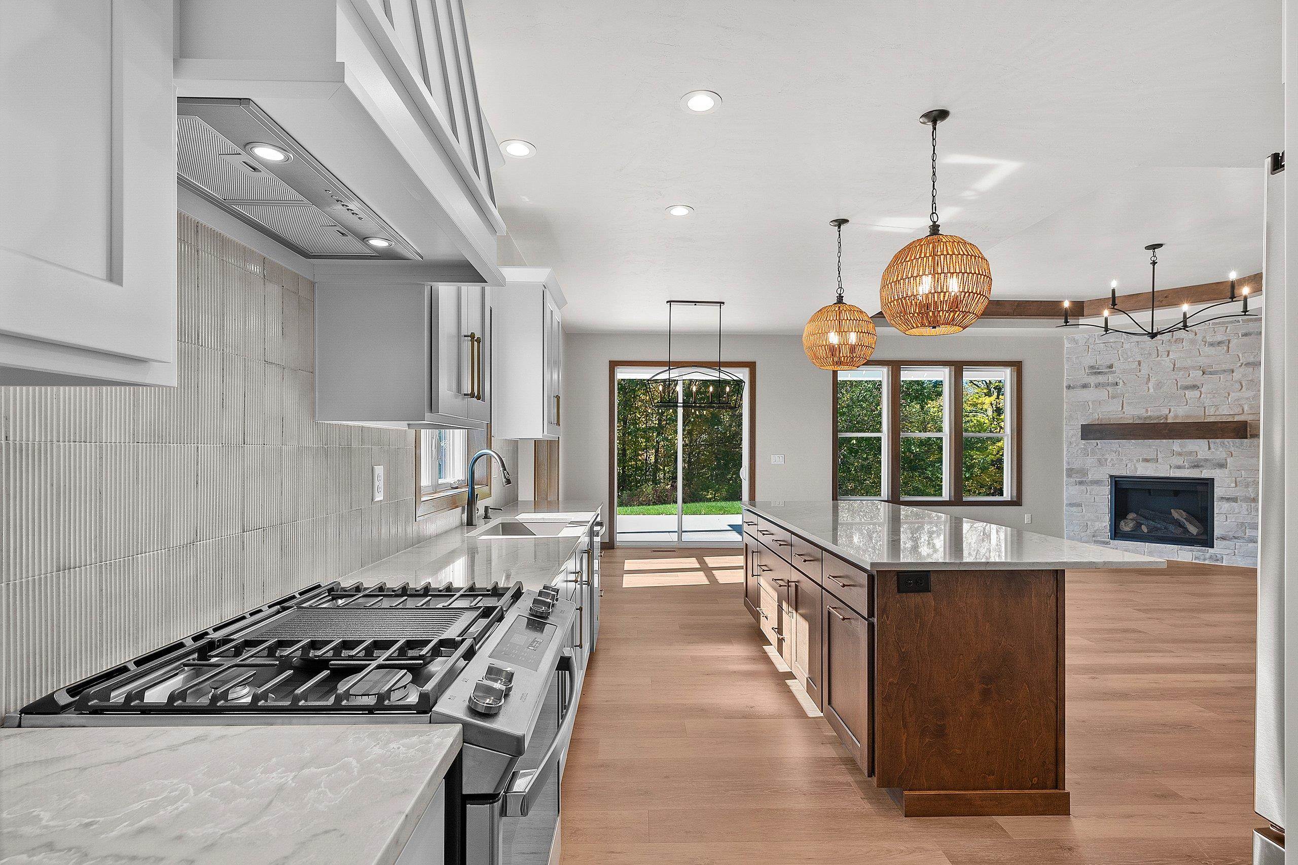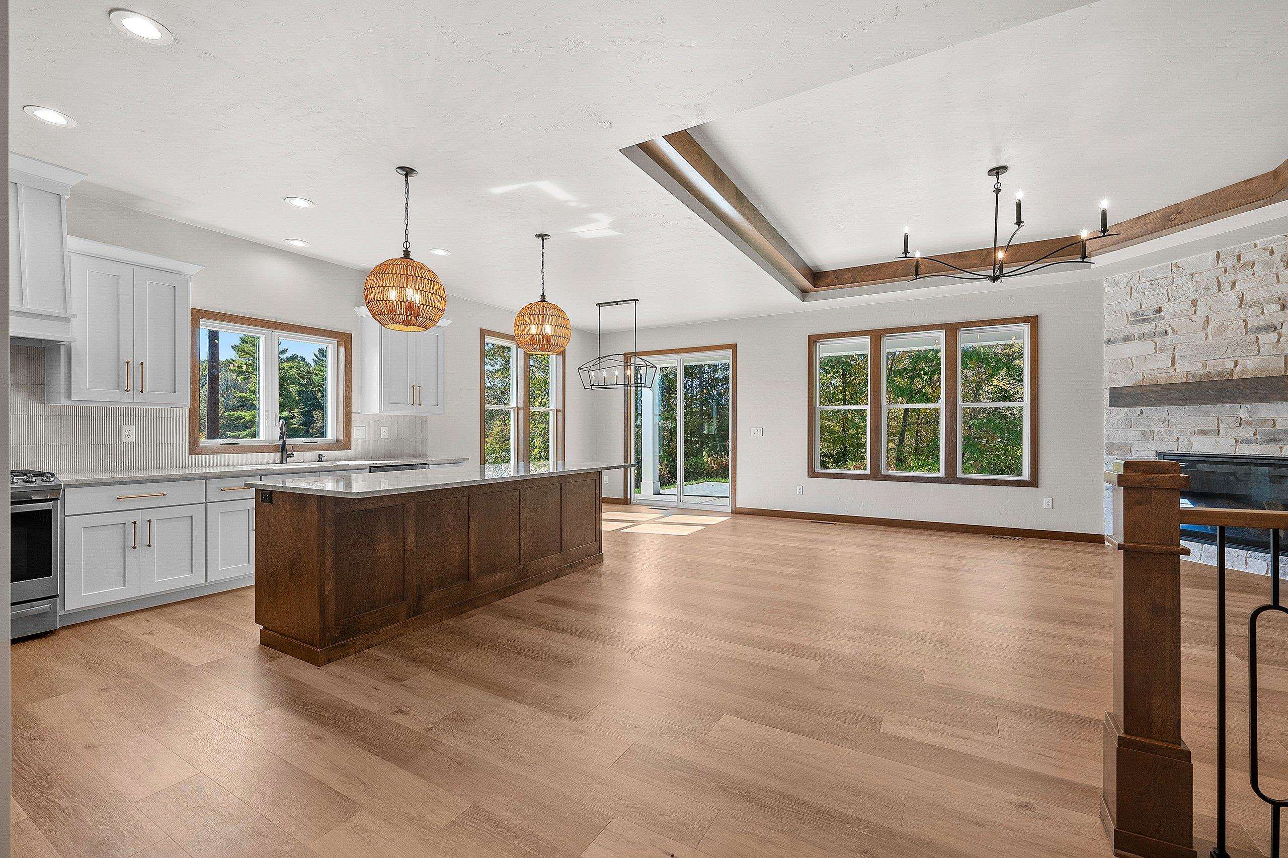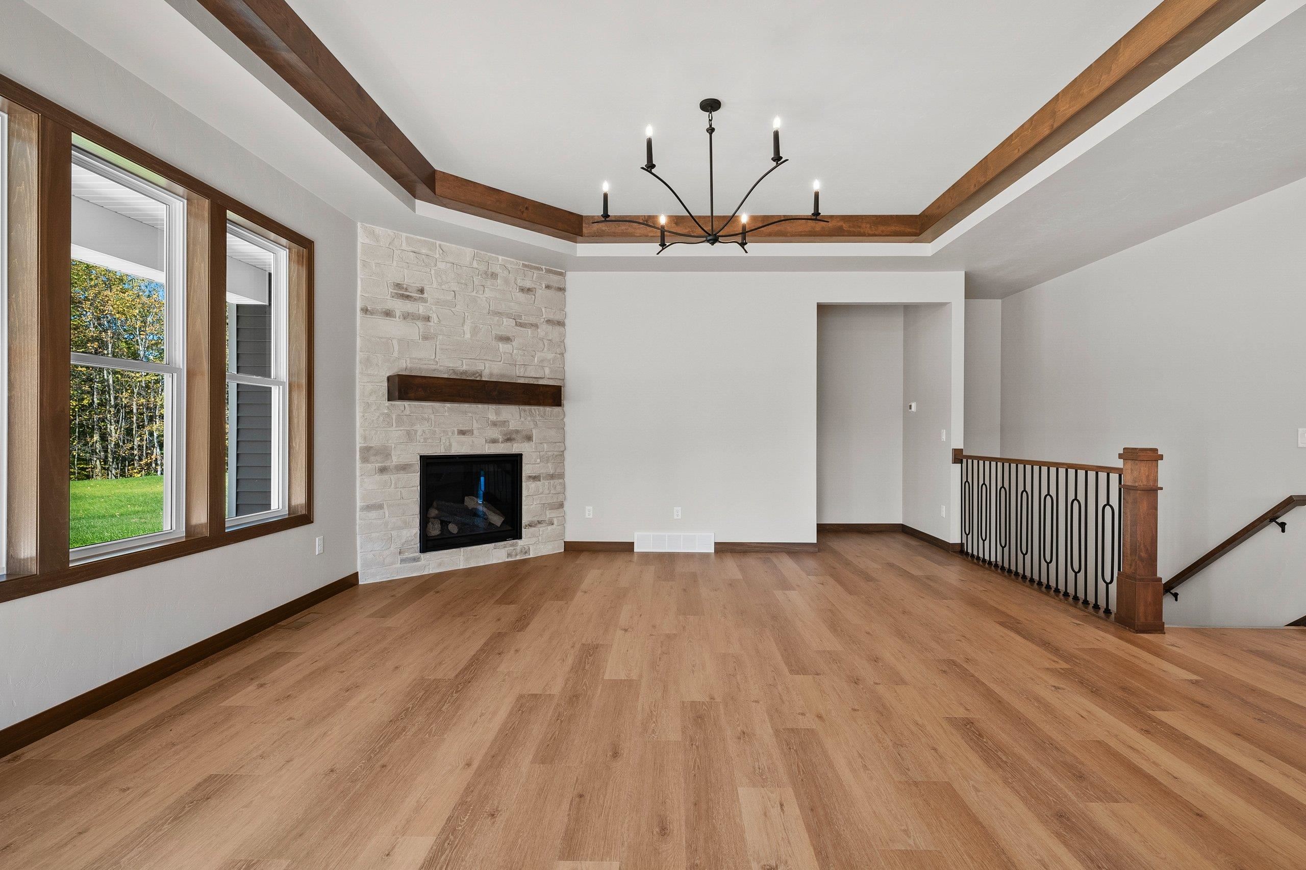 Enjoy the privacy & convenience of this beautiful zero entry condo located in the desirable Woods Reserve. Spacious open concept design flows into cozy LR w/ floor-to-ceiling stone fireplace, tray ceiling w/ wood beam perimeter & lg daylight windows. You will love the amazing kitchen w/ oversized center island, custom cabinets, quartz countertops & pantry. From the dining area, step outside to a covered porch which provides great outdoor space for entertaining w/ private lot backing up to Baird's Creek. Primary Bedroom offers a peaceful retreat w/ tray ceiling & walk-in closet. Primary Bath includes dual sinks & zero entry tiled walk-in shower. Other amenities include a finished garage & LL stubbed bath for future expansion.
