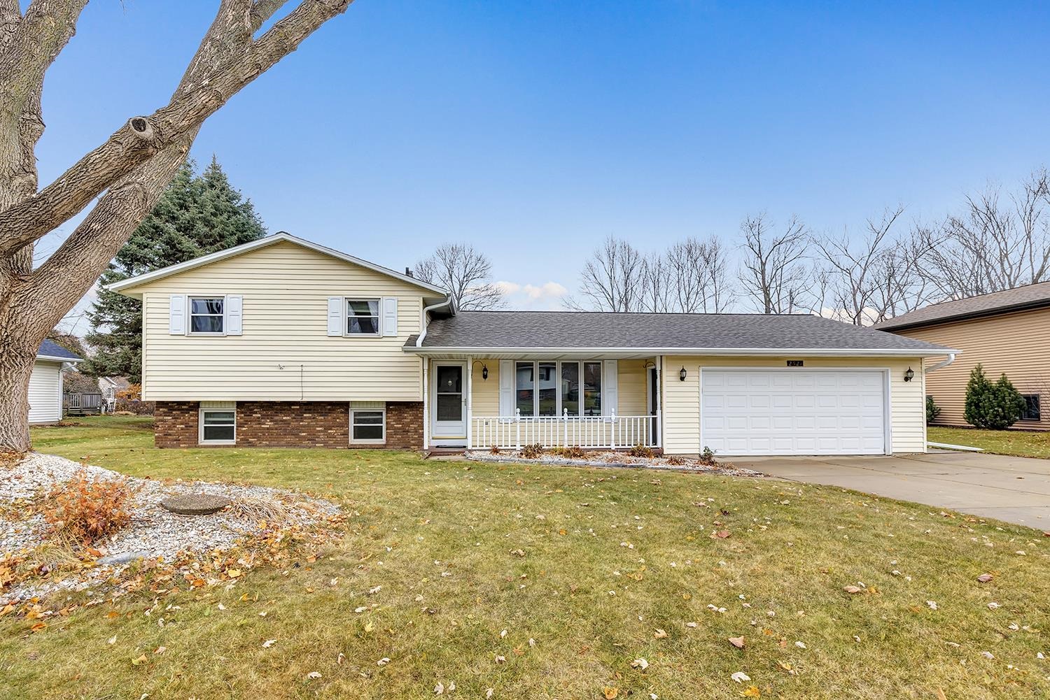 Desired Bellevue location on .54-acre lot with no back neighbors! Enjoy a bright sun-filled living room, an open kitchen and dining with appliances included and patio doors to a huge stamped patio and raised deck overlooking the beautiful setting with an Apple Tree, Pear Tree and yard that backs to a wooded ravine. The primary bedroom offers dual closets and direct access to the bathroom. One of the bedrooms is currently used as an office. And there is a spacious lower-level family room, another bathroom and glass doors leading to the patio. Updates include roof, windows, A/C, and refrigerator. 2 car attached heated garage
