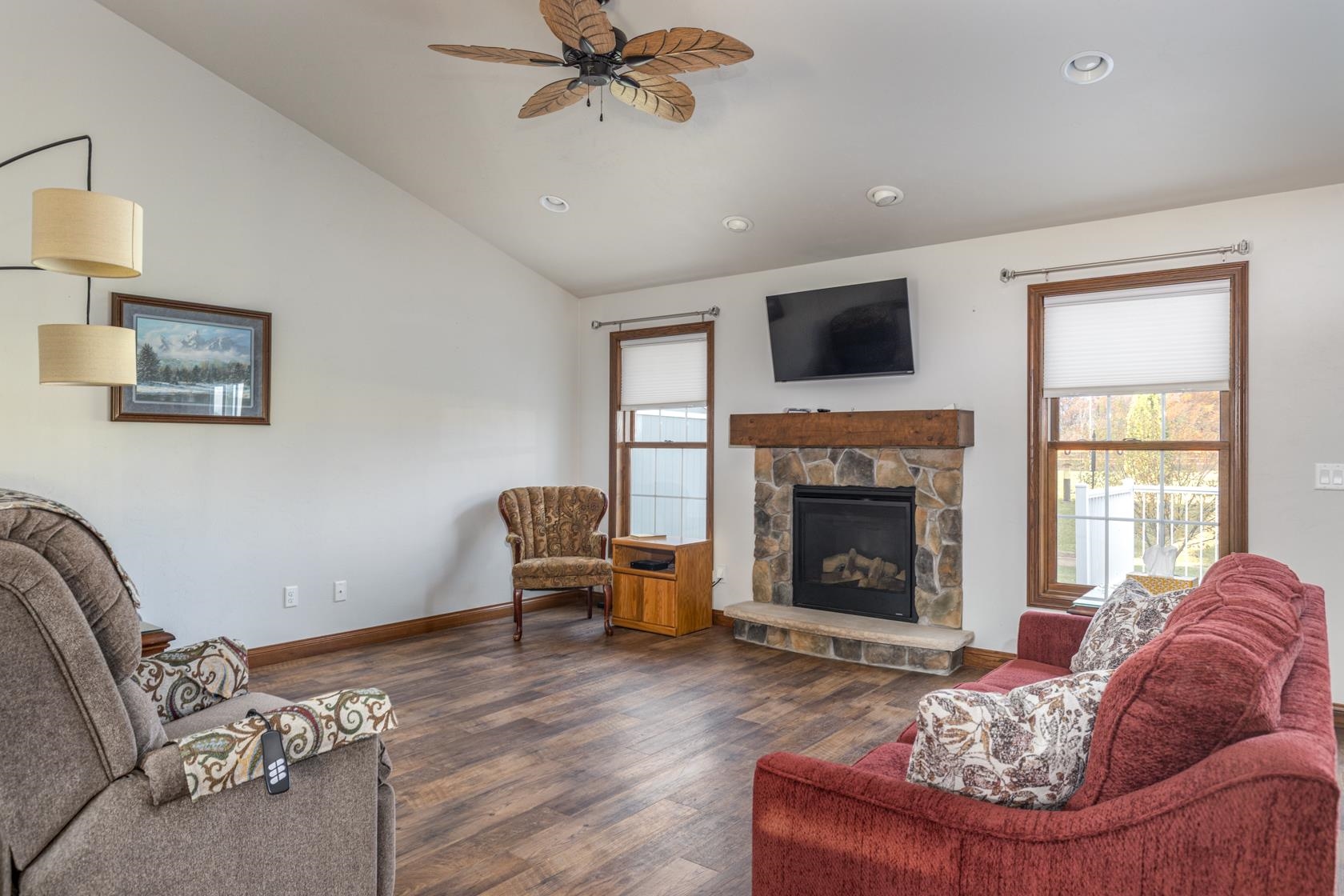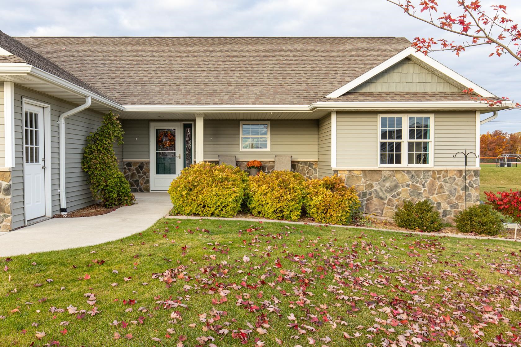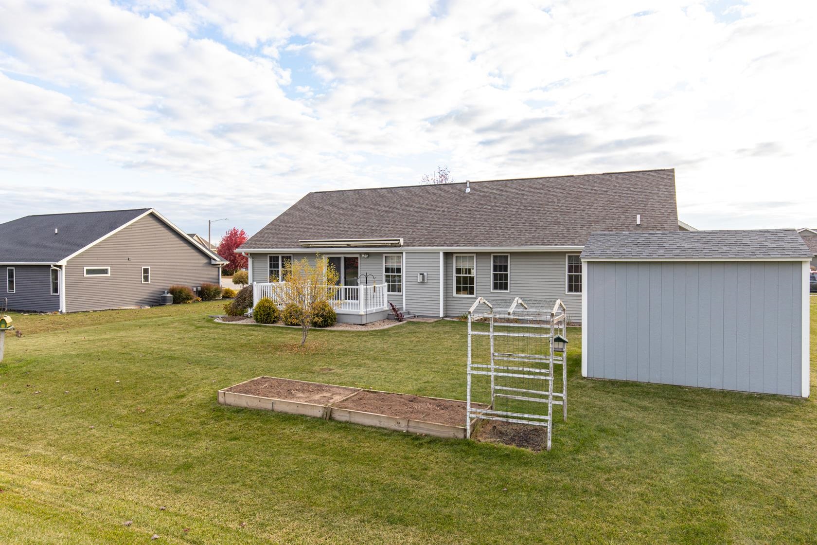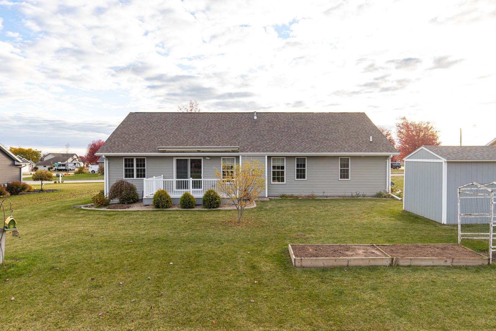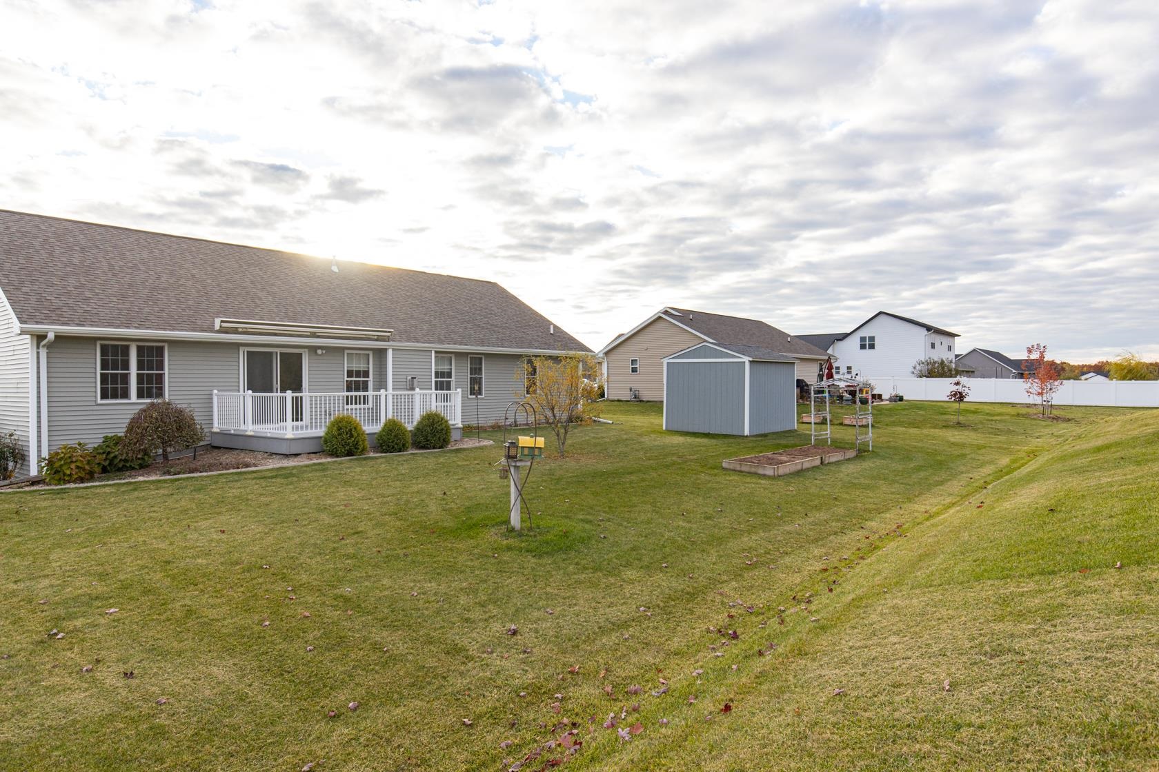 Wow! like new with upgrades built by Mike Maas golden hammer award winning builder ! The open-concept layout features soaring vaulted ceilings, a cozy gas fireplace, and abundant natural light through high-quality Andersen windows, creating an inviting space, The chef’s kitchen boasts generous custom cabinetry, a sprawling island with stylish pendant lighting, a gas stove, and stainless steel appliances Retreat to the luxurious primary suite with a custom walk-in seated shower, while practicality shines in the half bath and laundry room located off the garage.? Enjoy epoxy garage floors, extra storage in the exterior 10x12 building, custom sunseeker powered awning over maintenance free deck overlooking overisized lot and sit on front porch on quiet dead end street.