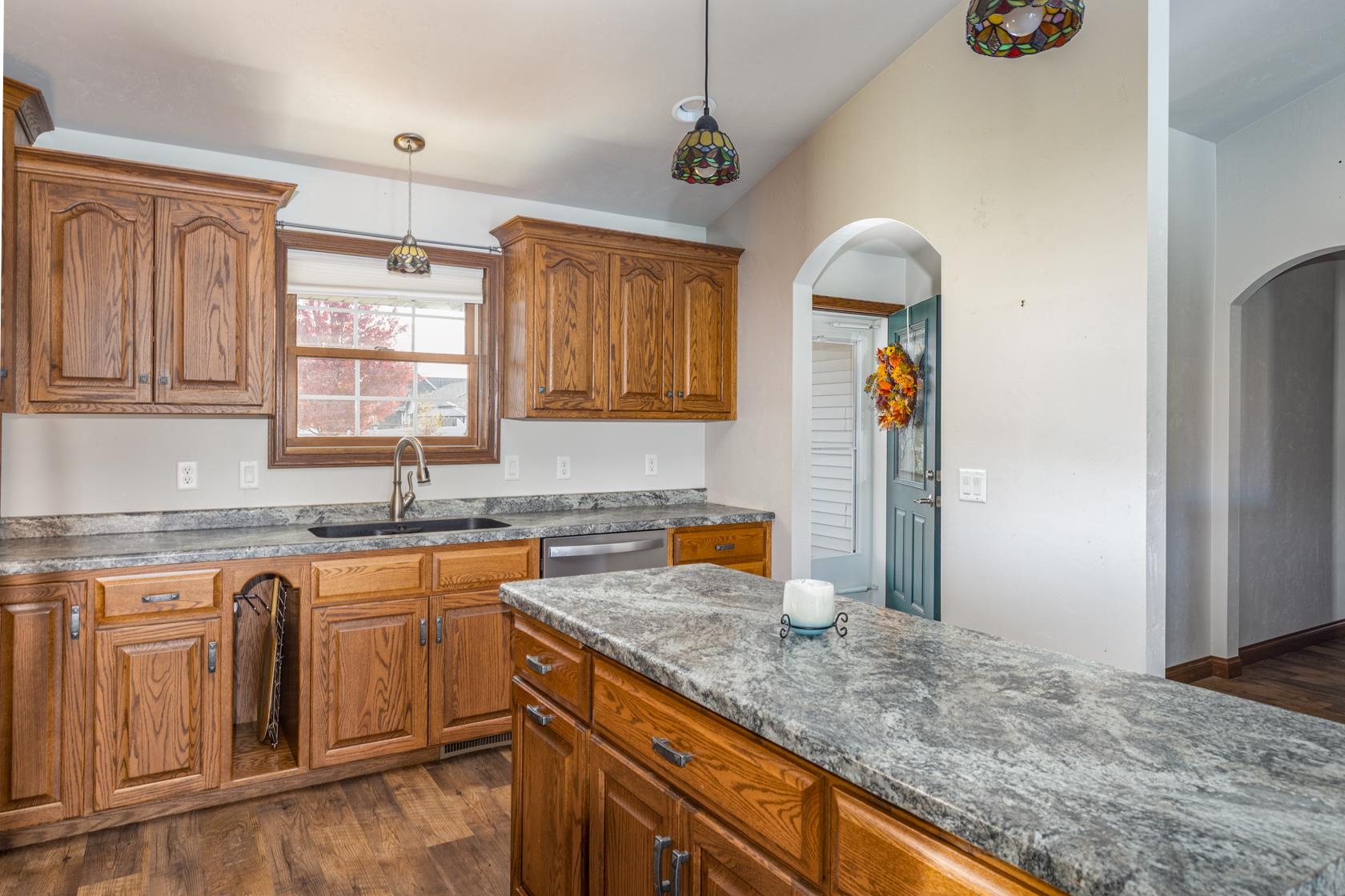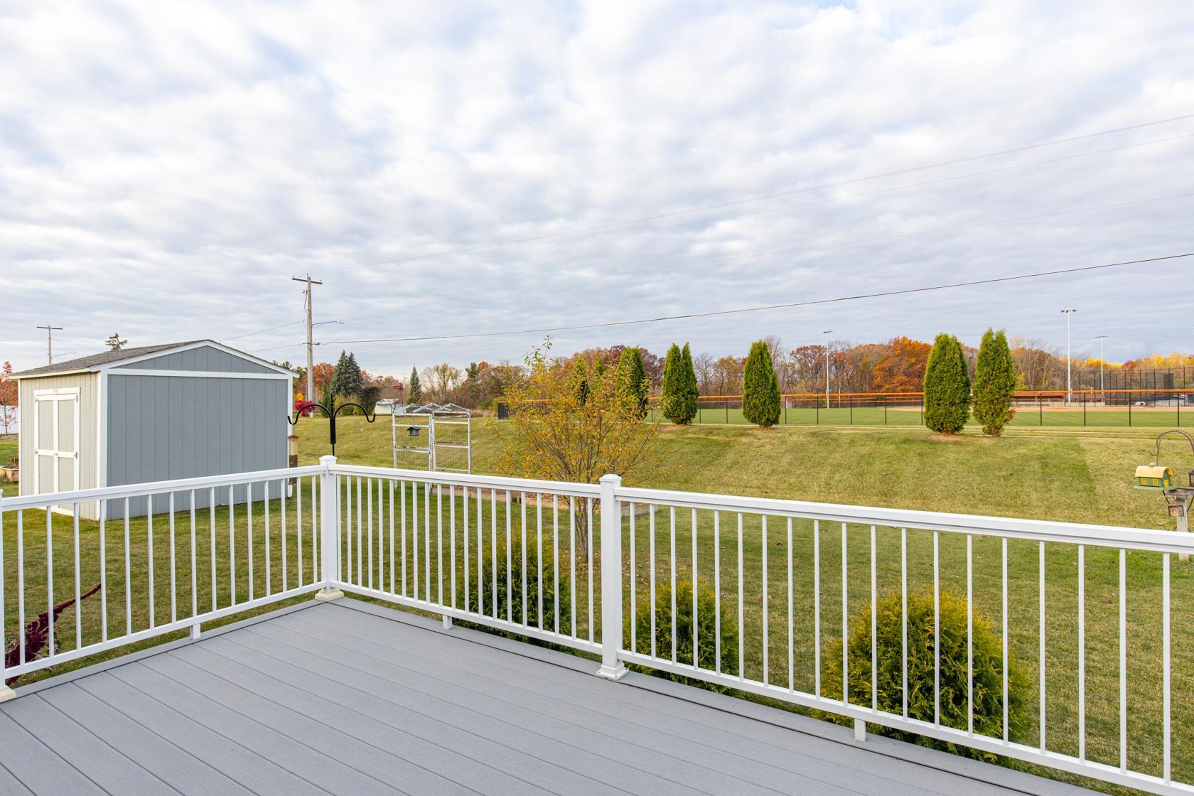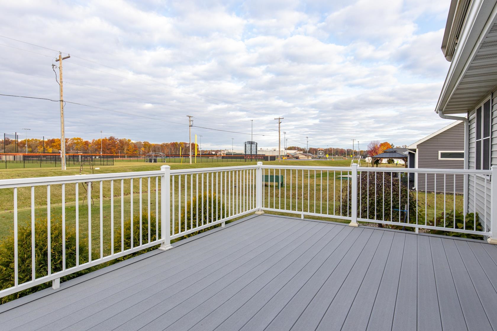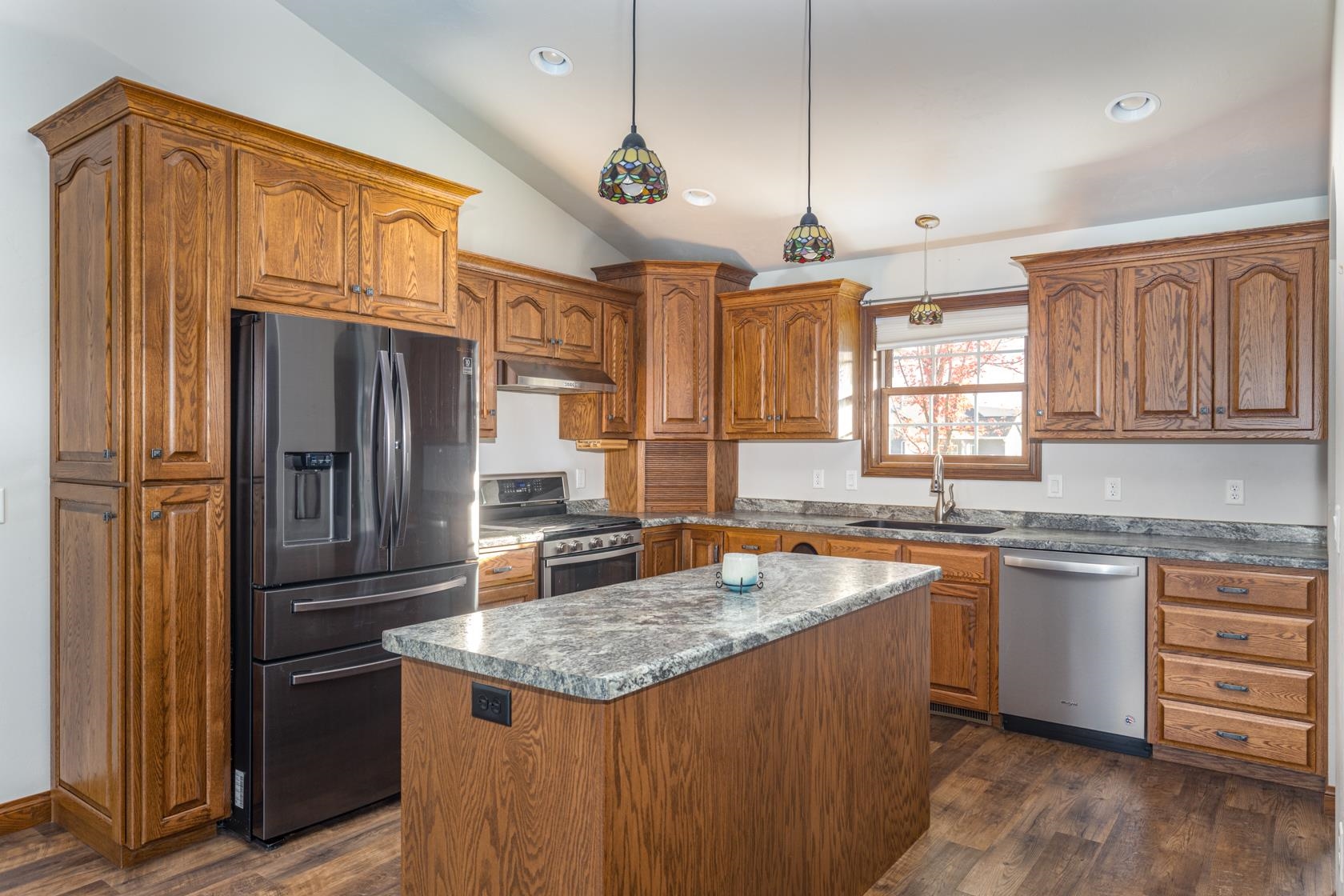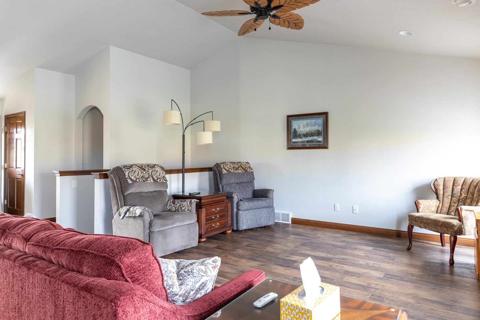 Wow! like new with upgrades built by Mike Maas golden hammer award winning builder ! The open-concept layout features soaring vaulted ceilings, a cozy gas fireplace, and abundant natural light through high-quality Andersen windows, creating an inviting space, The chef’s kitchen boasts generous custom cabinetry, a sprawling island with stylish pendant lighting, a gas stove, and stainless steel appliances Retreat to the luxurious primary suite with a custom walk-in seated shower, while practicality shines in the half bath and laundry room located off the garage.? Enjoy epoxy garage floors, extra storage in the exterior 10x12 building, custom sunseeker powered awning over maintenance free deck overlooking overisized lot and sit on front porch on quiet dead end street.