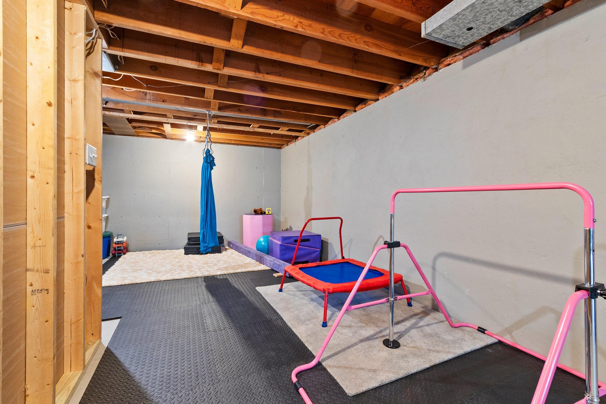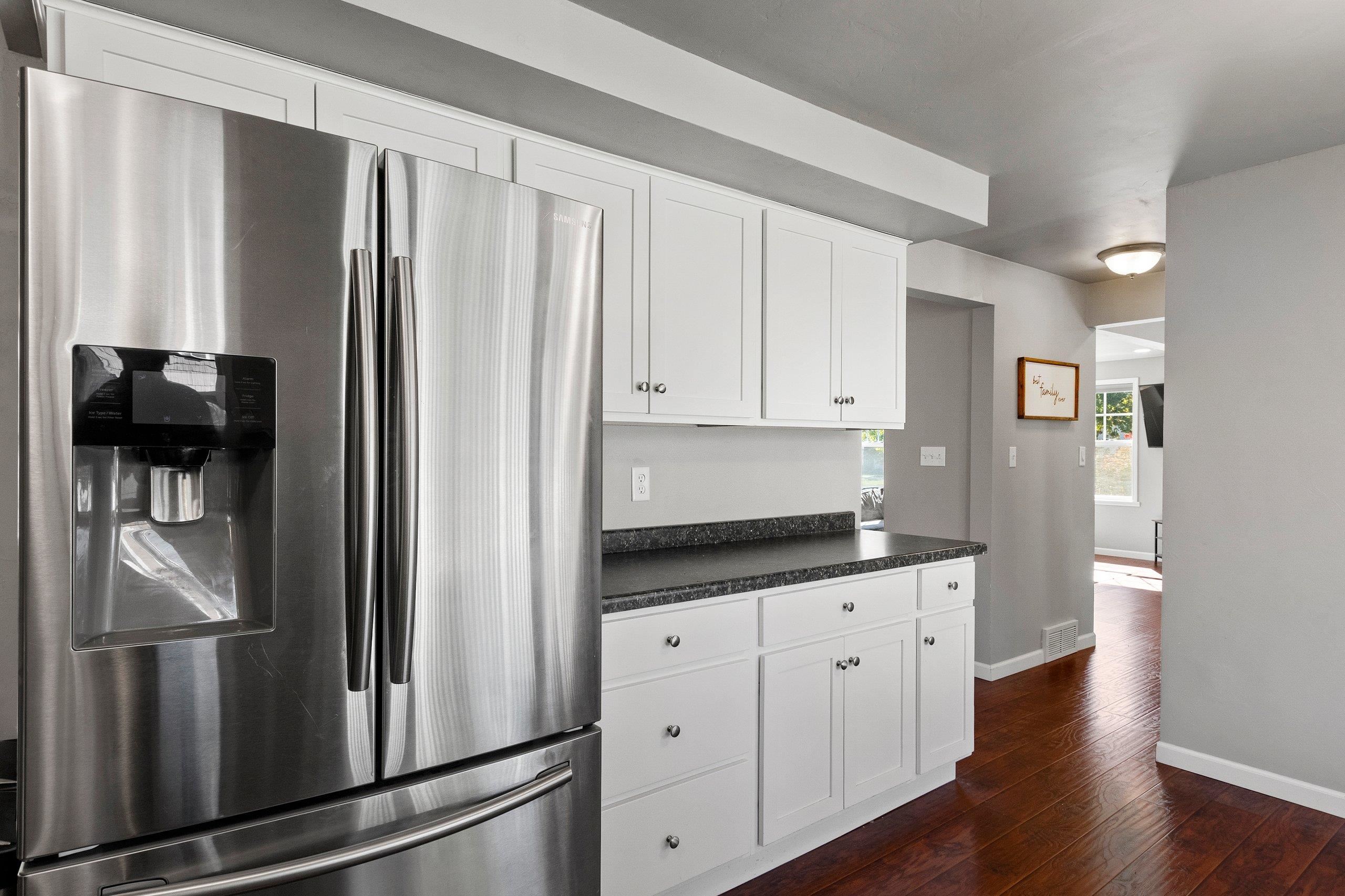 refrigerator in garage, metal storage shelving in lower level