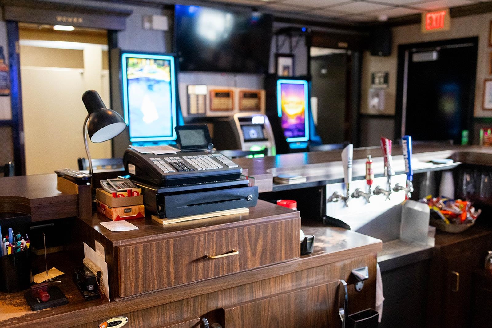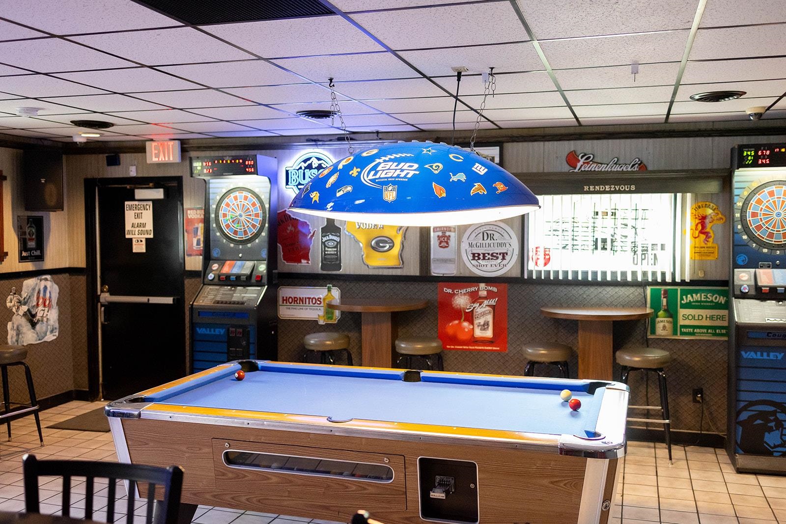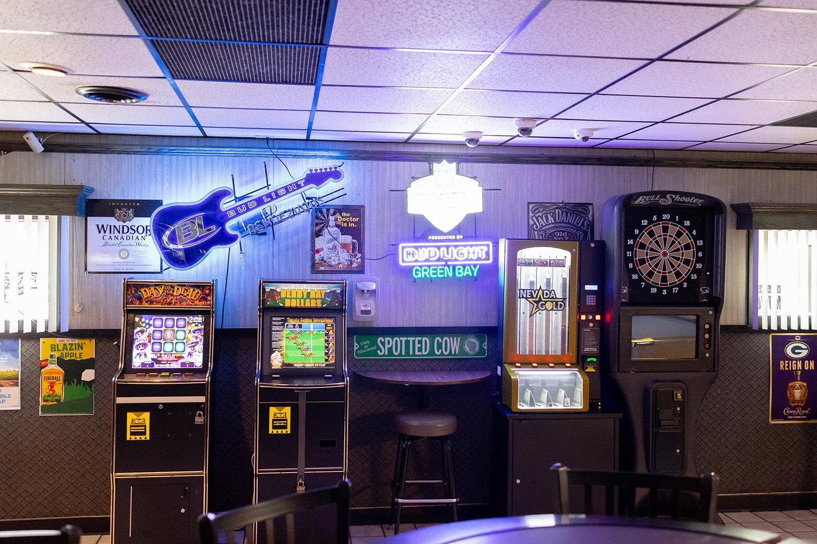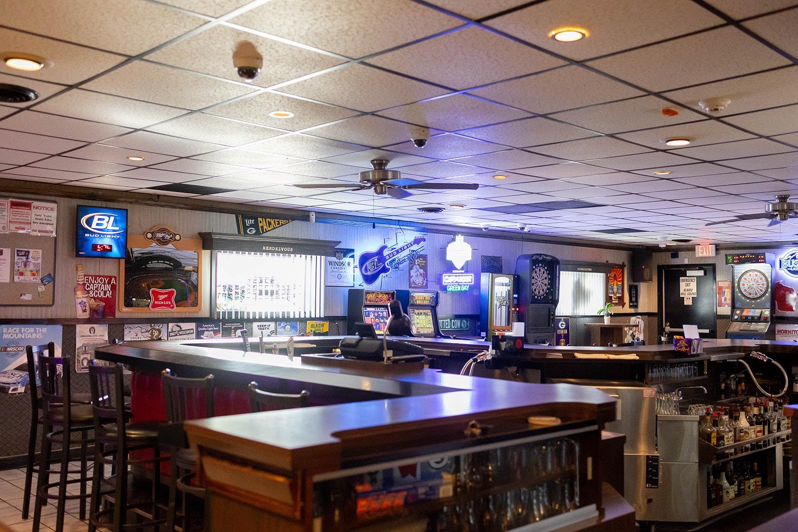 Draft Sign, Bud Light neon sign, Rendezvous guitar sign, rental games, VA ramp