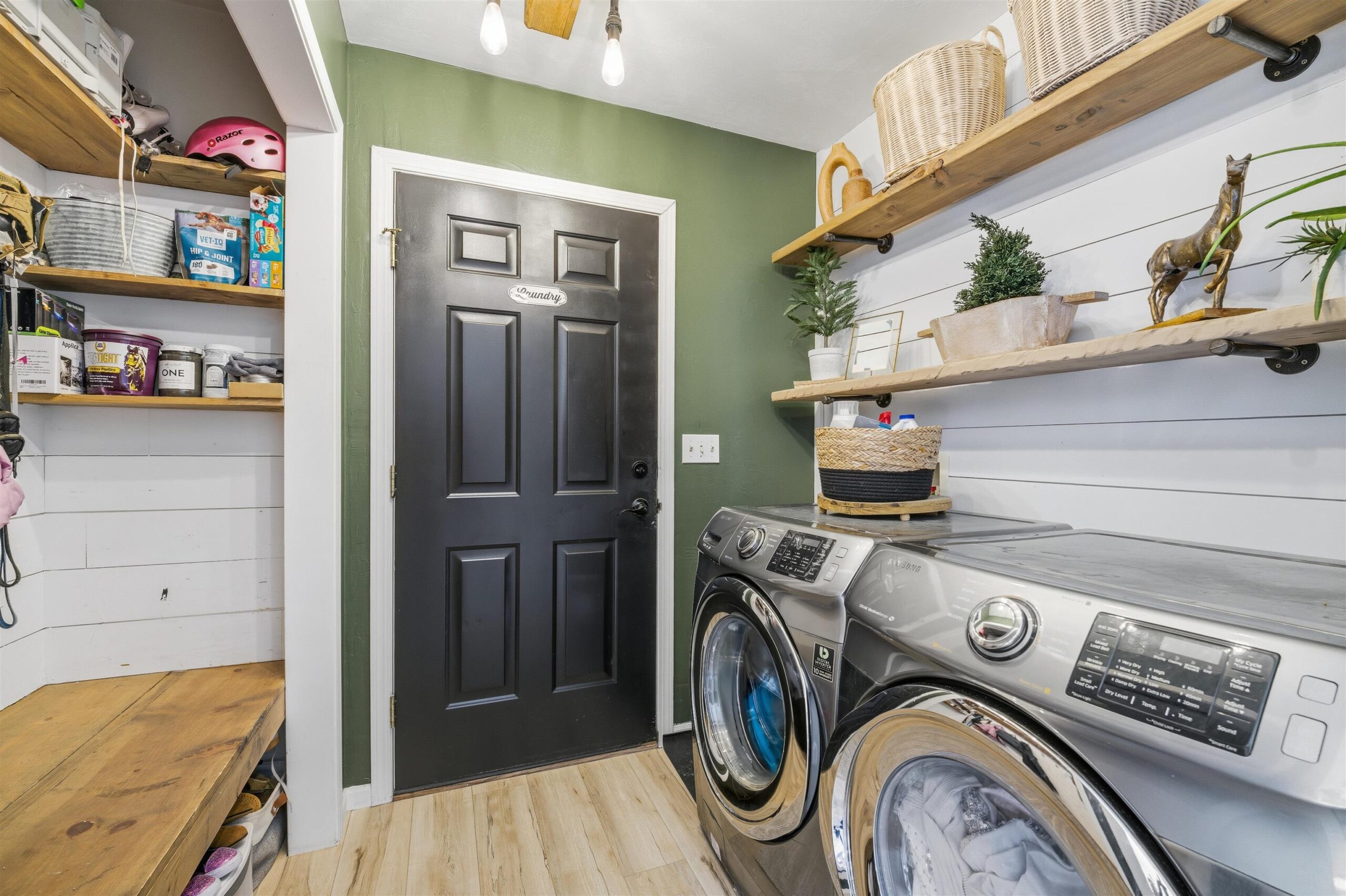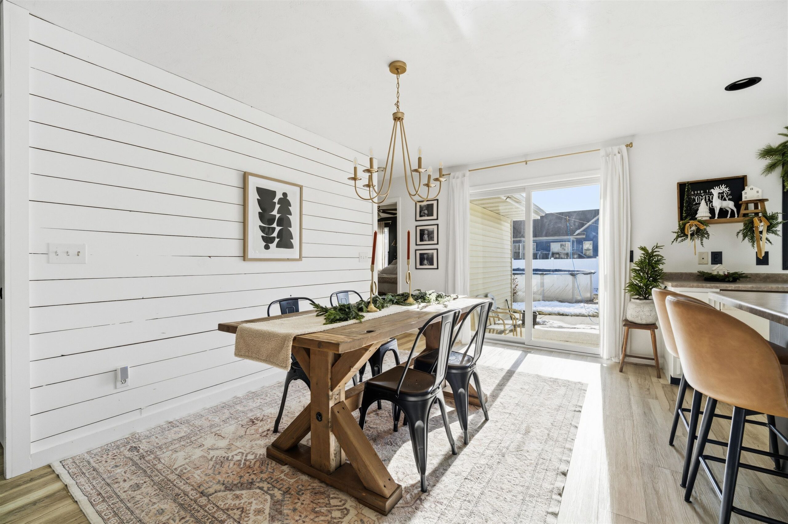 Washer, dryer, stove, refrigerator, dishwasher, built-in microwave, swimming pool, pergola, swing set, metal garage shelving, curtain rods, and drapes