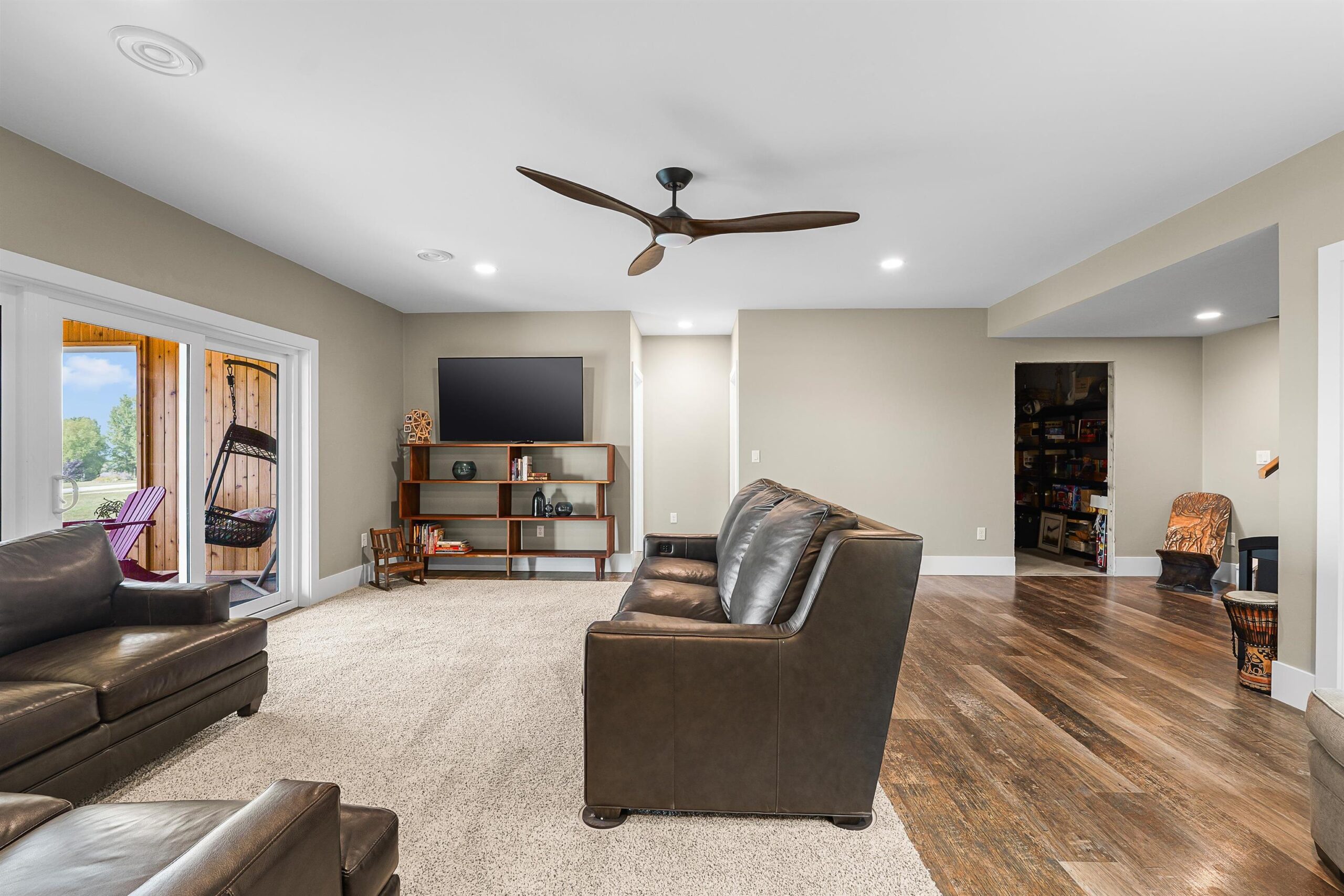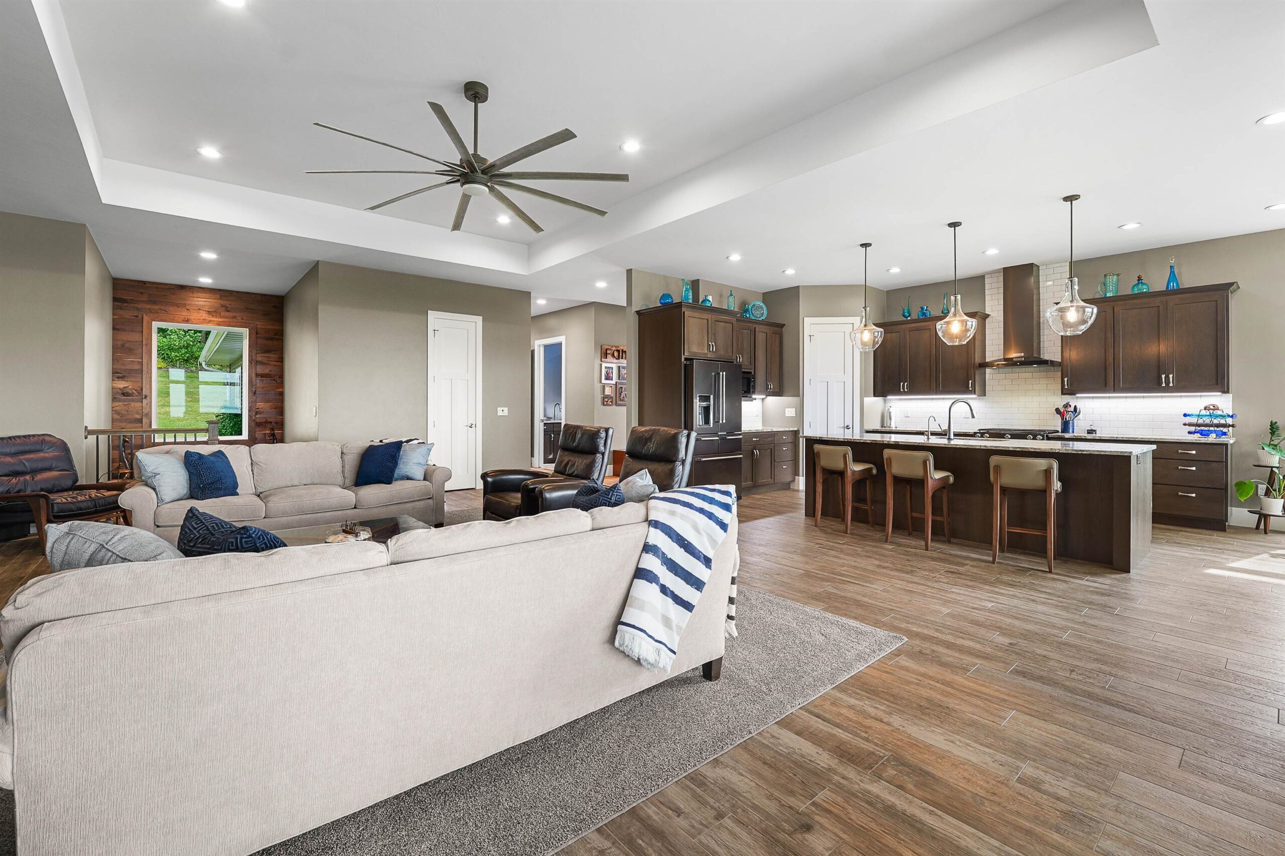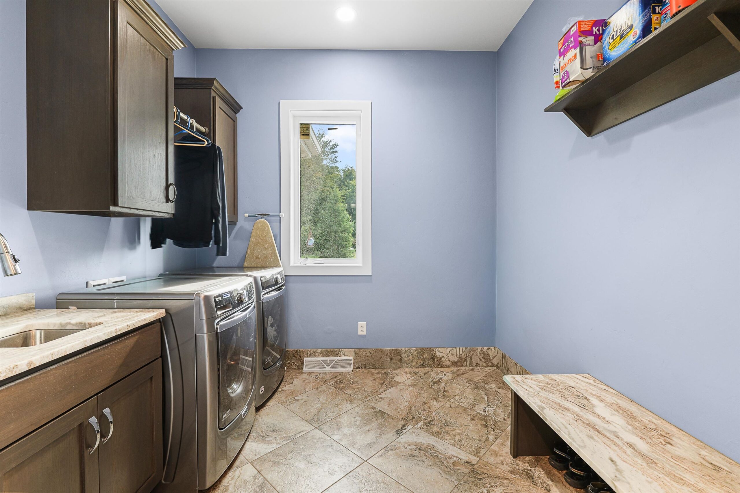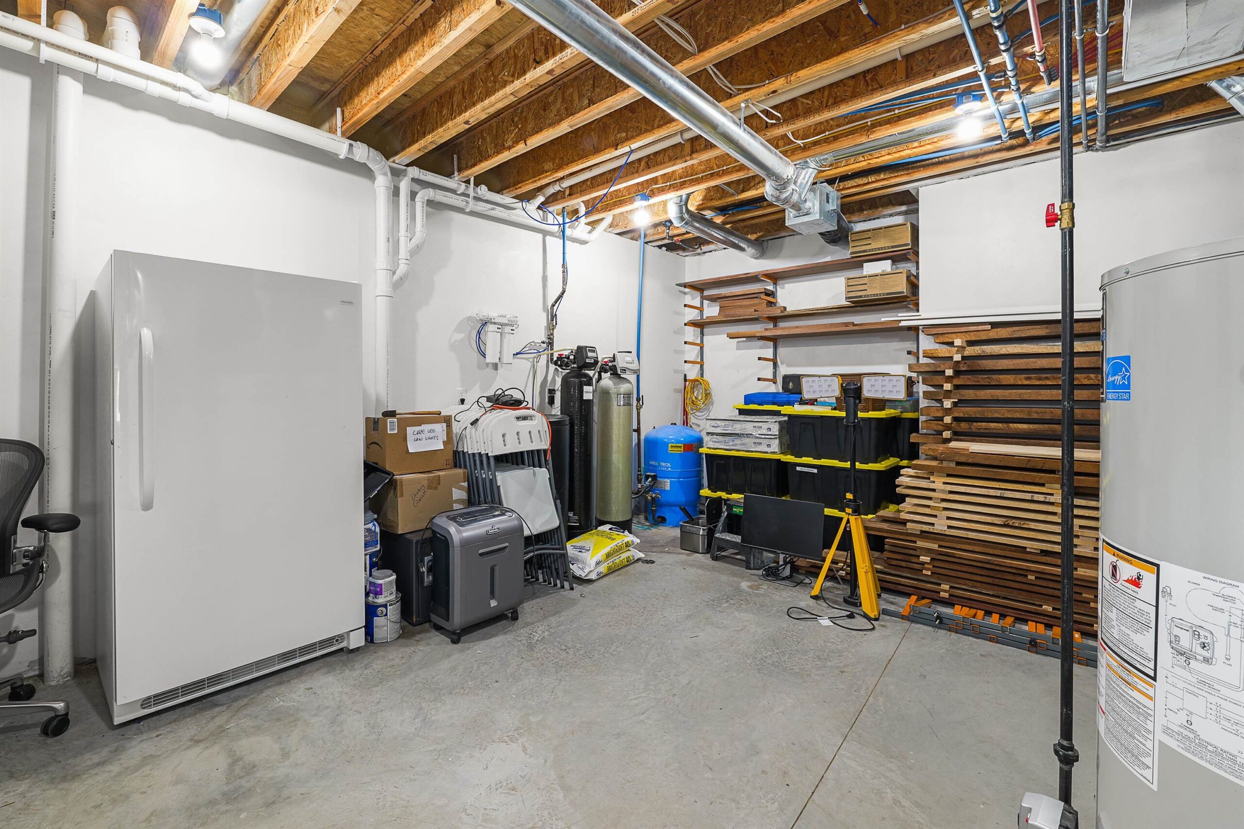 Shelf in great room, sofa i lower level, stove, refrigerator, washer, dryer, microwave, water softener