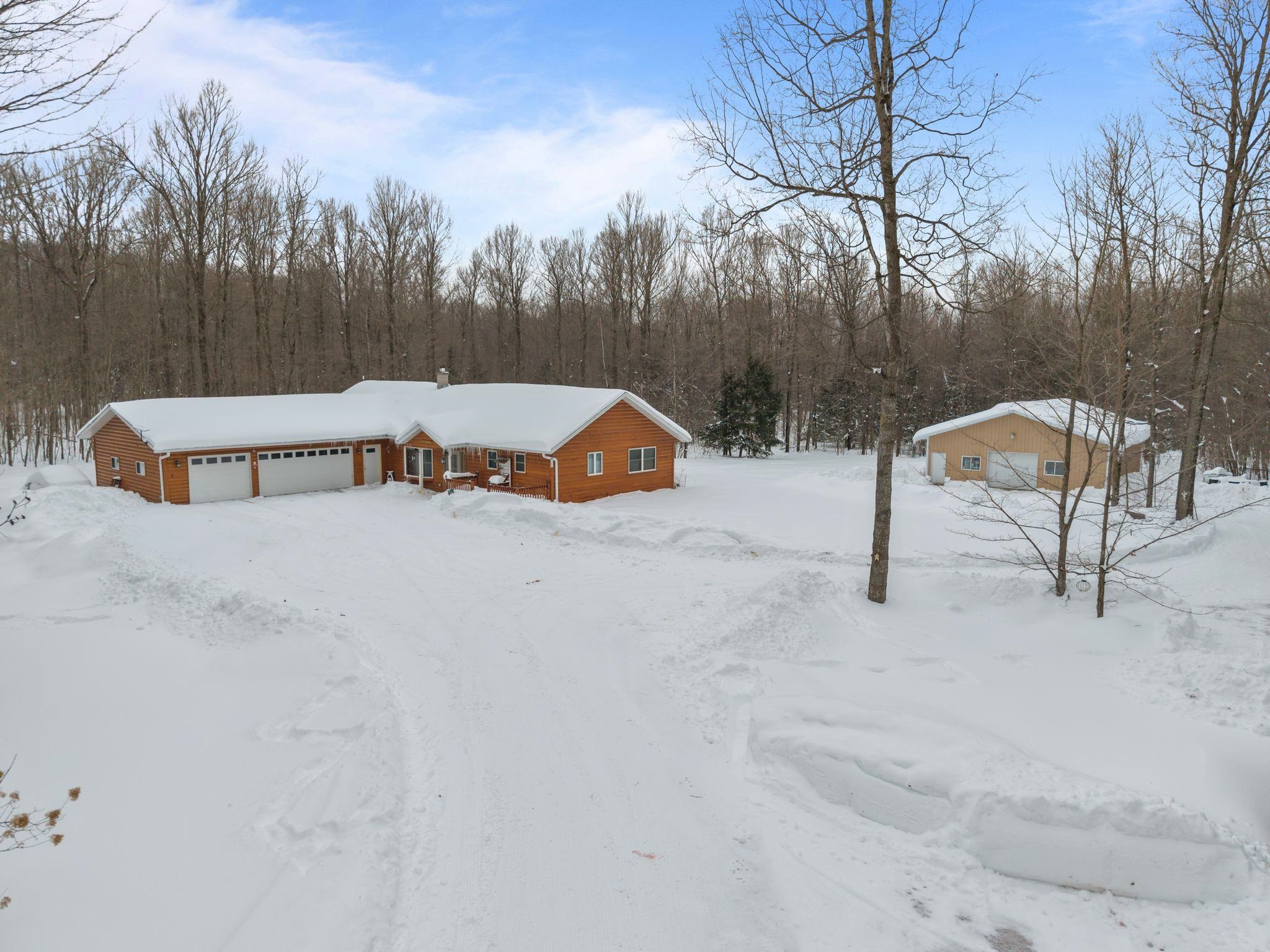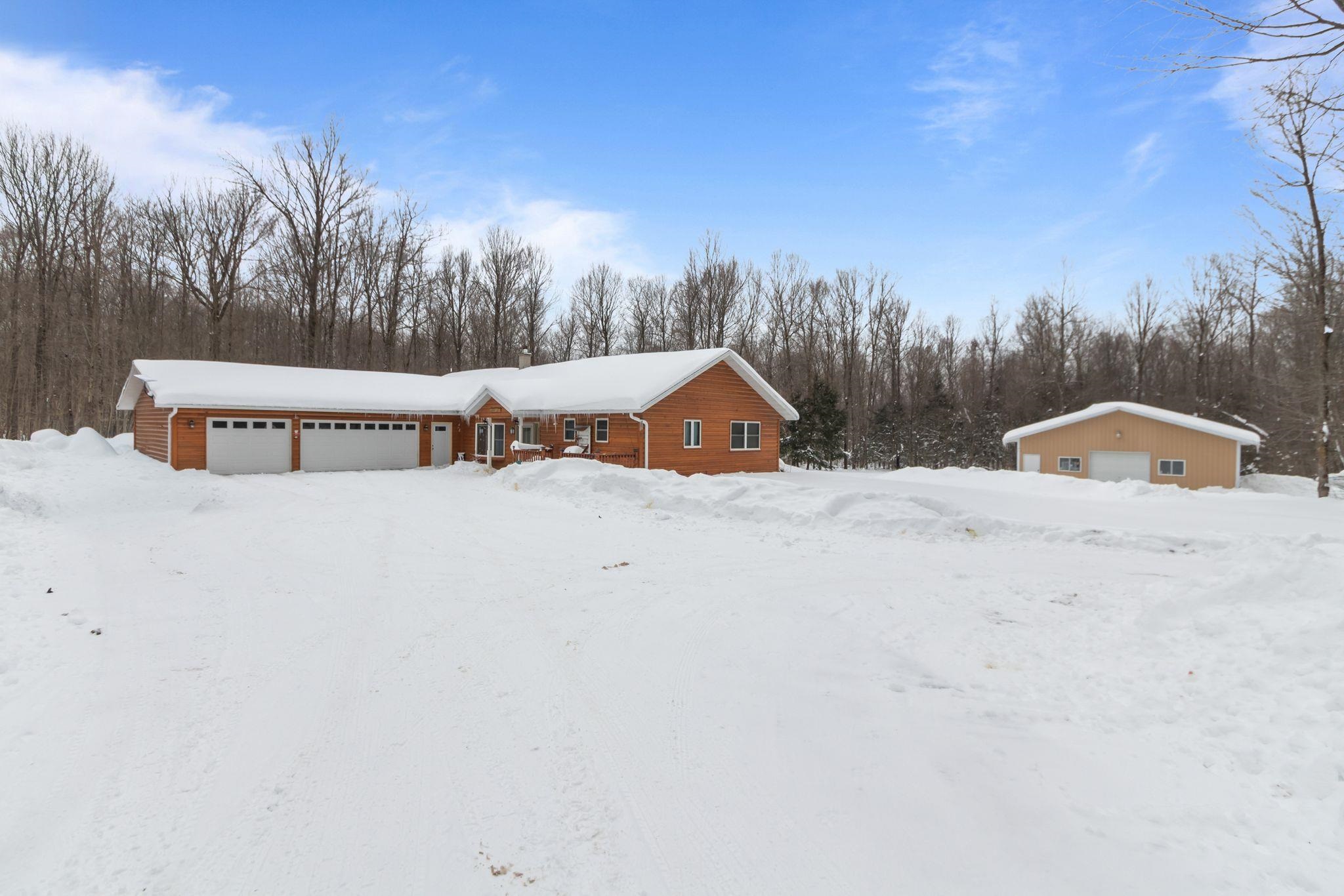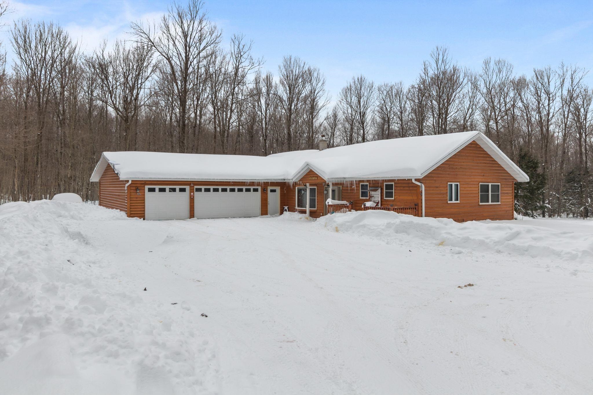 Beautiful secluded custom-built home on nearly 20 wooded acres- hung on your own land! Spacious kitchen and dining area with cathedral ceilings, staggered cabinetry, and large pantry. Enjoy the large deck with access from kitchen and sunroom. Four-seasons sunroom with French doors and pellet stove. Primary suite with double sinks, jetted tub, and walk-in closet. Full basement with 9 ft ceilings, partially finished-easy to expand living space. Wood burner primary heat with LP backup. 36x48 drive-through garage with two 24x13 horse stalls plus ample storage.
