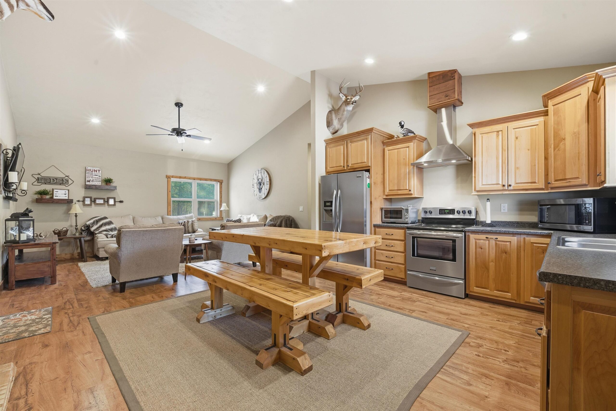 Located near Prime Hunting Area. Custom built ranch situated on 2+/- acres in the Heart of Tigerton. Open concept with spacious living room and eat-in kitchen with custom cabinets and full appliance package plus a reverse osmosis system. 4 spacious bedrooms and 2 full baths. In floor heat throughout. Attached heated garage with concrete parking area, main floor laundry room includes washer and dryer and a scent free room for all your hunting items. Area behind cabin with potential for food plot. Covered front porch area with full landscaping and firepit area. Septic system rated for 3 bedroom. LP tank leased. Listing Agent has an ownership interest in the property.