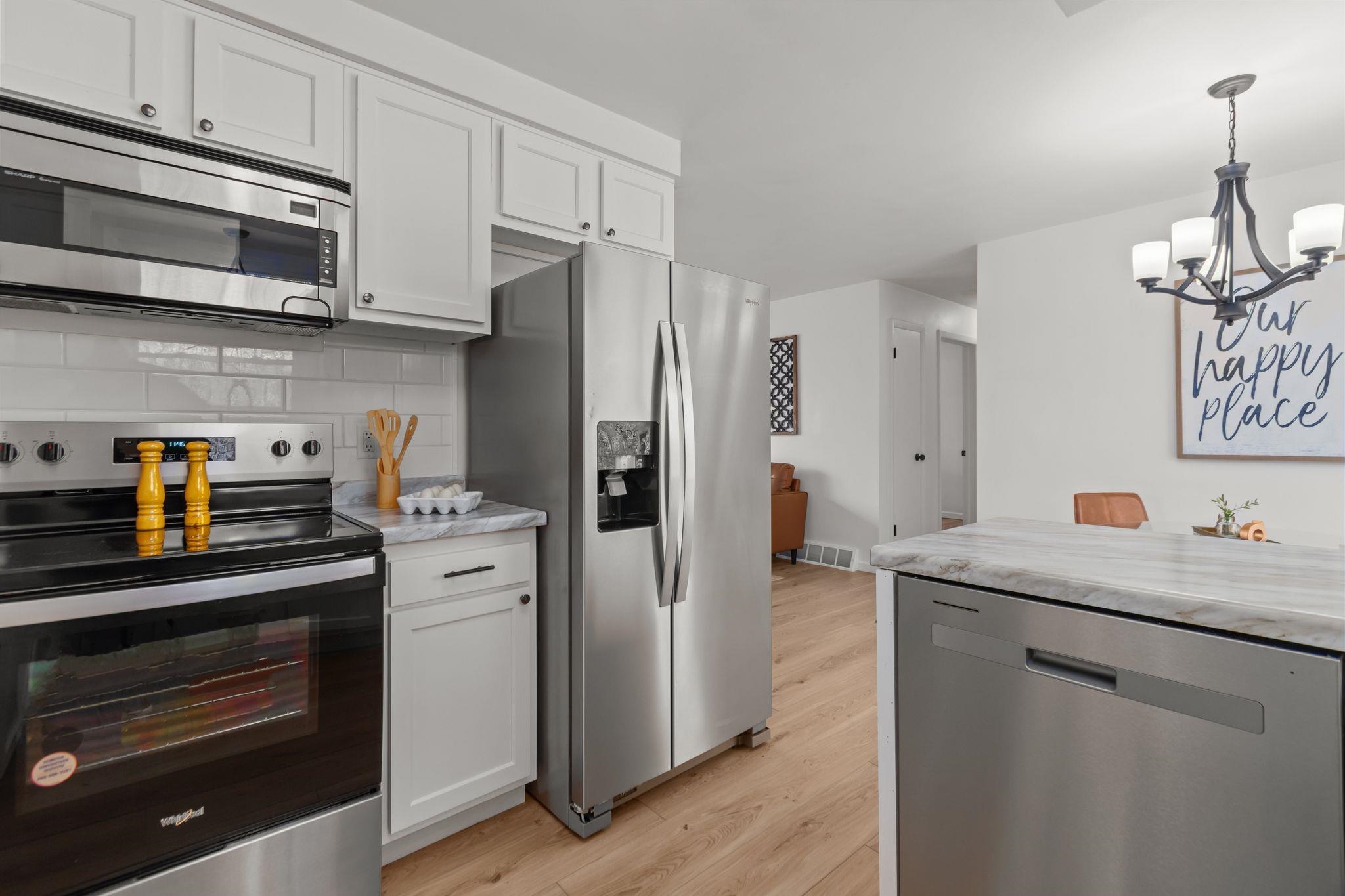 oven/range, refrigerator, dishwasher, microwave/watersoftener, work benches and cabinets in garages