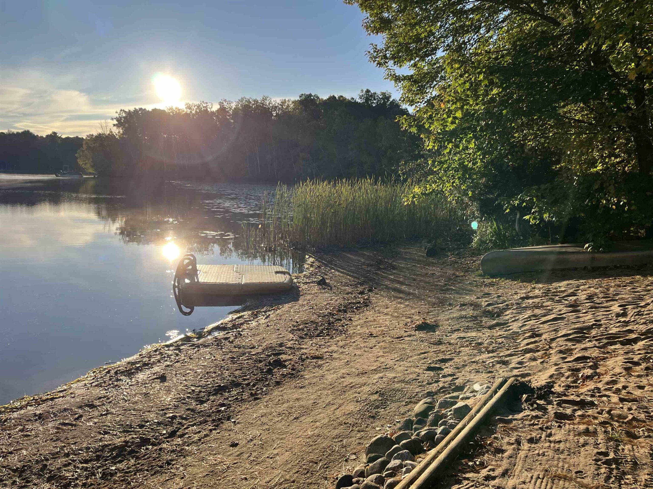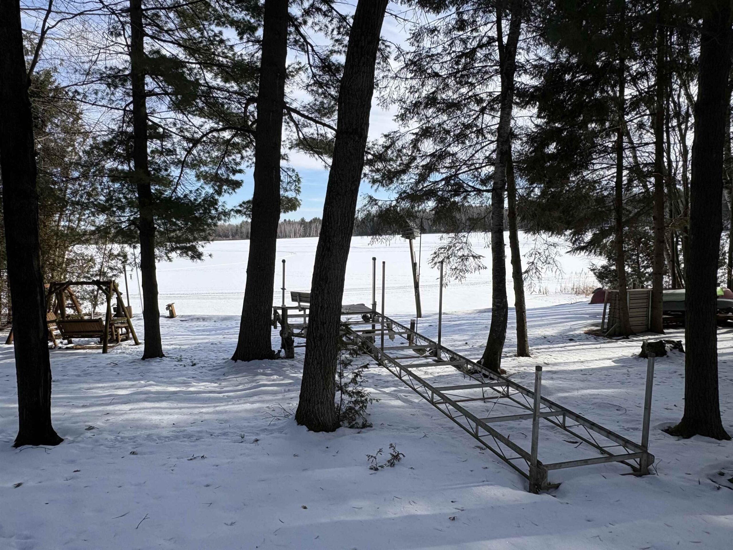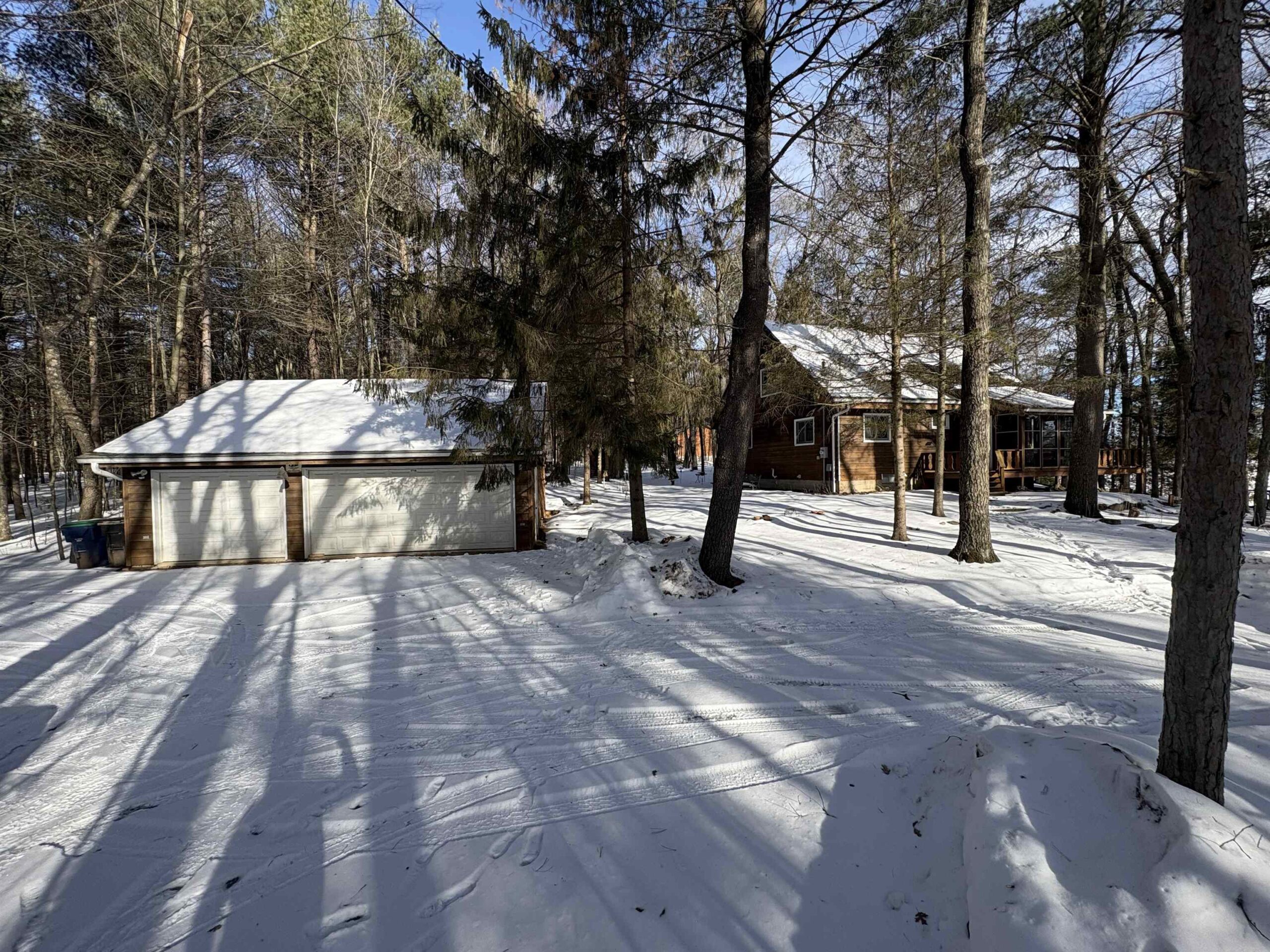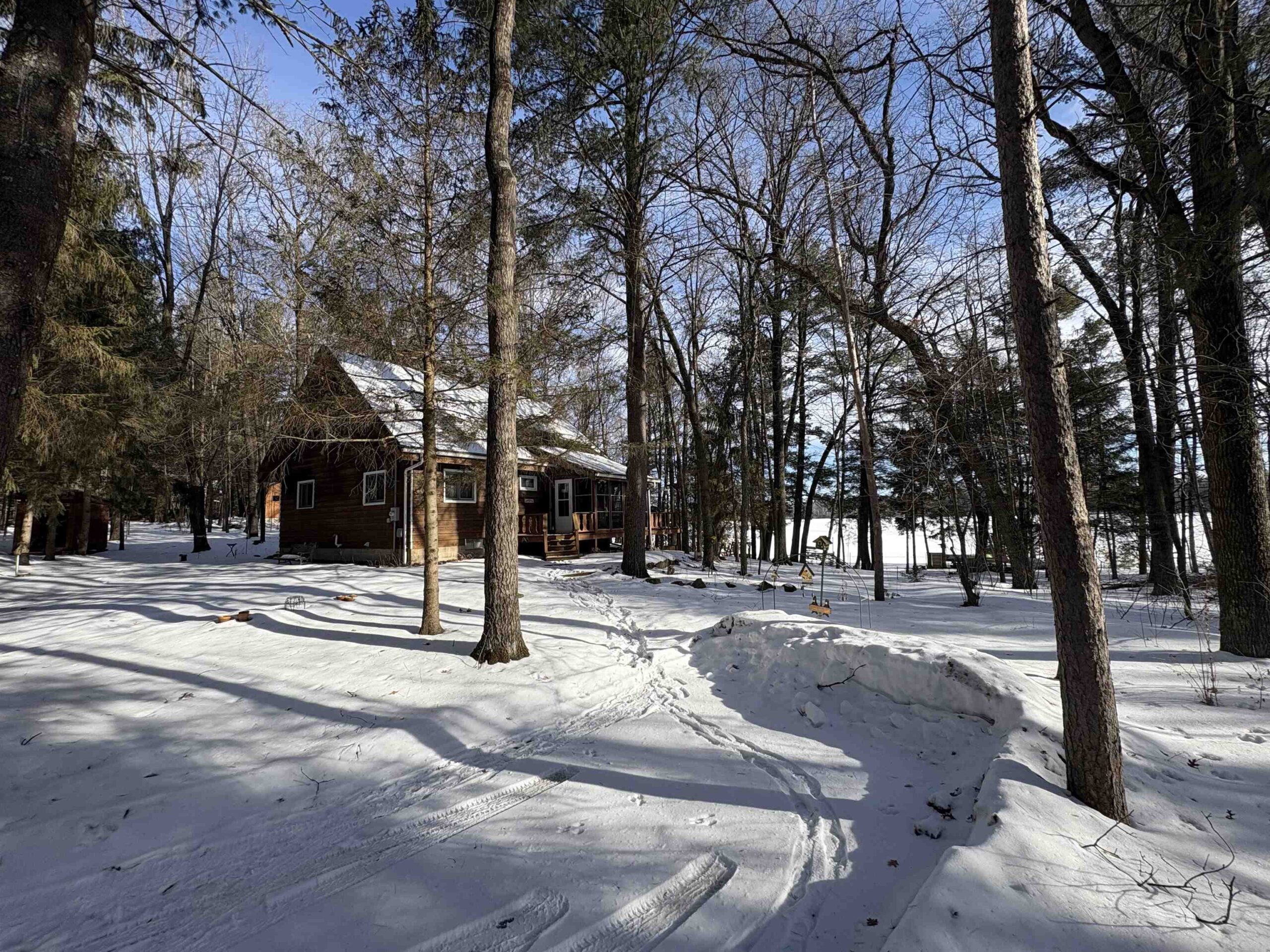 Picturesque Chalet style home located on Legend Lake. A unique package deal, this gorgeous lake home includes 2 lots combining for approximately 1.1 acres, & a sprawling 174 feet of lake frontage! You'll be blown away by the beautiful wooded setting, w/ amazing overall views of the water & stunning sunrises for years to come. Shoreline boasts a nice sandy frontage for you to relax & enjoy the water. Home features 3 bedrooms, 2 full bathrooms, & a finished bsmt area (walls are painted concrete). Views of the lake from the kitchen & living room area, which feature a cathedral ceiling & a beautiful masonry wood fireplace. Small screen porch leads to a waterfront deck out front. Detached 3-car garage for your convenience. Home has A/C. Potential to sell lots separately. An absolute must see!!