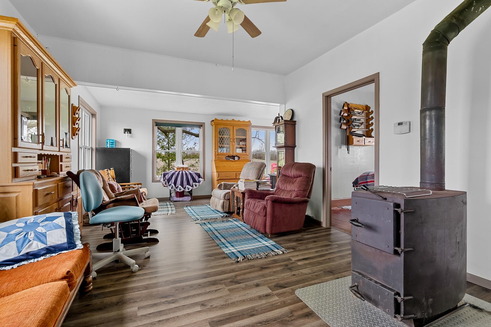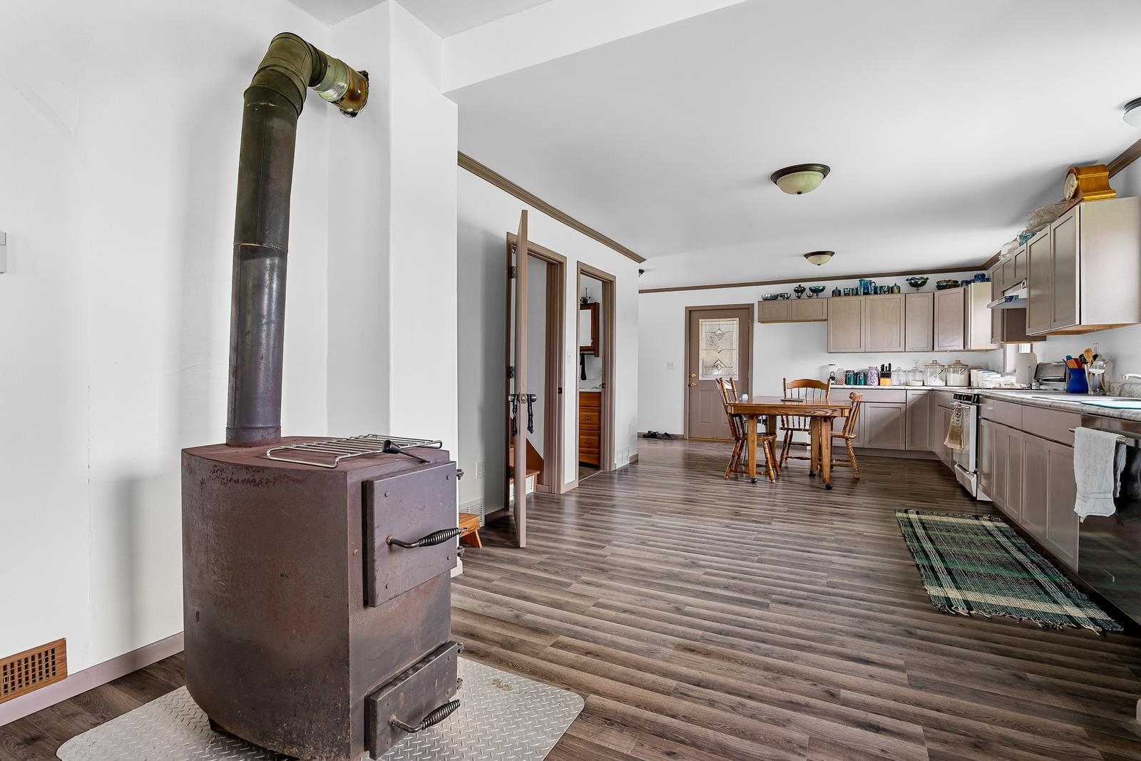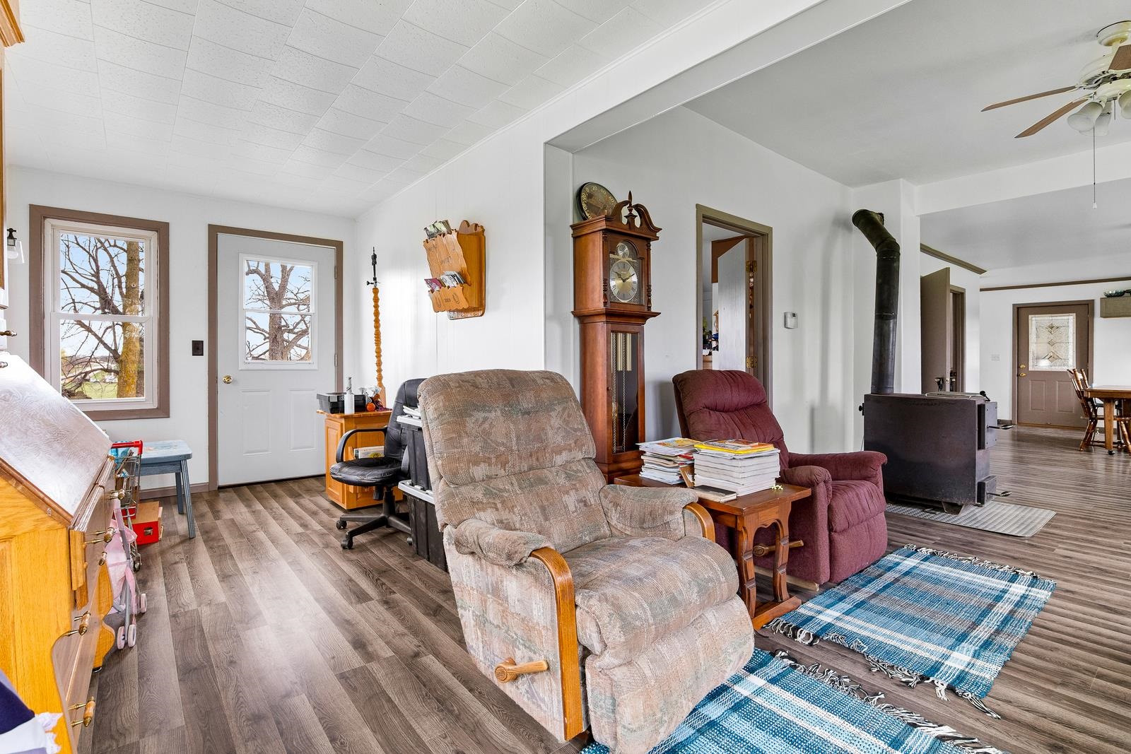 heat/smoke detectors, wood stove in LR