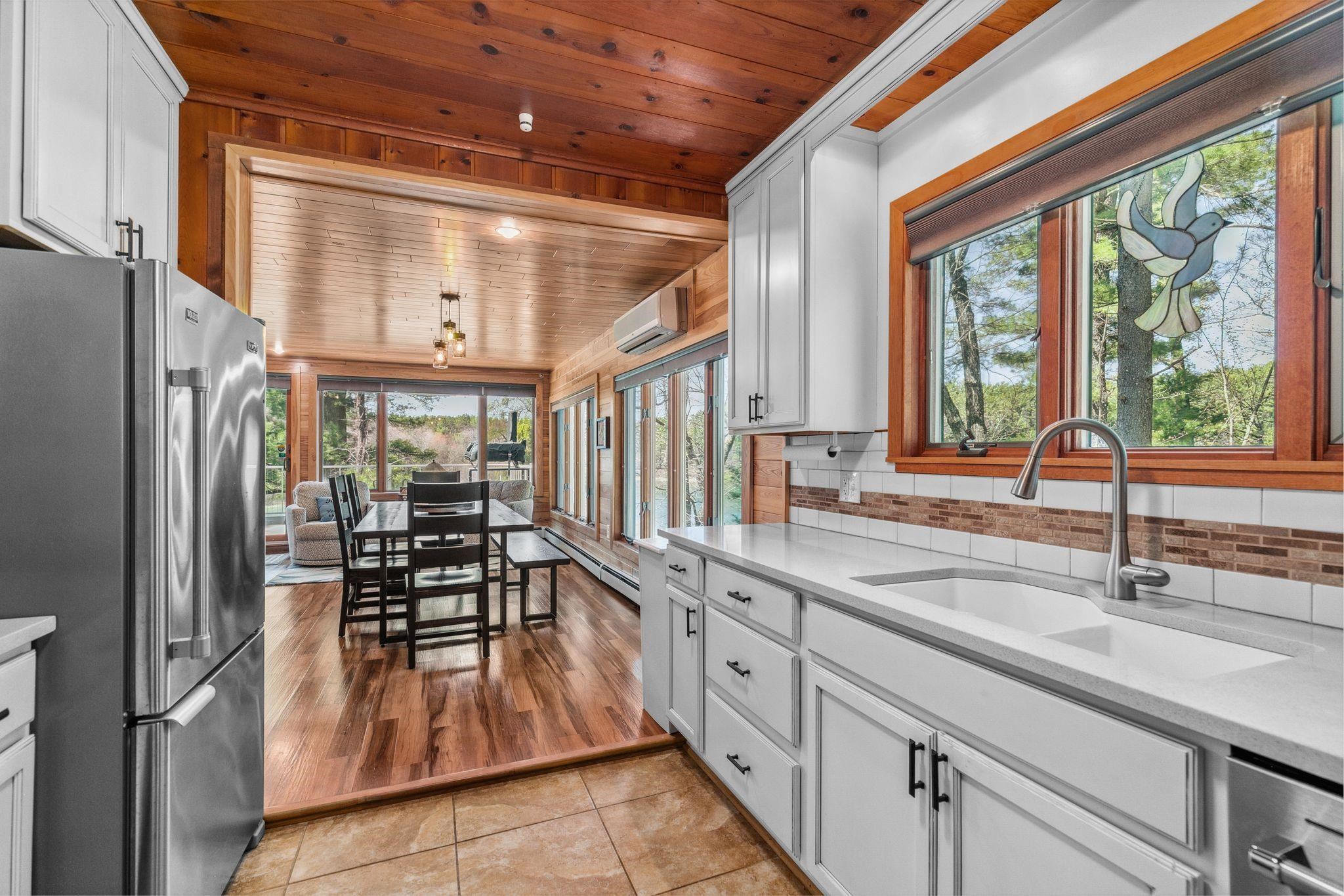 Experience refined lakeside living in this exquisitely remodeled 3-bedroom, 3-bath residence offering 2,110 sq ft of elegant space with captivating views. Rich COREtec flooring and a beautifully curated interior create a seamless blend of sophistication and comfort. The serene primary suite features a walk-in closet, while 447 sq ft above the garage offers a perfect guest retreat or executive office. Enjoy year-round comfort with two mini splits upstairs and one on the main level for cooling. Indulge in premium amenities including heated garages and a whole-house generator. Set on Marl Lake, surrounded by expansive Hartman State Park—where no vacant lots remain and homes have graced the shoreline for a century—this rare offering includes negotiable furnishings and sauna.