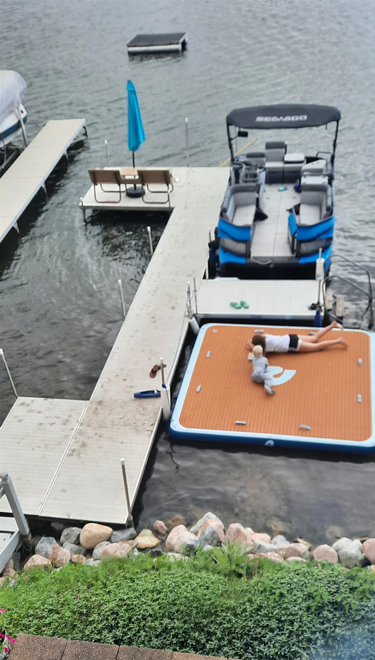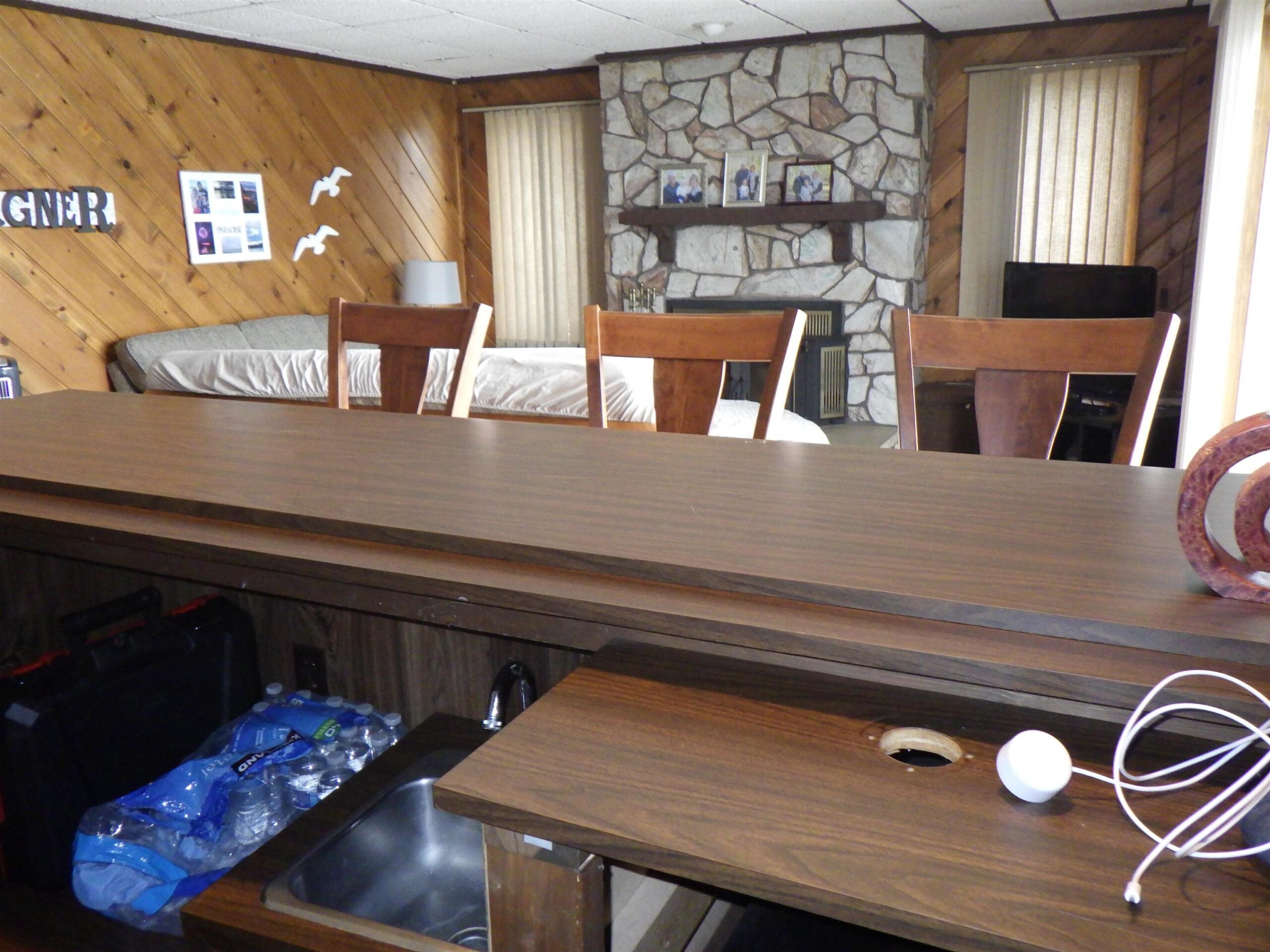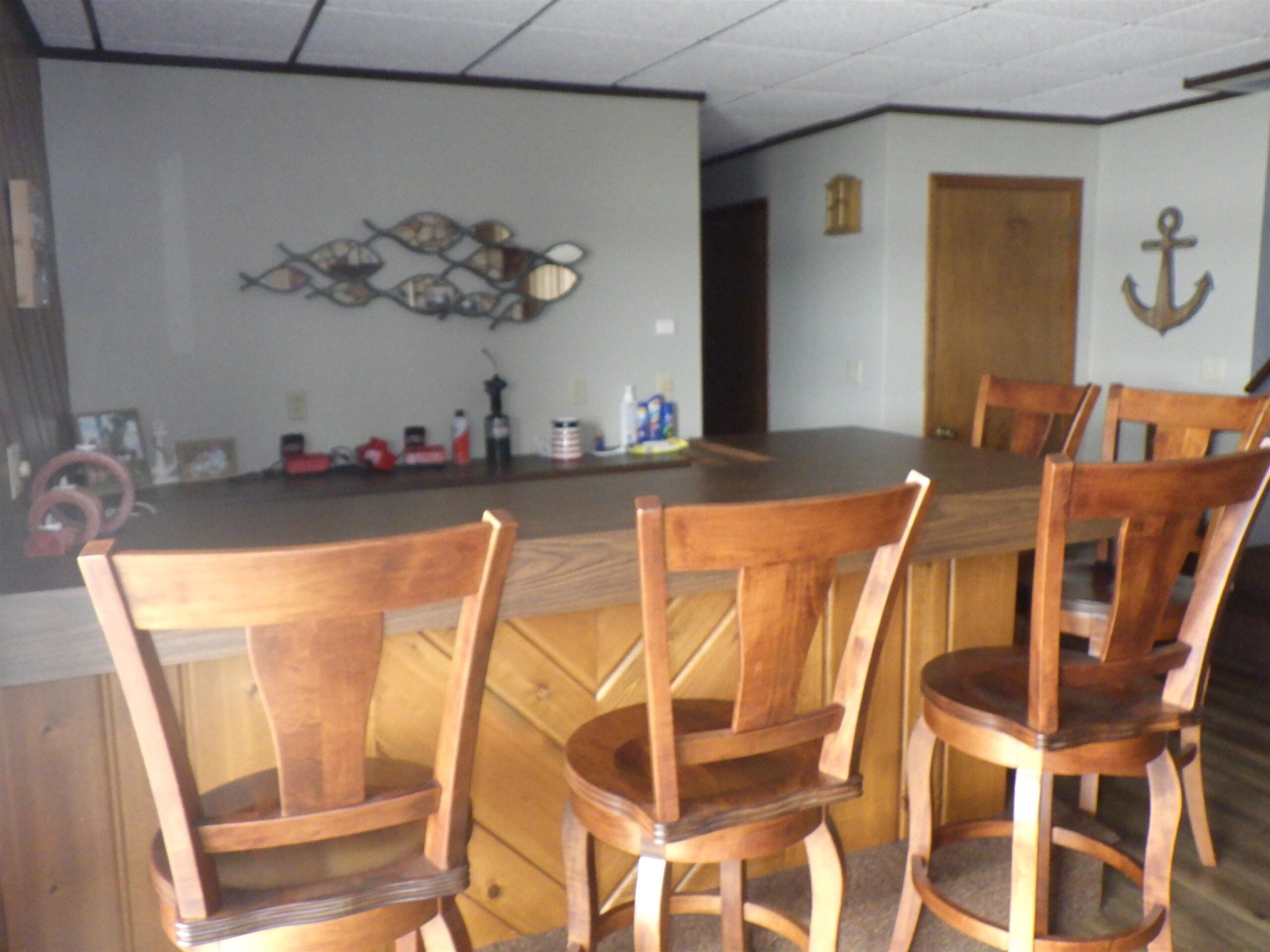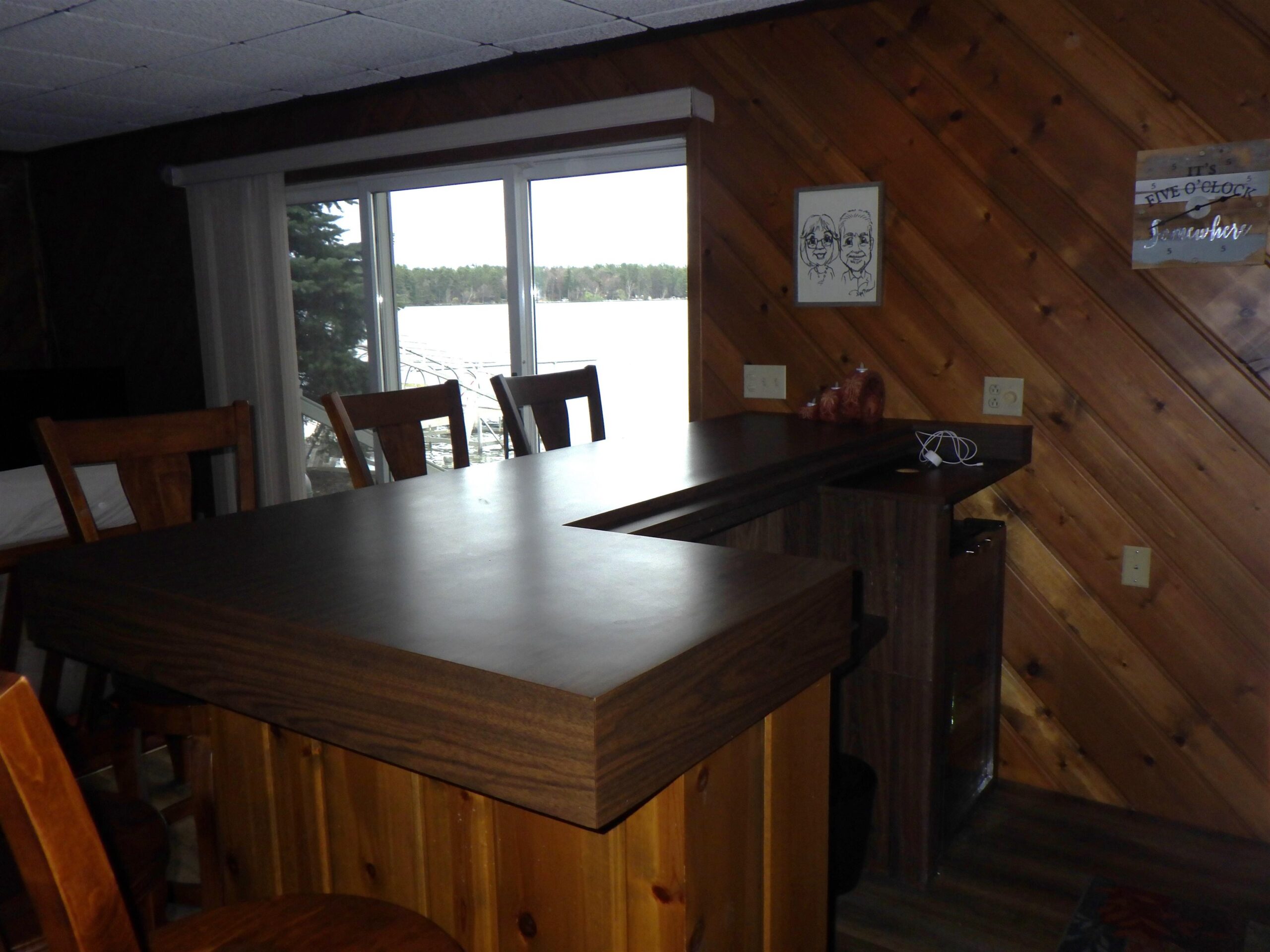 40 ft dock, stove, refrigerator, microwave, dishwasher, washer, dryer, hot tub, bar fridge, chairs around stand in kitchen, bar stools in basement