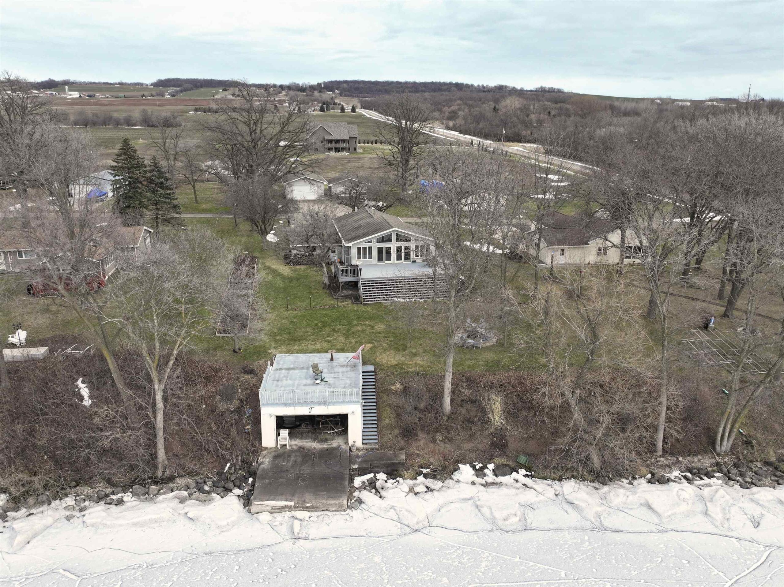 Looking for the perfect year-round lake house with so much more? 120 feet of water frontage, boathouse and pier to watch the sunset, boat landing at the end of the road, wrap around deck with a beautiful view, 1 attached 2 car garage and two additional garages with 6 extra car spaces. Unfinished room is a utility room. This is the home for you in the perfect area. Be the first to make this yours.
