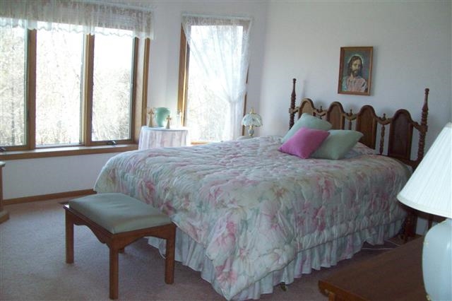 Energy efficient home, solar heat and wood fueled stove, panoramic views, basement is finished in equal quality as main level includes second kitchen third bedroom bath and family room, multi level storage loft in garage, and storage building with full basement main kitchen built-ins. reluctant sellers willing to consider offers. Large living room with vaulted ceiling and fireplace. Basement and main level kitchens. Quality construction built by current owners no detail neglected. Mins. from I 90/94 access.