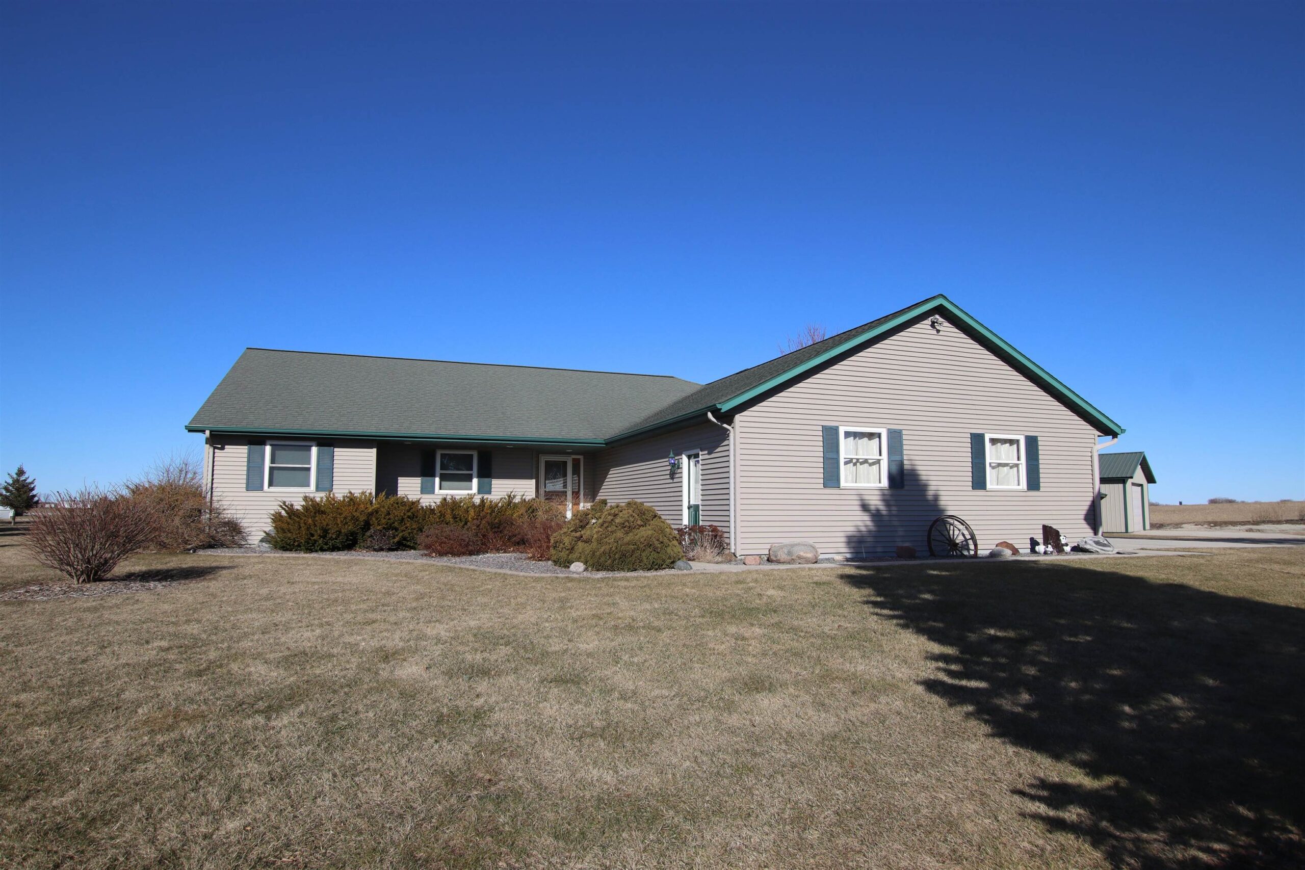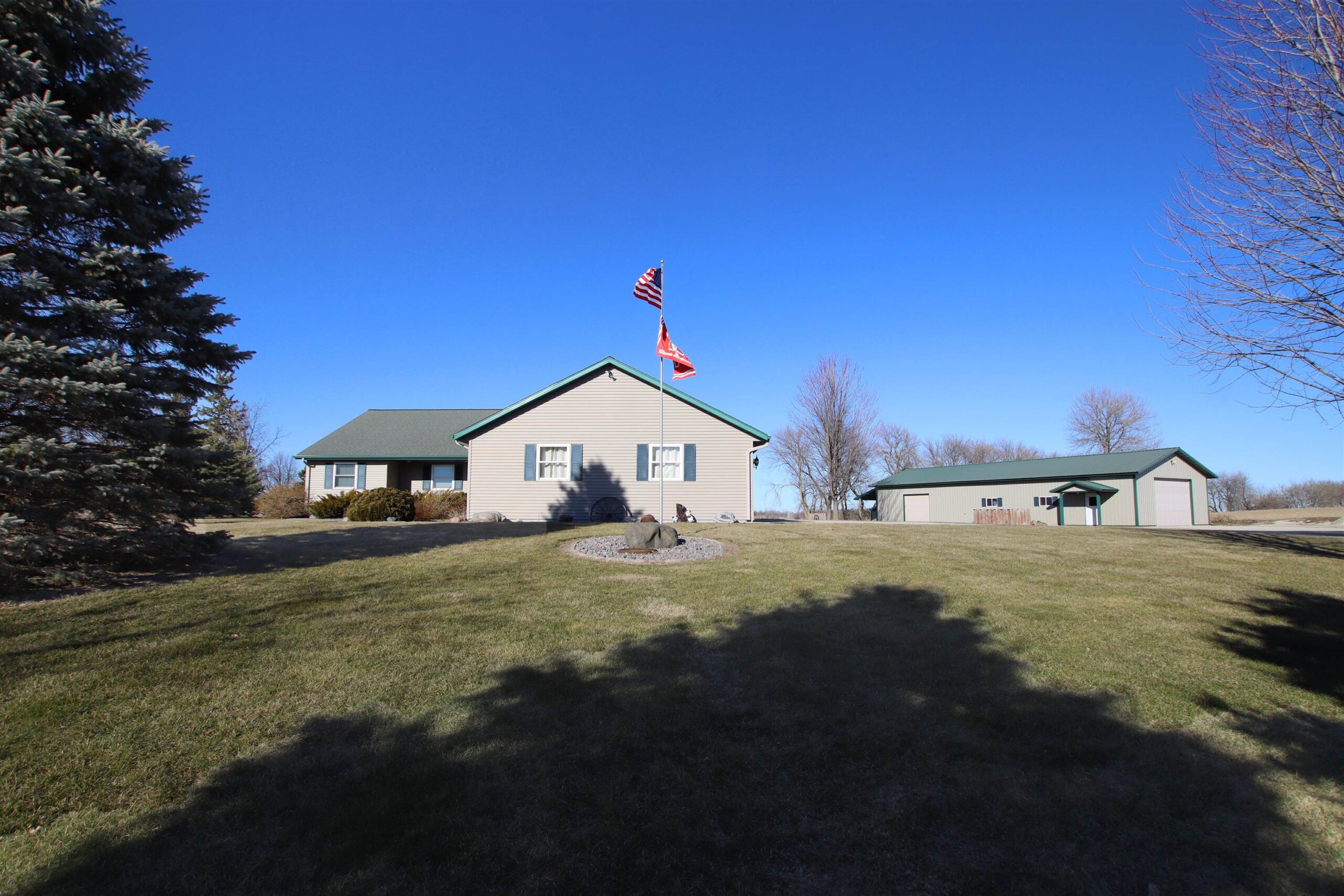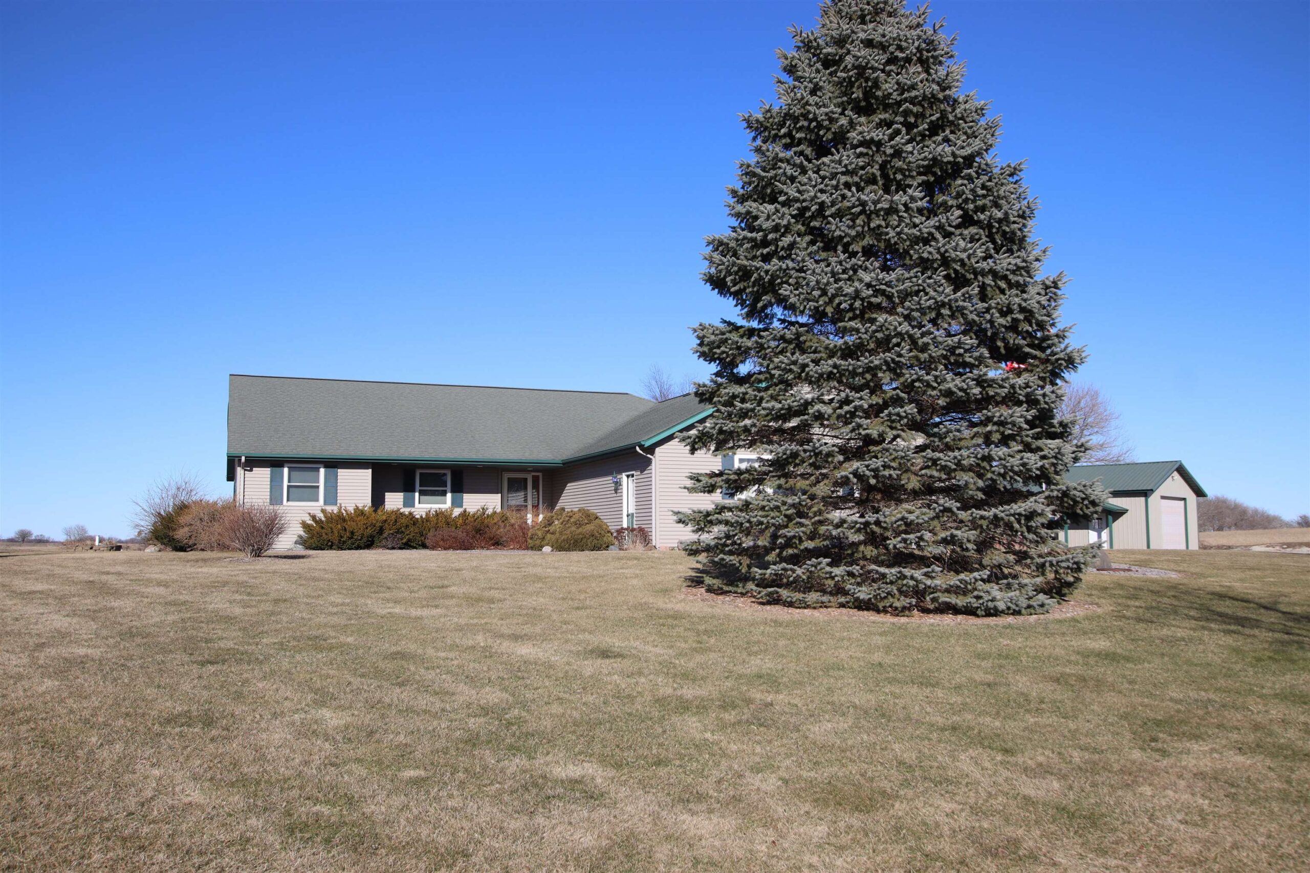 Go Country with this 1,712 sq ft with 70x30 Pole Shed overlooking appx 14.12 acres of land. Featuring 3 bedrooms, 2.5 bathrooms, a spacious living room with vaulted ceilings, arge kitchen & main floor laundry. Attached 3-car garage is insulated, drywalled, & painted, including a short stall of 12x12. Full Basement has a walk up to the garage, 9ft ceilings, a canning kitchen w/ cabinets & gas stove. Pole Shed is partially finished insulated & wood-sheathed, w/ in-floor radiant heat currently disconnected from the outdoor wood furnace. Home is currently heated/cooled with LP Gas. The shed also features a 10 ft overhead door & is separated into two interior areas by a 7 ft interior overhead door. Farmer pays annual Crop Year Lease on appx 9 acres of land. Simply enjoy the privacy & space!