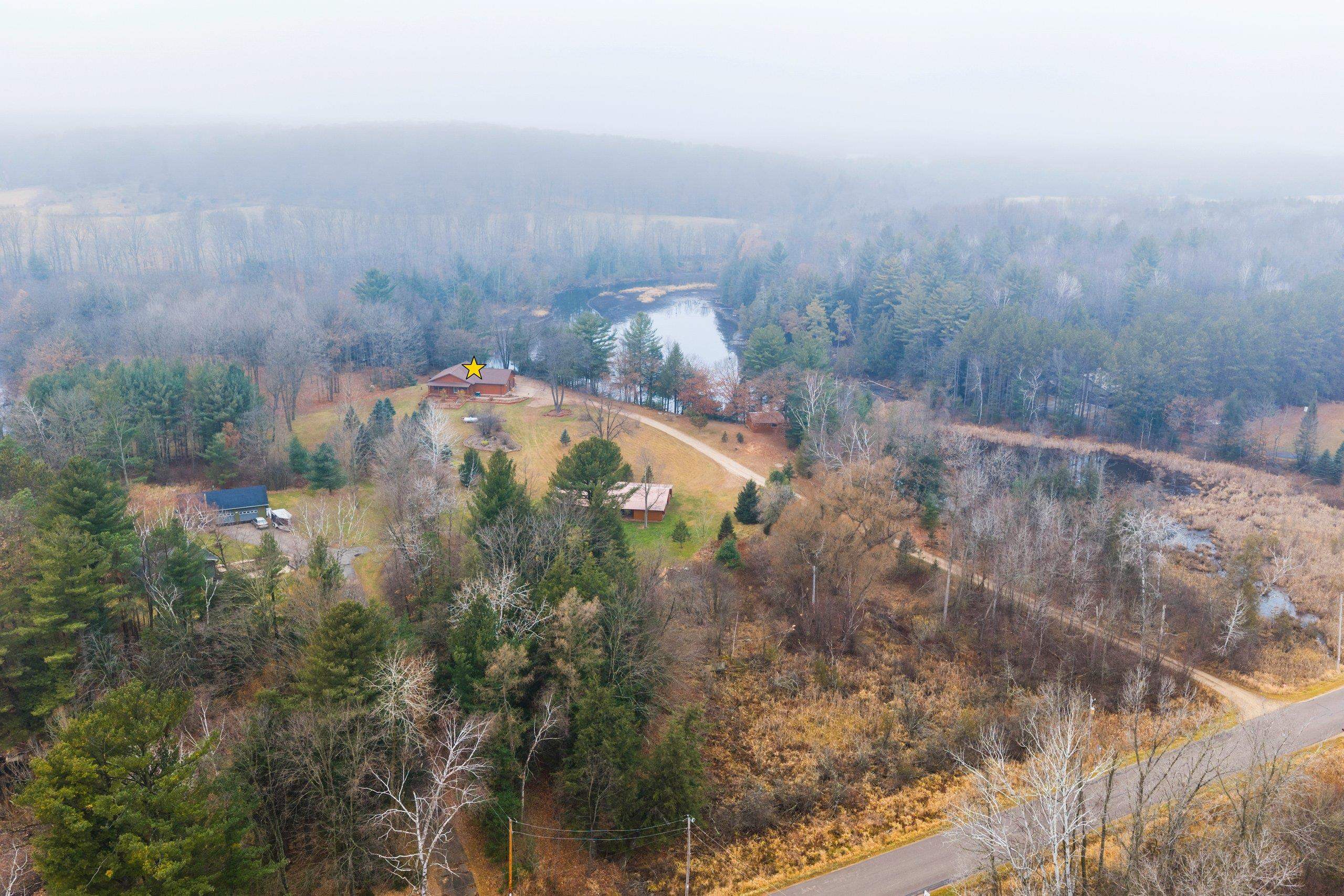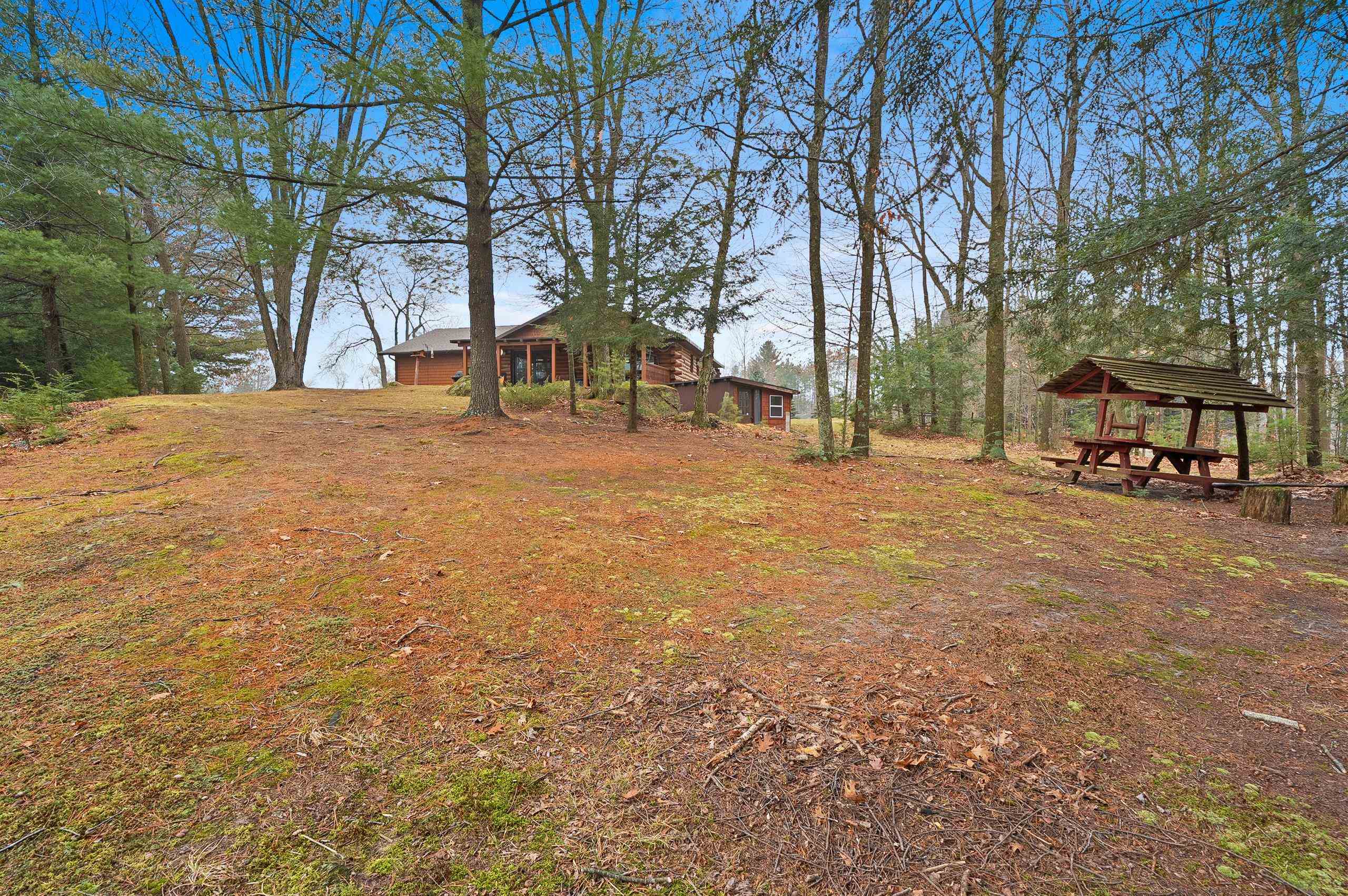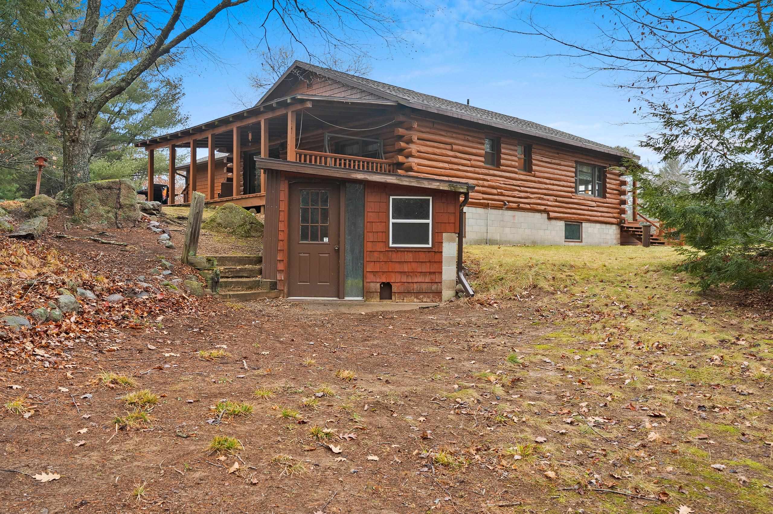 Enjoy Mother Nature from this secluded log home on 11 acres on a picturesque peninsula on Tilleda Pond with over 1,500' waterfront. This home offers over 2,300 sq ft featuring open concept living, cathedral T&G ceilings, 3 bedrooms, 3 1/2 baths, office space, main level laundry, large covered porch off the dining area, 2 1/2 stall finished garage and other garage/storage areas including 9'x24' lower level attached garage/workshop with walk-out, 24'x30' finished shop and a 40'x70' storage shed.