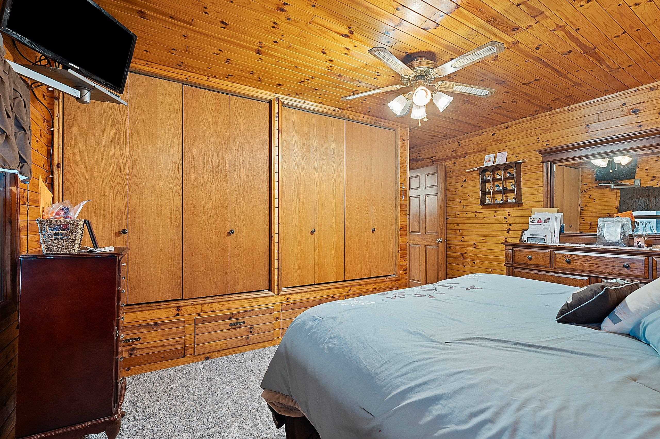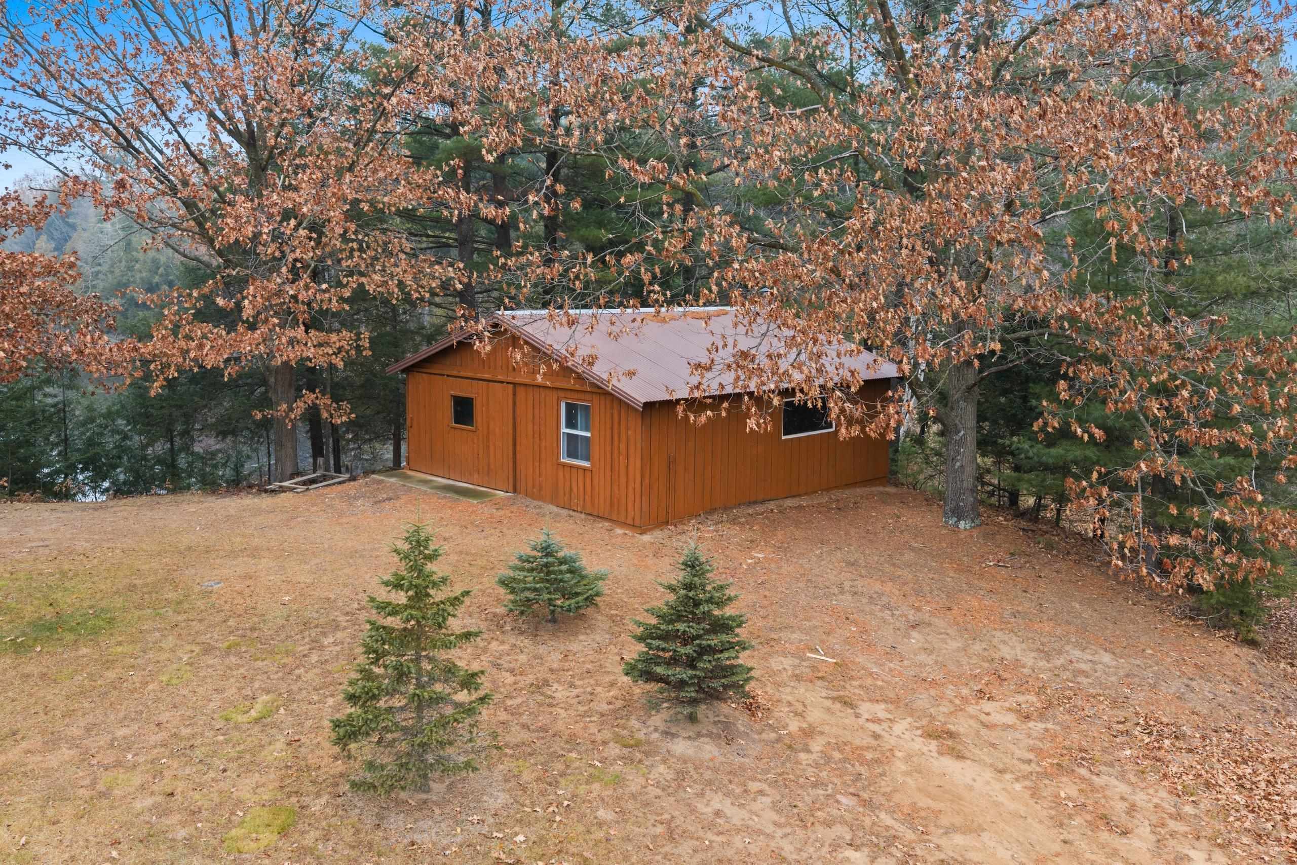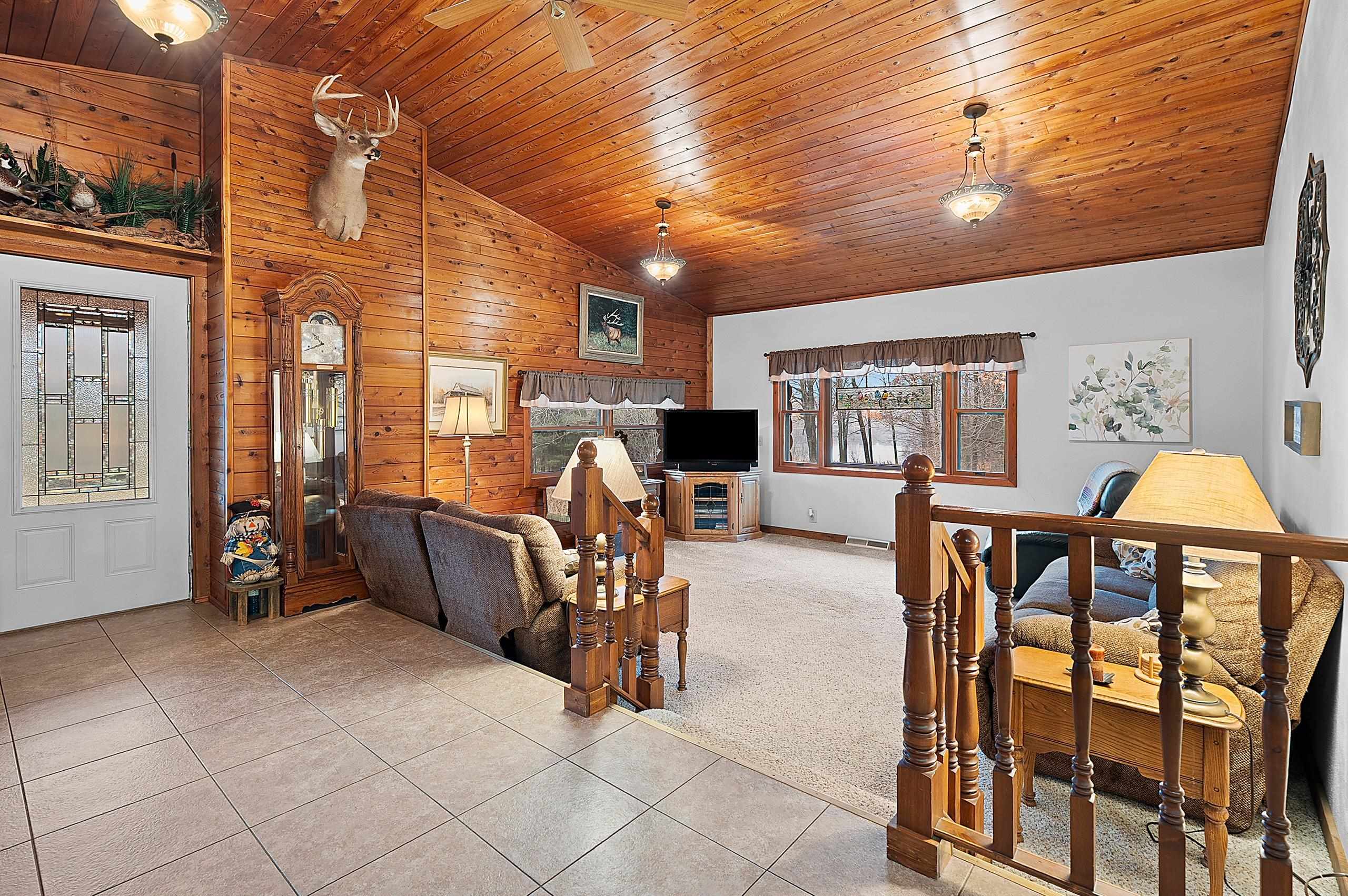 Enjoy Mother Nature from this secluded log home on 11 acres on a picturesque peninsula on Tilleda Pond with over 1,500' waterfront. This home offers over 2,300 sq ft featuring open concept living, cathedral T&G ceilings, 3 bedrooms, 3 1/2 baths, office space, main level laundry, large covered porch off the dining area, 2 1/2 stall finished garage and other garage/storage areas including 9'x24' lower level attached garage/workshop with walk-out, 24'x30' finished shop and a 40'x70' storage shed.
